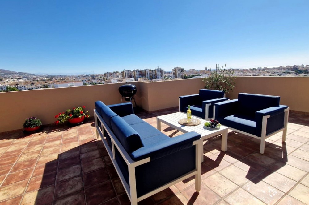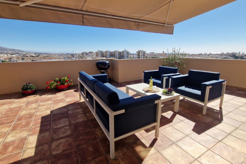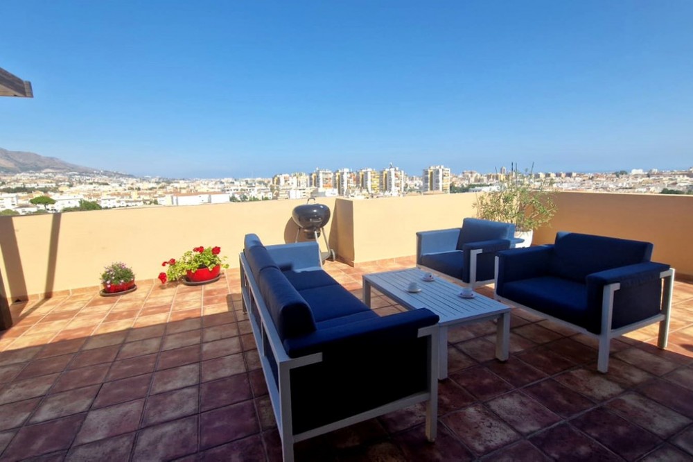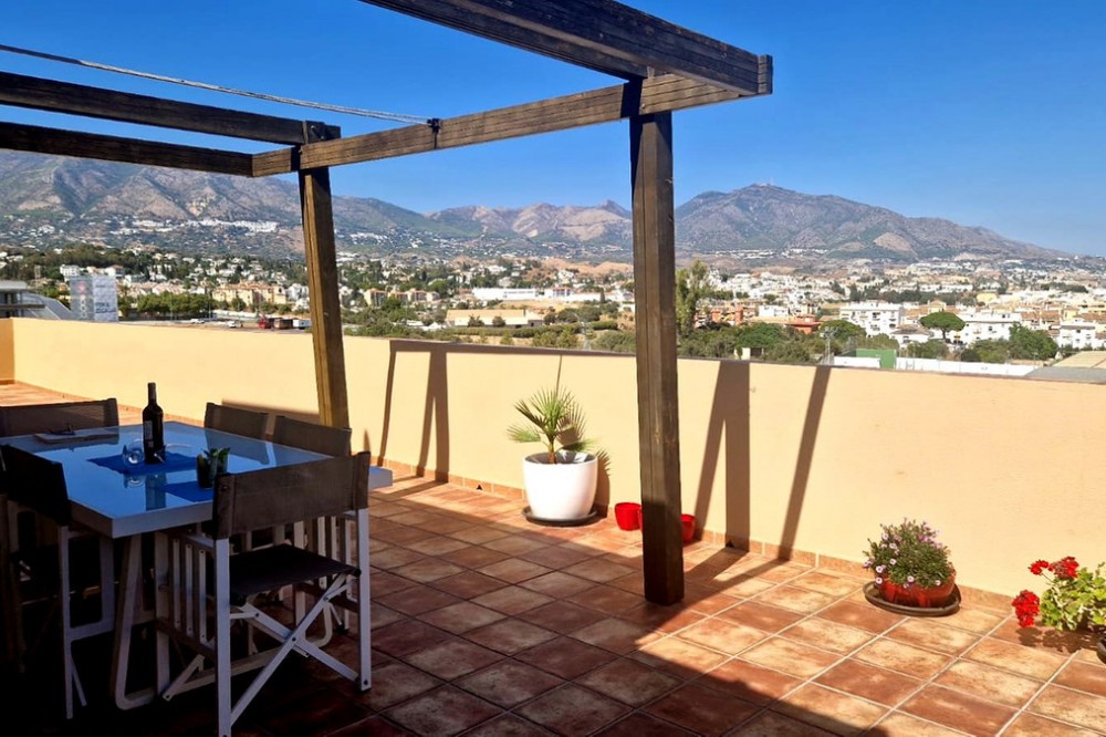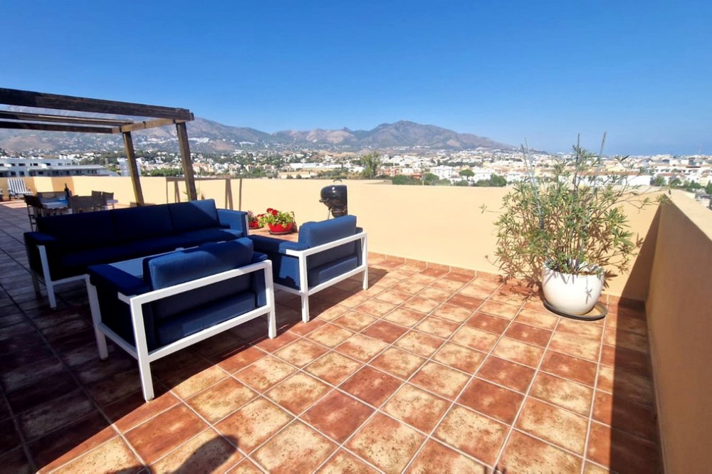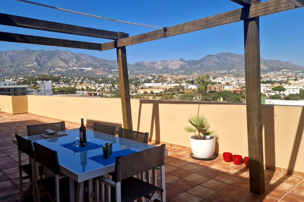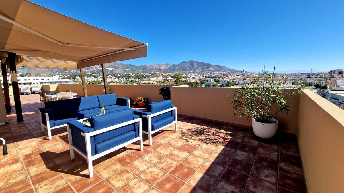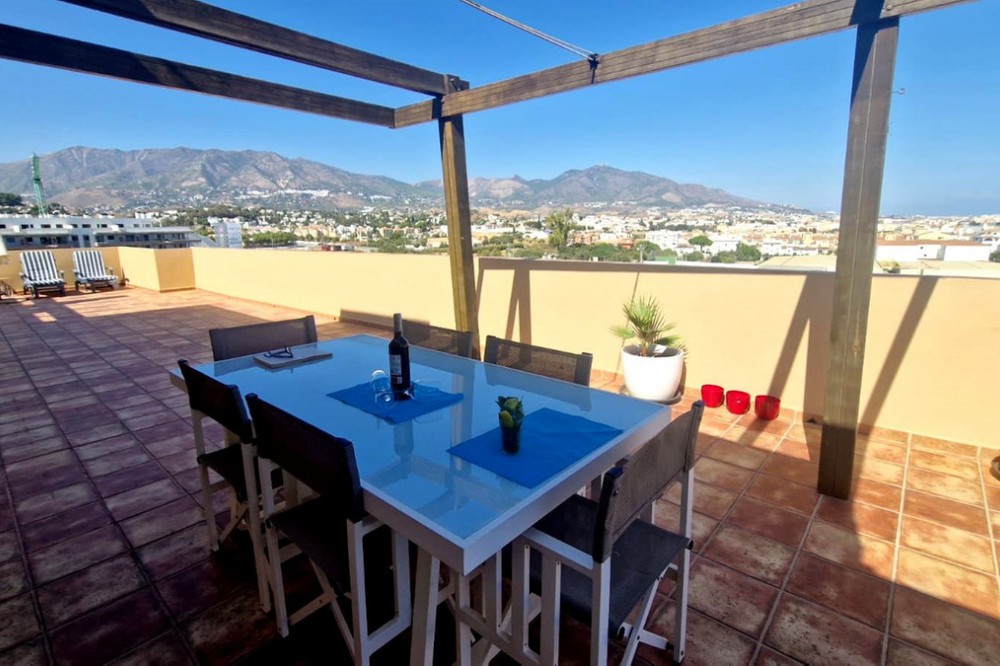 - Luxury Penthouse with Private Lift & Panoramic Wrap-Around Terrace – Mijas Costa Step into luxury with this stunning penthouse offering private lift access and a spectacular wrap-around terrace of 187 m², providing sun all day and breathtaking panoramic views of the sea, mountains, and surrounding area. The interior features a modern fully fitted kitchen, a separate dining area, and a spacious lounge with fireplace that opens directly onto the terrace. There are 3 double bedrooms and 2 bathrooms, including a master suite with en-suite bathroom and a private sauna. Designed for comfort and style, the property combines elegant finishes such as marble and wood flooring with all modern conveniences. This exceptional home includes a large enclosed private garage, with space for multiple vehicles, and is set within a gated community with communal pool and sunbathing lawns. Offered mostly furnished (with only a few personal items excluded), it is ready to enjoy immediately. Key Features: Private lift access directly into the penthouse 3 Double bedrooms | 2 Bathrooms (one en-suite with sauna) 147 m² built + 187 m² wrap-around terrace with all-day sun Spacious lounge with fireplace + separate dining room Panoramic sea, mountain & urban views Large private garage with multiple parking spaces Gated complex with pool and green areas Quality finishes: marble & wood floors, double glazing, air conditioning A rare opportunity to own a one-of-a-kind penthouse that truly has it all—space, privacy, views, and luxury living in Mijas Costa. Penthouse, Mijas Costa, Costa del Sol. 3 Bedrooms, 2 Bathrooms, Built 147 m², Terrace 187 m². Setting : Town, Commercial Area, Close To Shops, Close To Schools, Urbanisation. Orientation : North, East, South. Condition : Excellent. Pool : Communal. Climate Control : Air Conditioning, Fireplace. Views : Sea, Mountain, Panoramic, Urban. Features : Lift, Fitted Wardrobes, Near Transport, Private Terrace, Solarium, Sauna, Ensuite Bathroom, Wood Flooring, Access for people with reduced mobility, Marble Flooring, Double Glazing. Furniture : Fully Furnished. Kitchen : Fully Fitted. Security : Gated Complex, Entry Phone. Parking : Underground, Garage, More Than One, Private. Utilities : Electricity, Drinkable Water. Category : Holiday Homes, Investment, Resale.