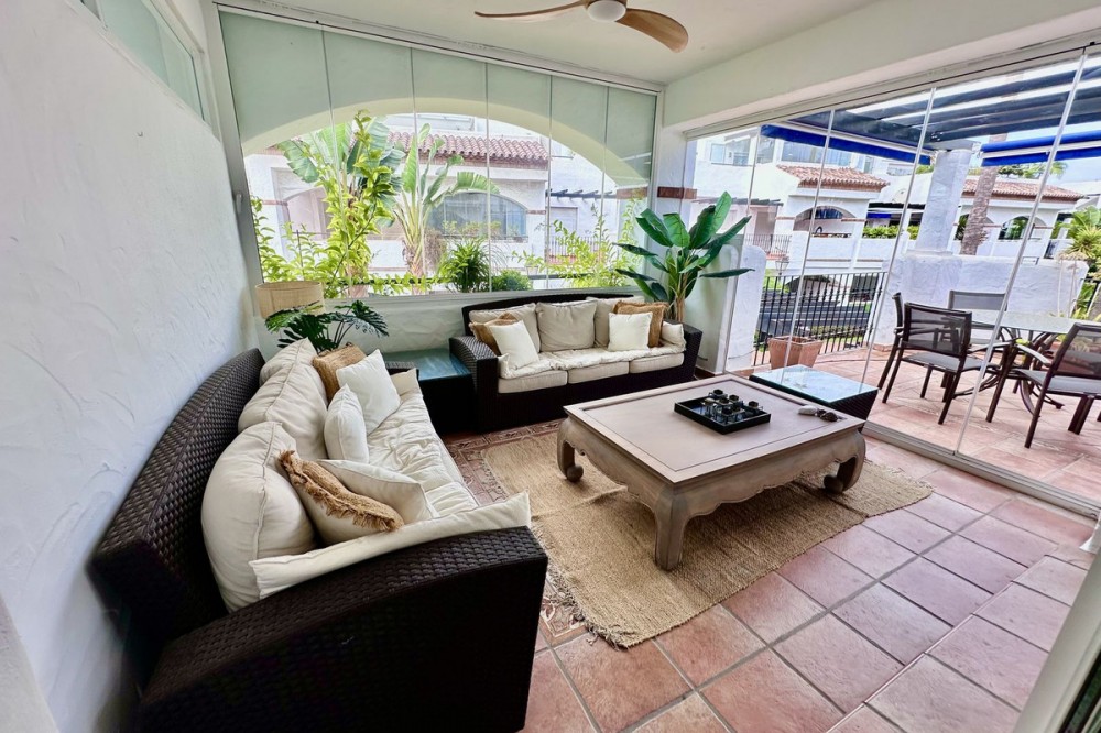 • Luxury Beachfront Apartment in San Pedro de Alcántara Discover this beautifully finished two-bedroom apartment in La Rada, an exclusive development of only 38 residences, located directly on the popular boulevard and the sandy beaches of San Pedro de Alcántara. Situated on the first floor, this apartment boasts a prime position with a southwest-facing terrace and open views over the lush gardens. Thanks to the glass curtain system, the terrace can be partially enclosed, allowing you to enjoy it all year round – as an open lounge in summer and as an extra living room in the cooler months. Layout • Spacious entrance hall with double doors leading to the bright living and dining room • Fully fitted kitchen with separate utility area • 2 bedrooms with en-suite bathrooms, both with underfloor heating • Master bedroom with direct access to the terrace • Second bedroom with charming Juliet balcony and views of La Concha mountain Extras & Features • Underground private parking space included • Communal swimming pool and gardens • Lift and fully gated complex • Built in 2005 • Low running costs: Community €322 / month, Garbage €66 / year, IBI €1,100 / year This apartment combines comfort, luxury, and a prime location: just steps away from the beach, lively chiringuitos, and the boulevard, and only a short drive to Puerto Banús and Marbella. An ideal home for those wishing to live by the sea all year round, or for investors looking for a high-quality property on the Costa del Sol.