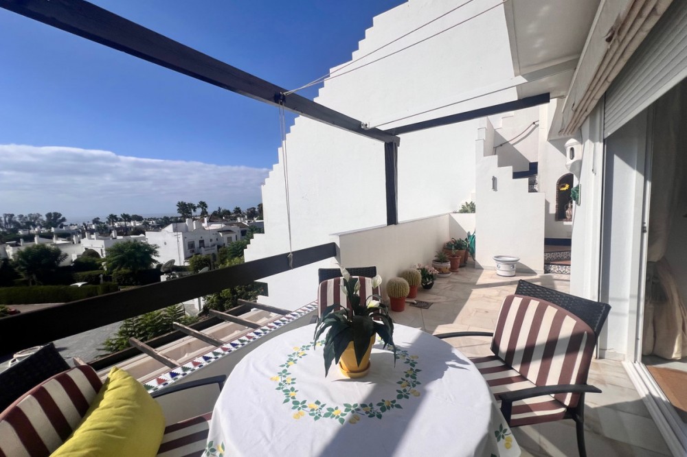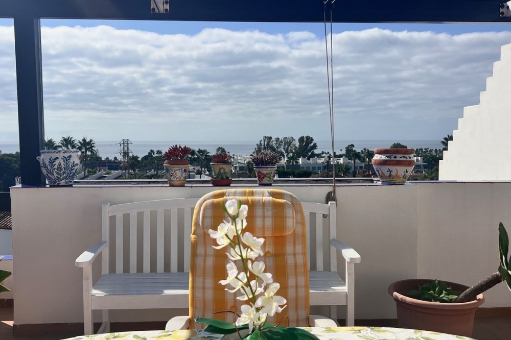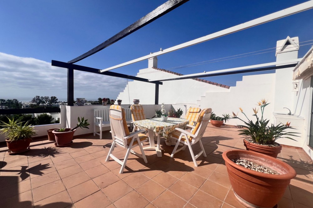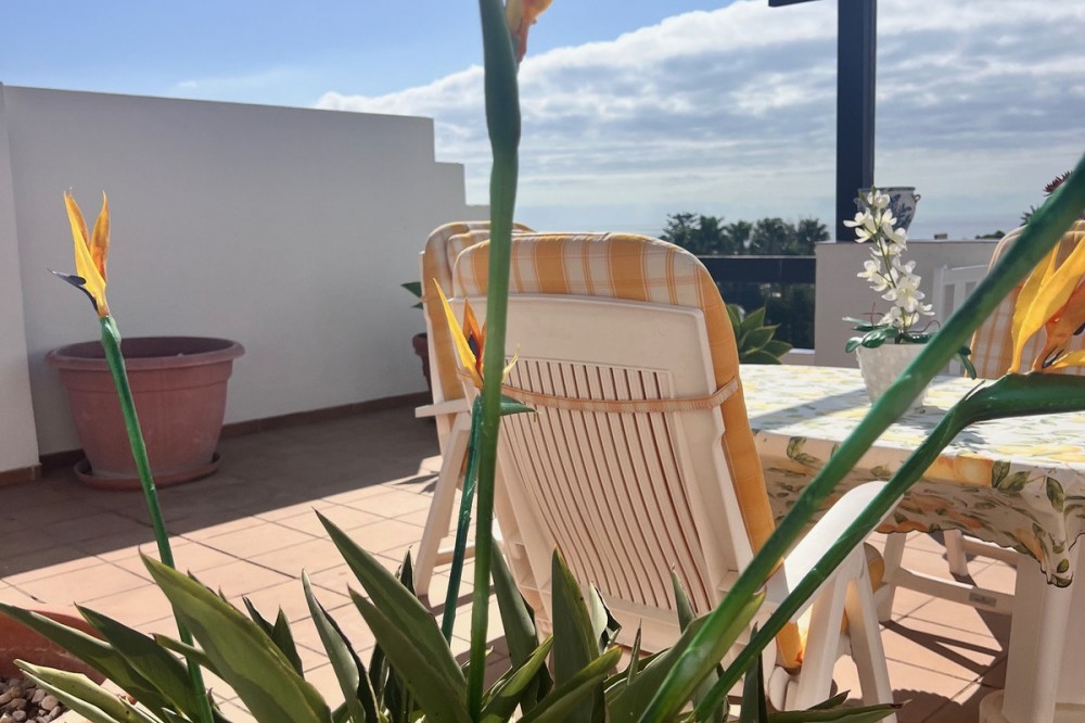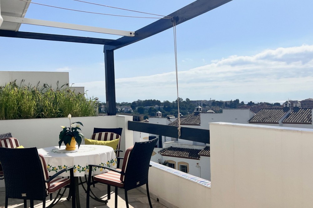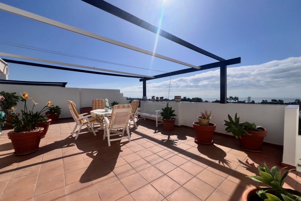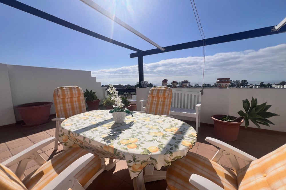 - This beautiful penthouse is located in the quiet and well-kept residence Las Jacarandas in Bel Air, within walking distance of supermarkets such as Mercadona and Lidl, and a short distance from Costalita beach. The house has a bright living room with direct access to a south facing terrace, from where you already enjoy a beautiful sea view. Via a staircase you reach the spacious roof terrace, where you will be treated to a spectacular panoramic view: on one side the Mediterranean and on the other the Sierra Bermeja and the iconic mountain La Concha. At this solarium there is also a practical storage room. The penthouse offers 2 bedrooms and 2 bathrooms, as well as a fully installed kitchen with access to a cozy terrace overlooking the lush communal gardens and pool. An underground parking lot is included. The residence is very quiet and security is provided in the evening. Holiday rentals are not allowed, making this the ideal place for those looking for peace, comfort and security, yet wanting to live close to all amenities.
