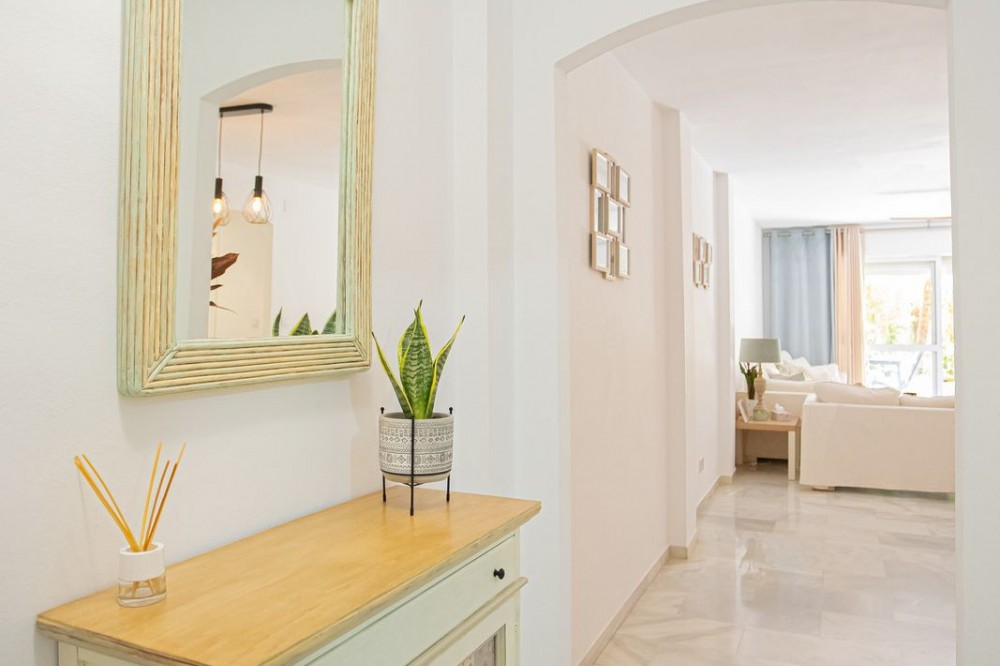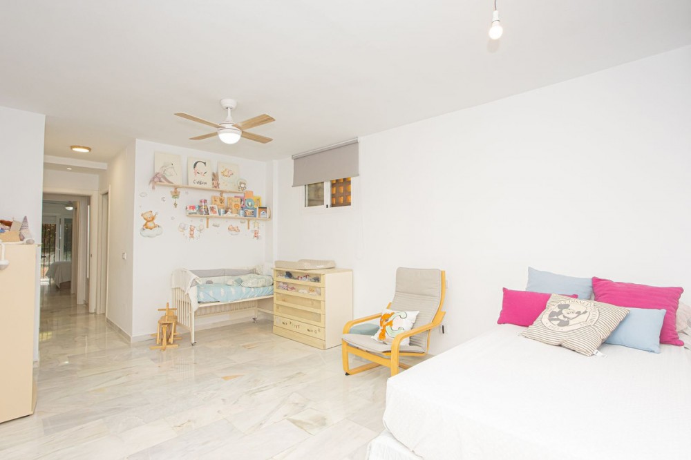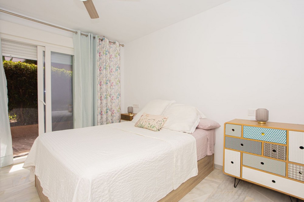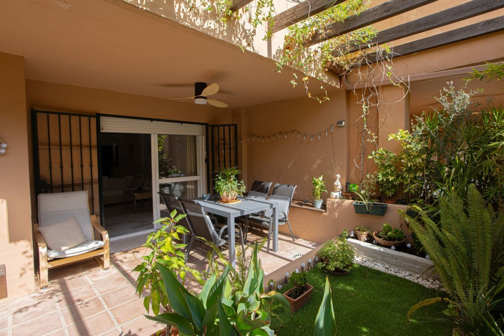 - This bright ground floor apartment is located within a private residential complex on Marbella’s prestigious Golden Mile. Inside, the layout currently comprises two spacious bedrooms and two bathrooms, with the potential to create a third bedroom thanks to its generous size. Surrounded by beautifully maintained gardens and a large communal swimming pool, it offers a peaceful lifestyle just minutes from the sandy beaches and the iconic Puente Romano hotel. Its unrivalled location and residential setting make it an excellent choice either as a year-round home or as a sound investment in one of Marbella’s most sought-after areas.