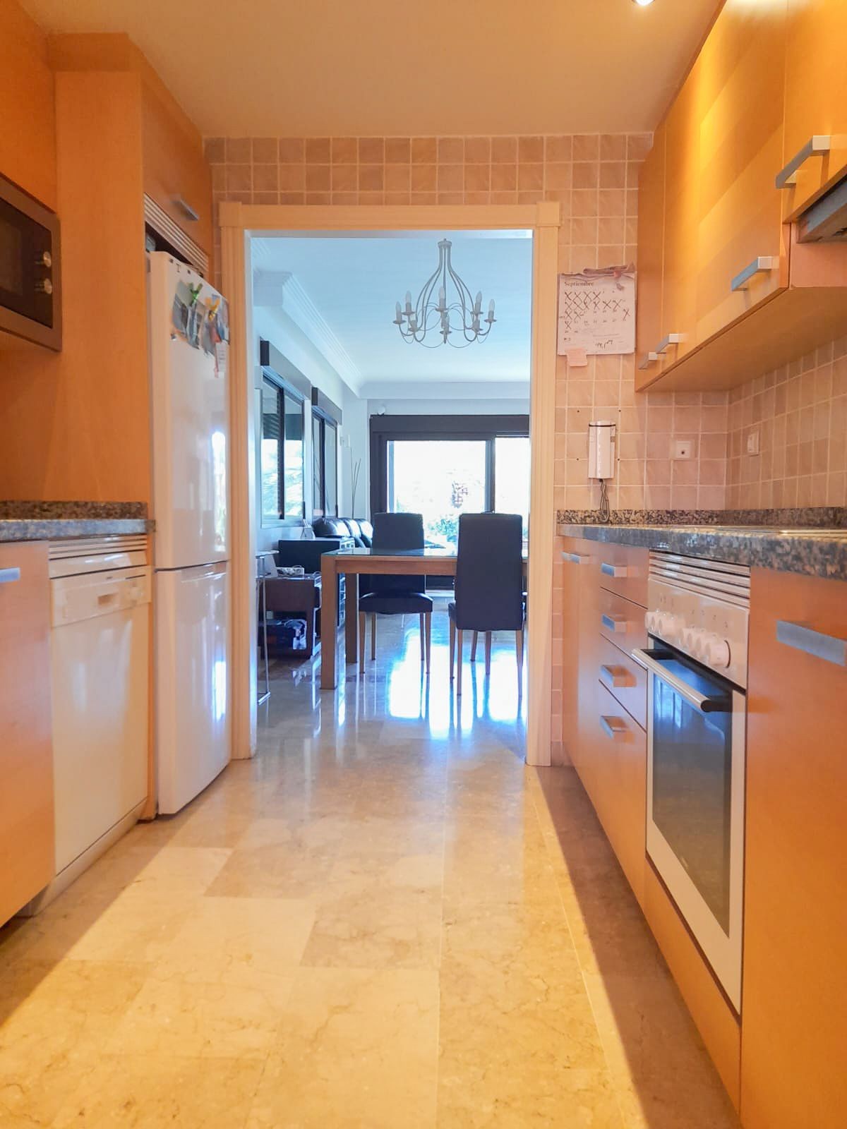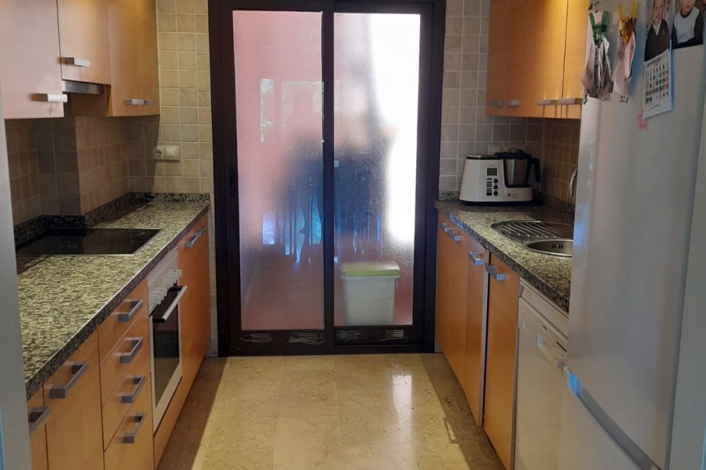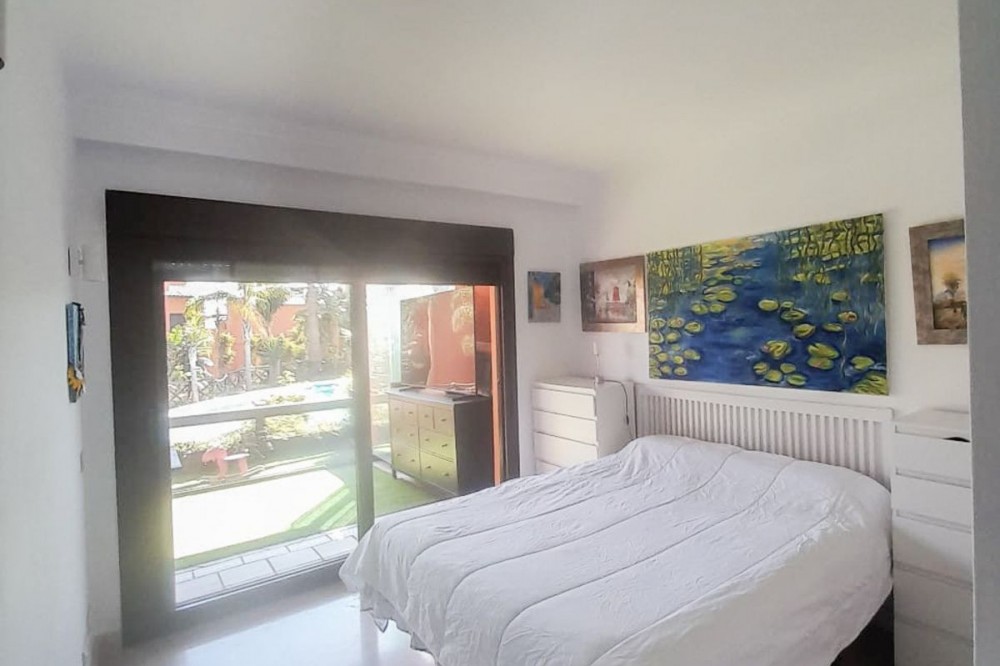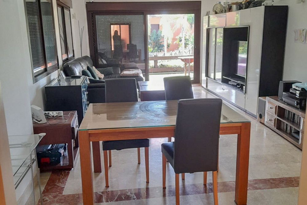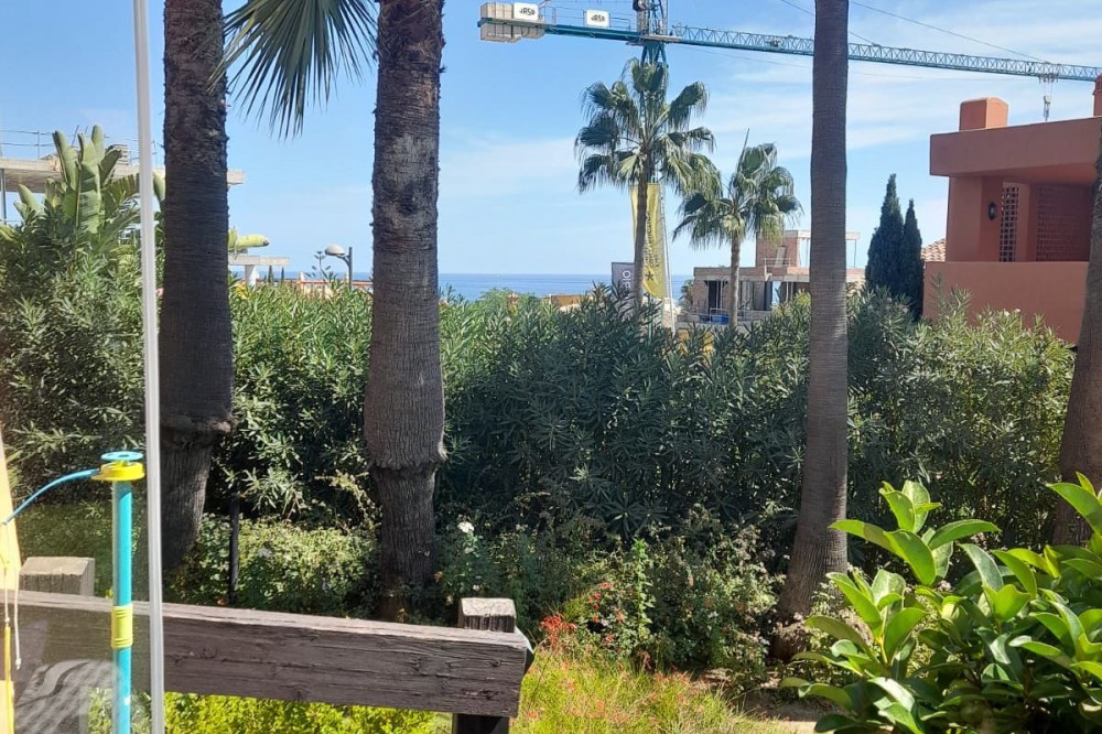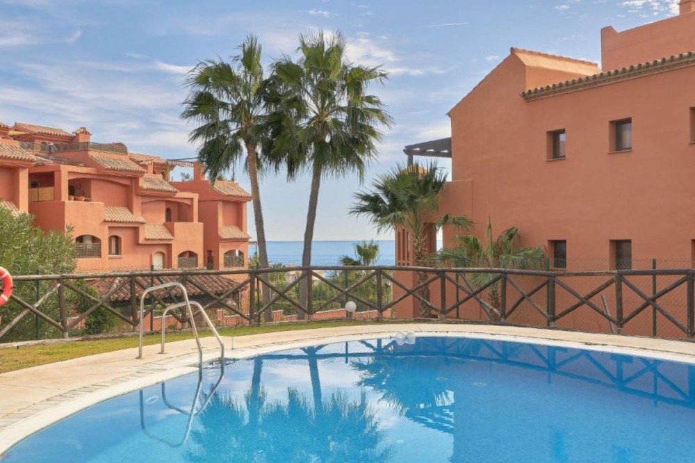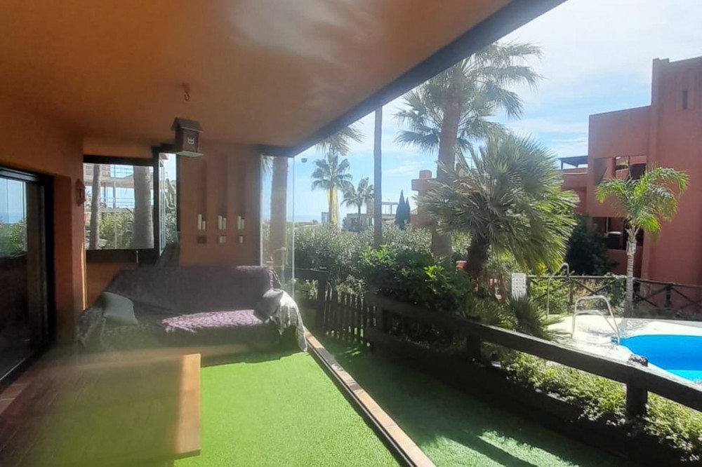 - In the Buenas Noches area, near Casares Playa and Estepona We present this spacious and very bright ground floor apartment. Upon entering, we find an entrance hall that leads to a separate kitchen with a laundry room and to a very open living-dining room thanks to a large window that connects to the generous terrace, with partial sea views, from which there is direct access to the communal pool. The living room also has two additional windows on the side, providing natural light throughout the day. The property has two double bedrooms: the master bedroom with en-suite bathroom, fitted wardrobe, and access to the terrace overlooking the pool; the second bedroom also has a fitted wardrobe. The exterior carpentry is aluminum, and the doors are lacquered in white. It includes a convenient parking space with room for a large car and motorcycle, as well as a storage room. The terrace has been glazed with the Lumon system, allowing it to be enjoyed all year round.