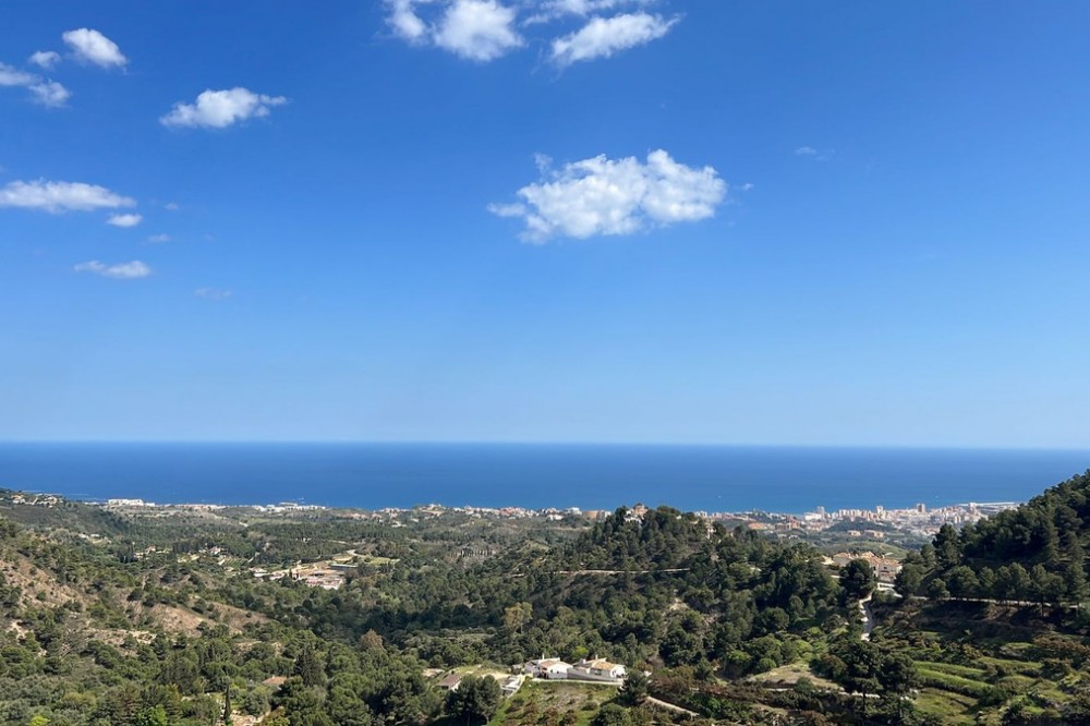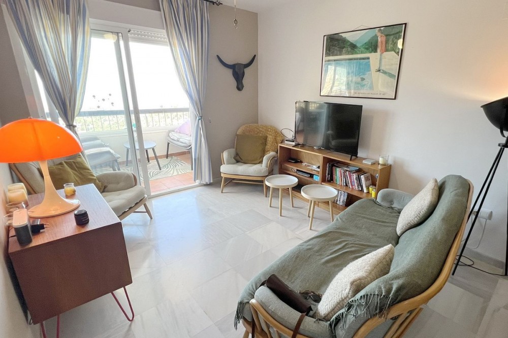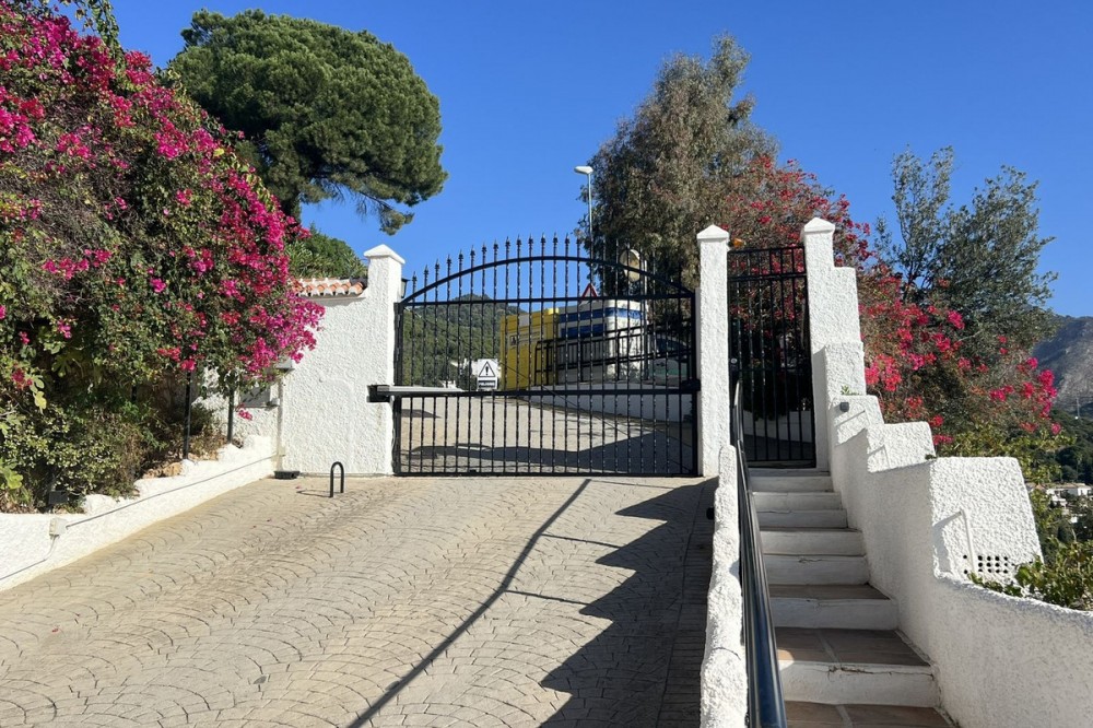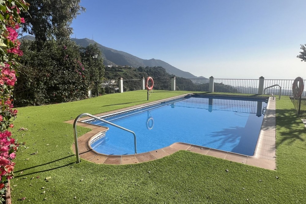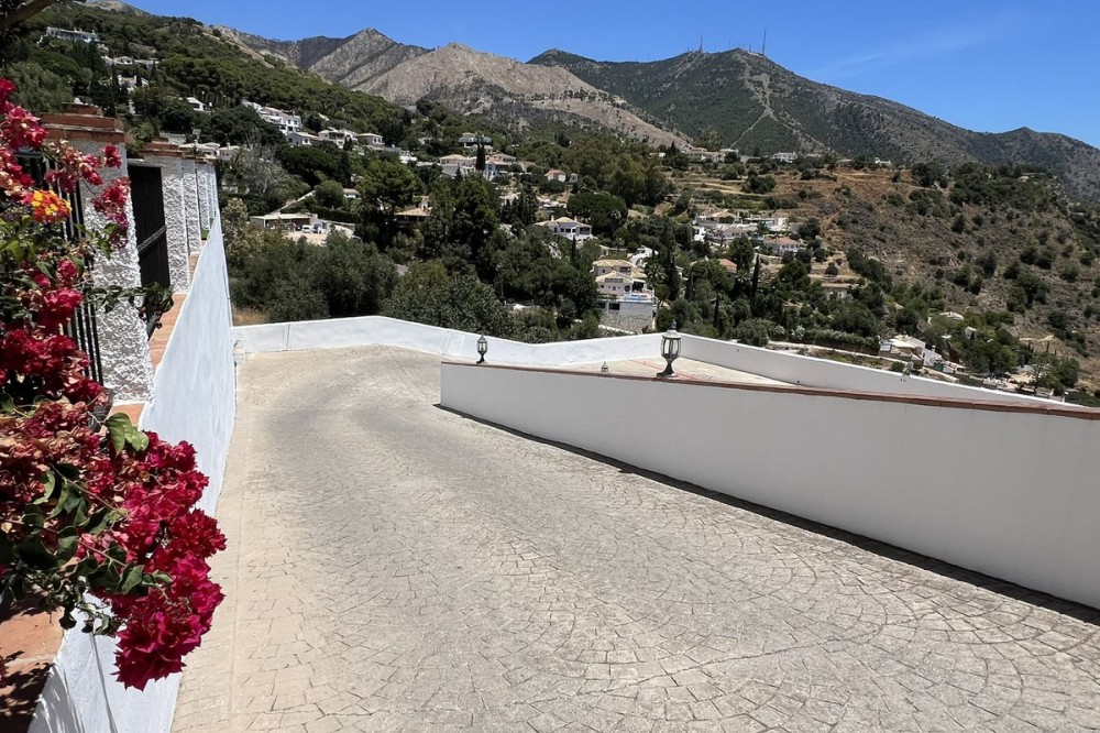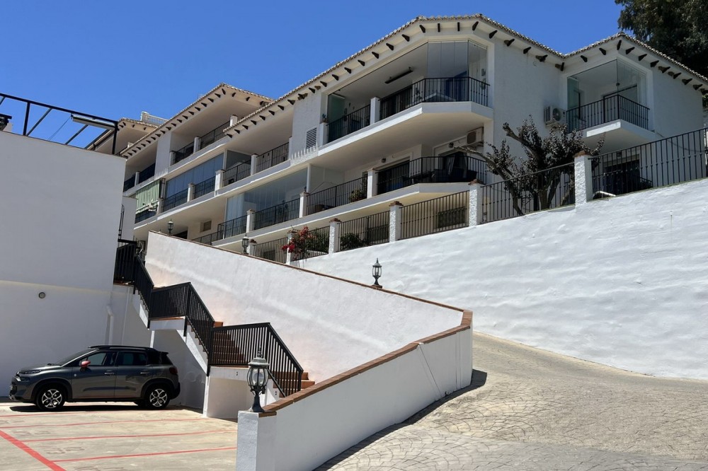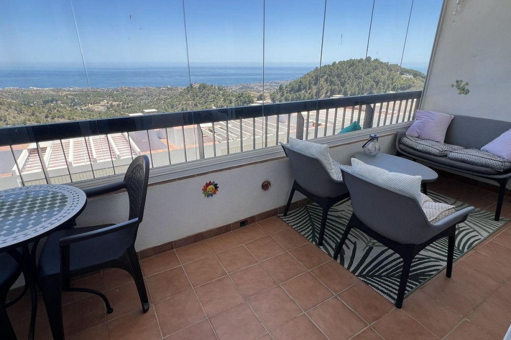 - WONDERFUL APARTMENT on the EDGE of MIJAS PUEBLO enjoying the MOST SPECTACULAR & BREATHTAKING PANORAMIC VIEWS TO THE SEA and MOUNTAINS!! Entrance hall. Lounge-dining room with A/C h+c, ceiling fan and sliding doors to enclosed sunny terrace with folding glass curtains. Shower room. Master bedroom with wardrobes and sliding doors to the enclosed terrace. This sunny enclosed terrace could be a reading room or study if needed. Double glazing. Roller blinds. Marble floors. Ceiling fans. Guest bedroom also has fitted wardrobes. Full bathroom. Fully fitted kitchen with glass-ceramic hob, fridge-freezer, oven, extractor fan and granite counter-top. Small patio has spiral stairs that lead up to huge ROOF-TOP TERRACE with those outstanding PANORAMIC views to the whole coast. There are new storage units, an outdoor shower, and space for BBQ and dining “al fresco” – a great place to chill out. Communal swimming pool, well-maintained gardens and a designated parking space. All within a peaceful gated complex only a short walk from Mijas center. Walking distance to all amenities! Near bus stop. VIEWINGS ARE HIGHLY RECOMMENED!!