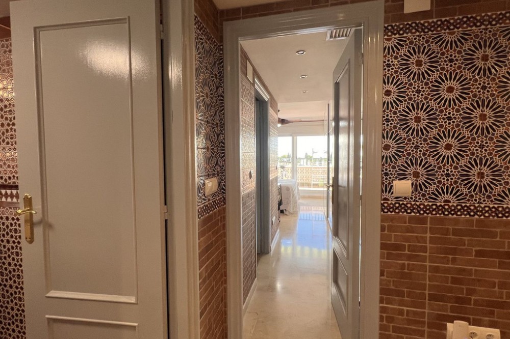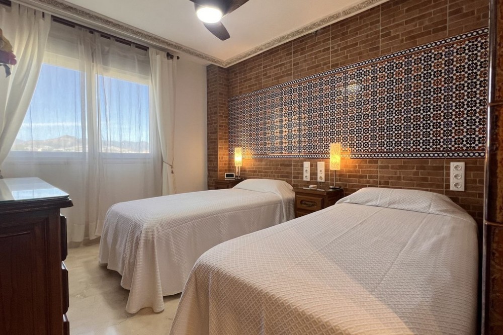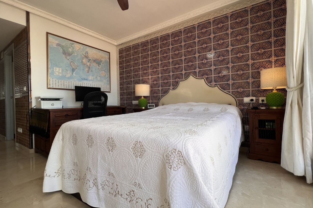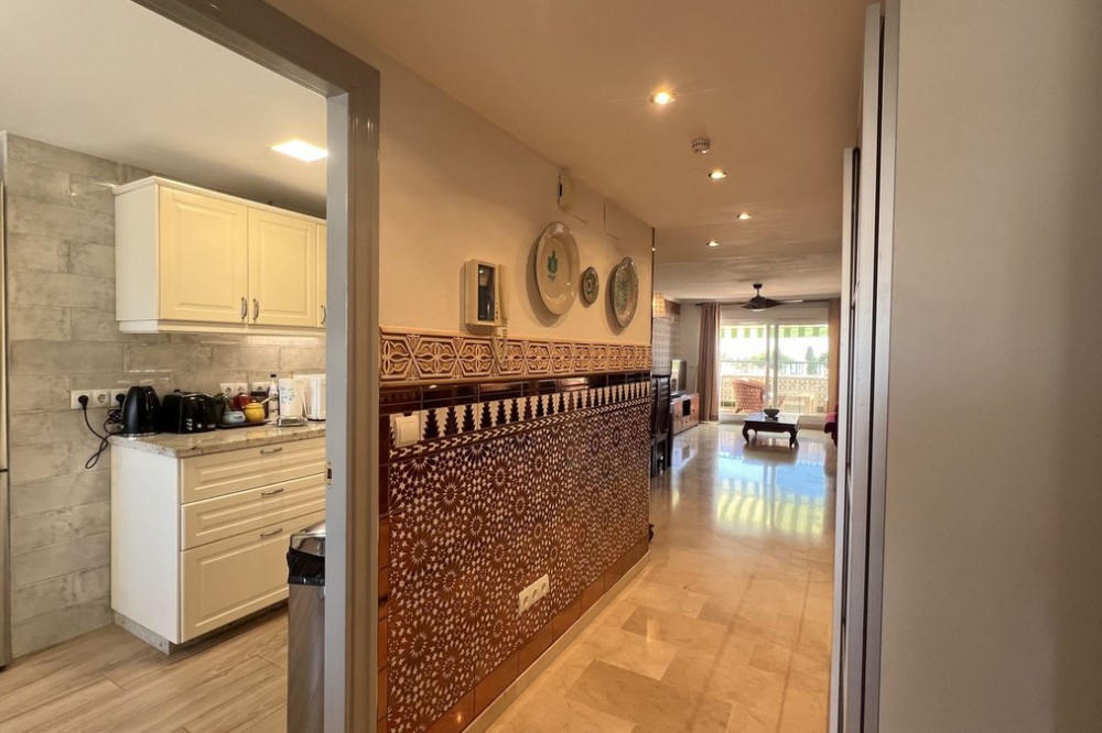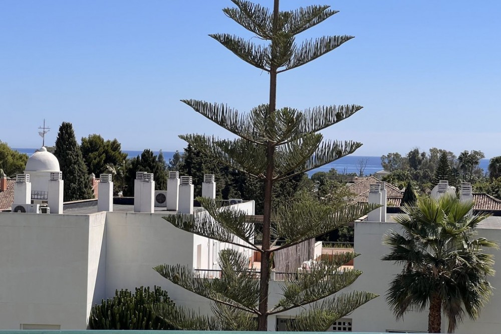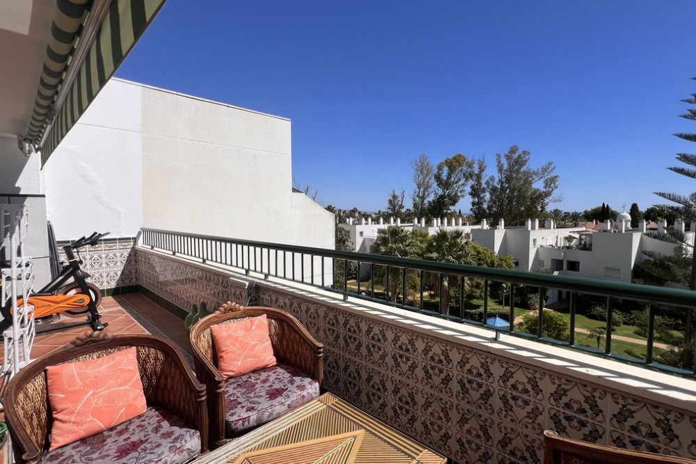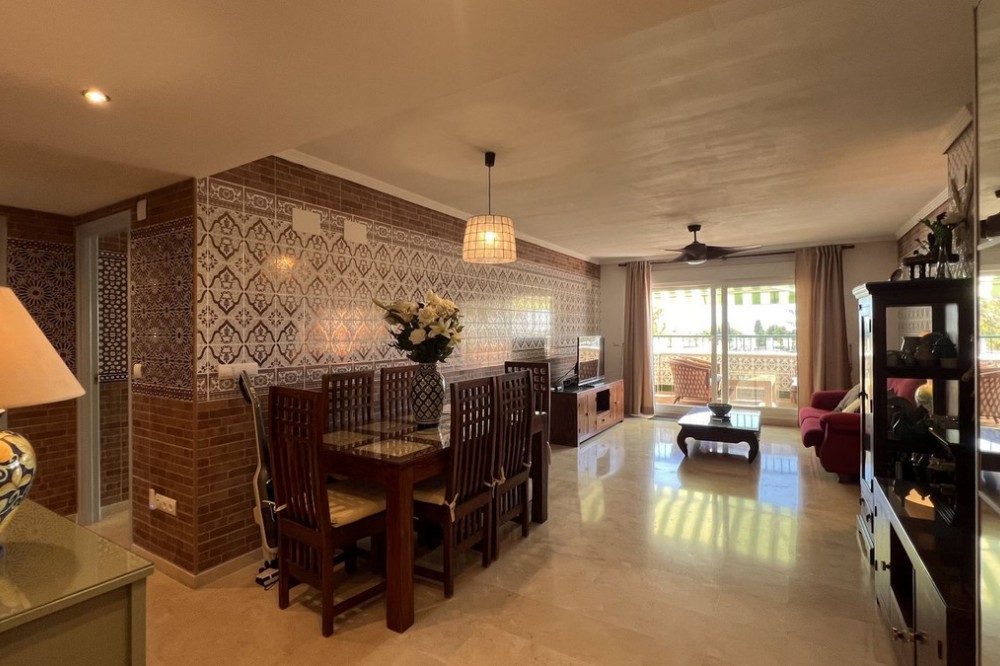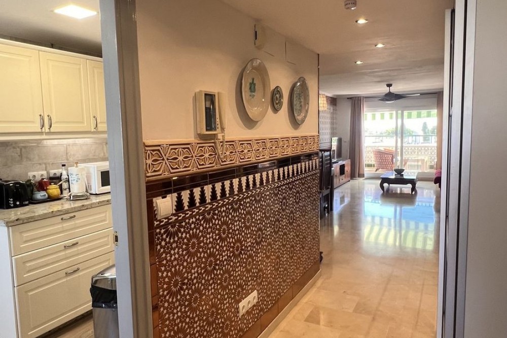 - This charming top-floor apartment, located in the sought-after Guadalmina Baja, offers a comfortable and modern living experience. The apartment features two spacious bedrooms and two renovated bathrooms. The open-concept layout creates a seamless flow between the living area and a newly updated kitchen, perfect for cooking and entertaining. Sustainable living is prioritized with solar panels providing hot water, adding both energy efficiency and eco-consciousness to the property. The apartment also boasts new air conditioning, ensuring comfort year-round. From the large windows, you'll enjoy open views of the beautifully landscaped garden and sparkling pool, with additional glimpses of the sea, creating a serene backdrop to your daily life. Included in the price is an underground parking space and storage room. The location is unbeatable, within walking distance to the vibrant commercial area of Guadalmina, offering an array of shops and restaurants. Plus, the beachside is just a short stroll away, allowing you to easily enjoy the Mediterranean coastline.
