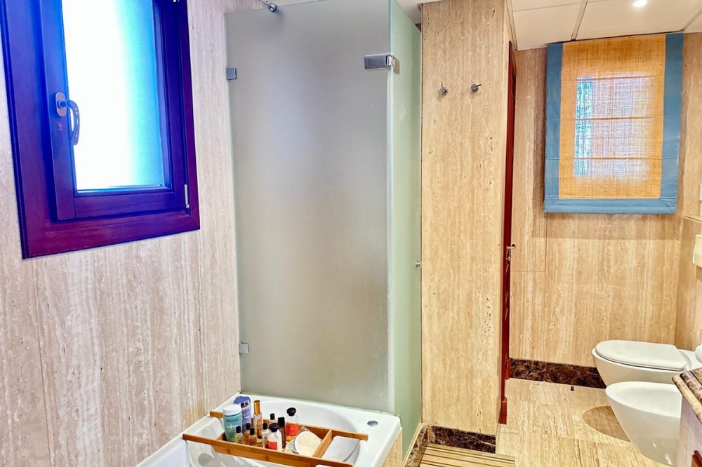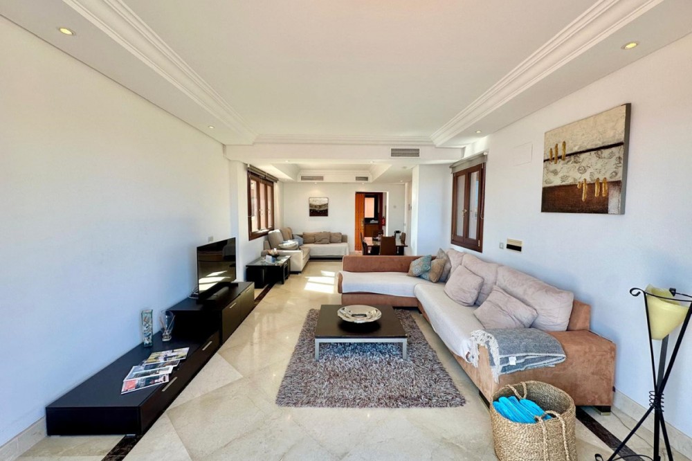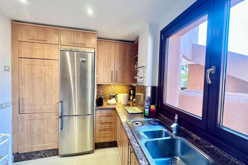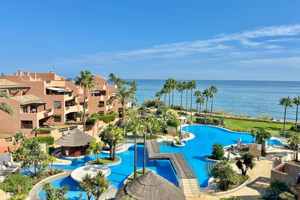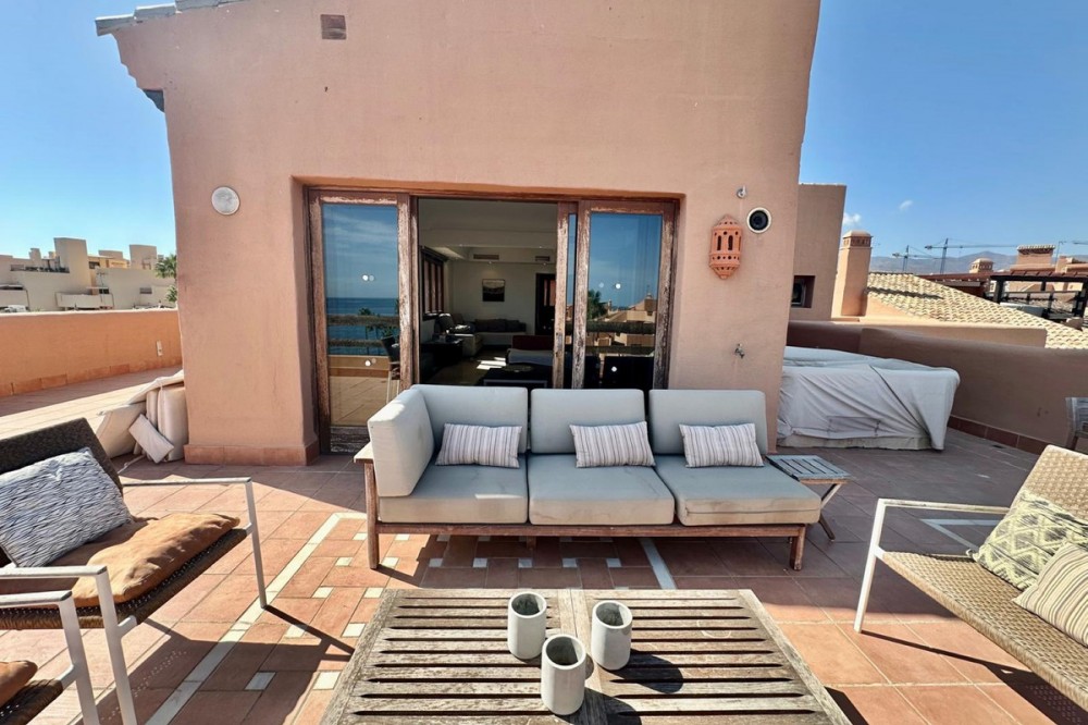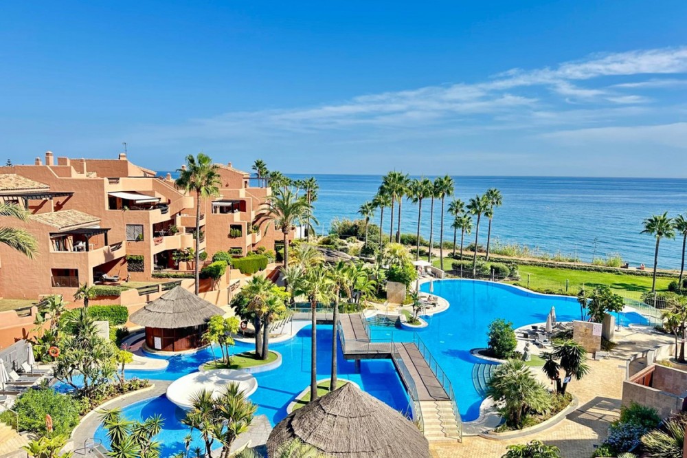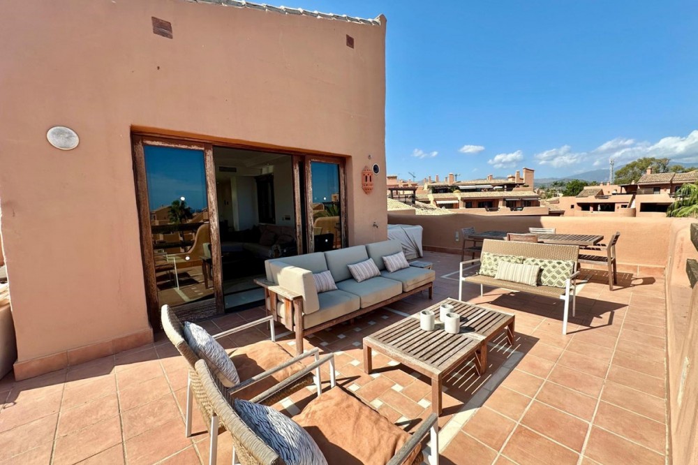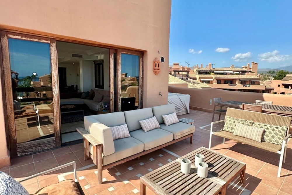 - Presenting a sophisticated penthouse situated in the exclusive Mar Azul development, East of Estepona town. This 1 bedroom, 1 bathroom property spans 80m² of meticulously maintained living space, complemented by an expansive 100m² private terrace with panoramic views to the sea and surroundings. Ideally positioned on the front line of the beach, the residence enjoys stunning panoramic, sea, garden, and pool views, offering a rare opportunity to embrace the quintessential Costa del Sol lifestyle. The penthouse is offered fully furnished and features a fully fitted and equipped kitchen, marble floors, and a spacious living and dining area that seamlessly connects to the terrace. Modern comforts include air conditioning, underfloor heating in the bathrooms, double glazing, and security shutters, ensuring a pleasant living environment year-round. There is a garage space and store room included. Residents of Mar Azul enjoy access to a wealth of communal facilities, including a heated indoor pool, gym, beautifully landscaped gardens, and a solarium. Security is paramount, with a gated community, 24-hour security service, surveillance cameras, video entrance, and a doorman. The building is equipped with a lift, and a private garage space is included, alongside ample visitor parking. The property is maintained in excellent condition, with a dedicated 24-hour service available for residents. The location is second to none, with amenities, transport links, shops, schools, restaurants, and leisure facilities all within easy reach. Golf courses, playgrounds, and the vibrant hubs of Puerto Banús, Marbella Centre, and Estepona Centre are nearby, making this penthouse an exceptional choice for those seeking a refined beachfront residence with unparalleled convenience and comfort.