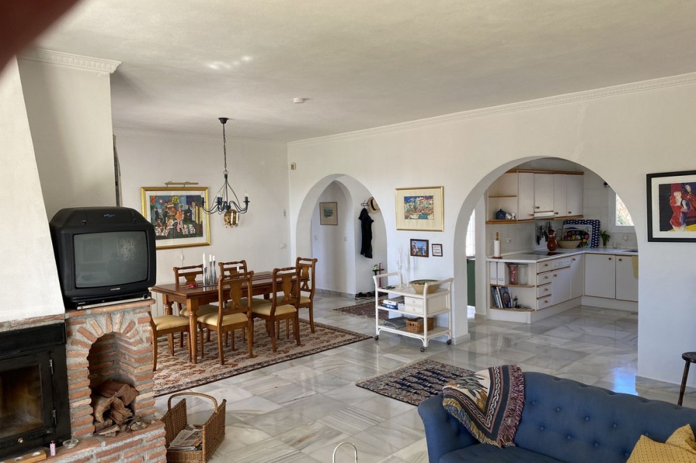 - A RARELY AVAILABLE SINGLE LEVEL VILLA IN A HIGHLY SOUGHT AFTER POSITION CLOSE TO THE WHITE WASHED AND HISTORICAL VILLAGE OF MIJAS Panoramic sea, mountain and country views. South orientation and driveway and garage parking. AT A GLANCE 4 BEDROOMS 3 BATHROOMS - 2 EN SUITE COMPLETE PRIVACY PANORAMIC VIEWS POTENTIAL TO IMPROVE This lovely property is located at an end of a small cul de sac with just 2 other neighboring villas. Electric gates with driveway parking along with a large single garage with additional storage. Entrance porch, reception lobby, spacious lounge/diner with feature fireplace and direct access to a terrace, garden and pool. Fully fitted kitchen, with the easy possibility to enlarge in order to create a kitchen/ breakfast room. Master bedroom with en suite and access to the garden. 3 further double guest bedrooms, one with an en suite and the others served by a family bathroom. OUTSIDE Private gardens, boasting lovely sea views and an 8m x 4m pool. ADDITIONAL FEATURES DOUBLE GLAZING PART AIR CONDITIONING HOT/COLD GAS FIRED HEATING GUTTERING MIJAS VILLAGE 5 MINUTES BEACH AND FUENGIROLA 12 MINUTES MALAGA 25 MINUTES MARBELLA 25 MINUTES