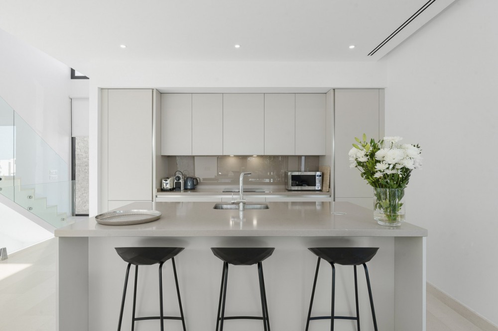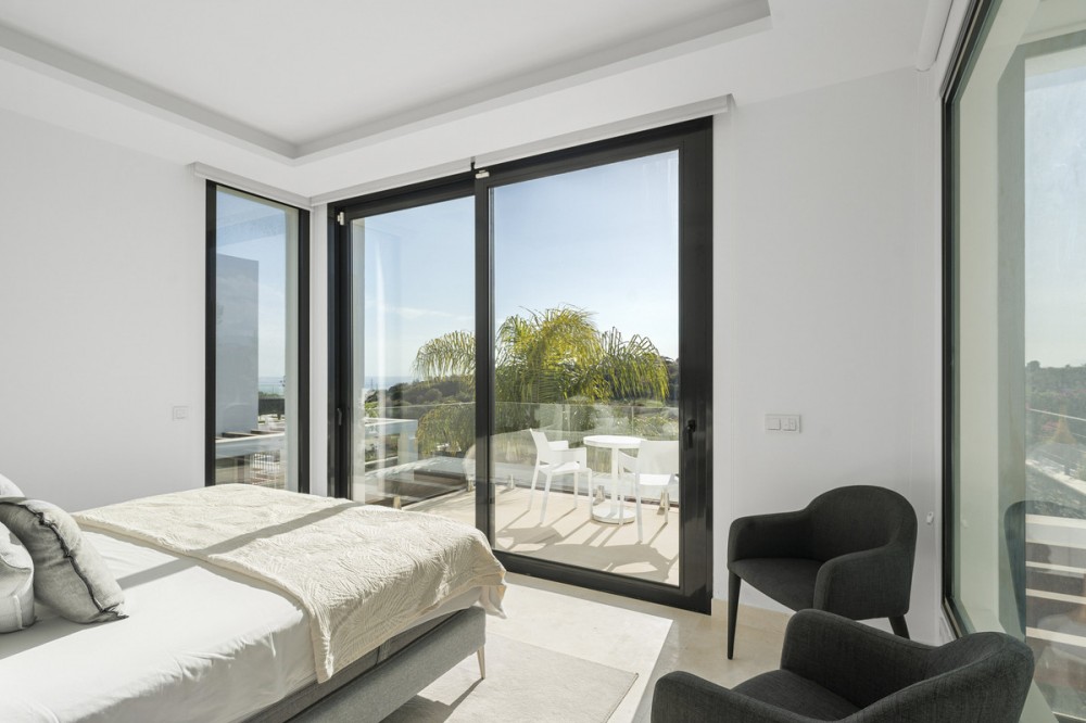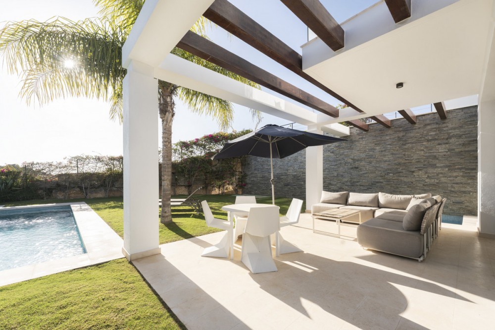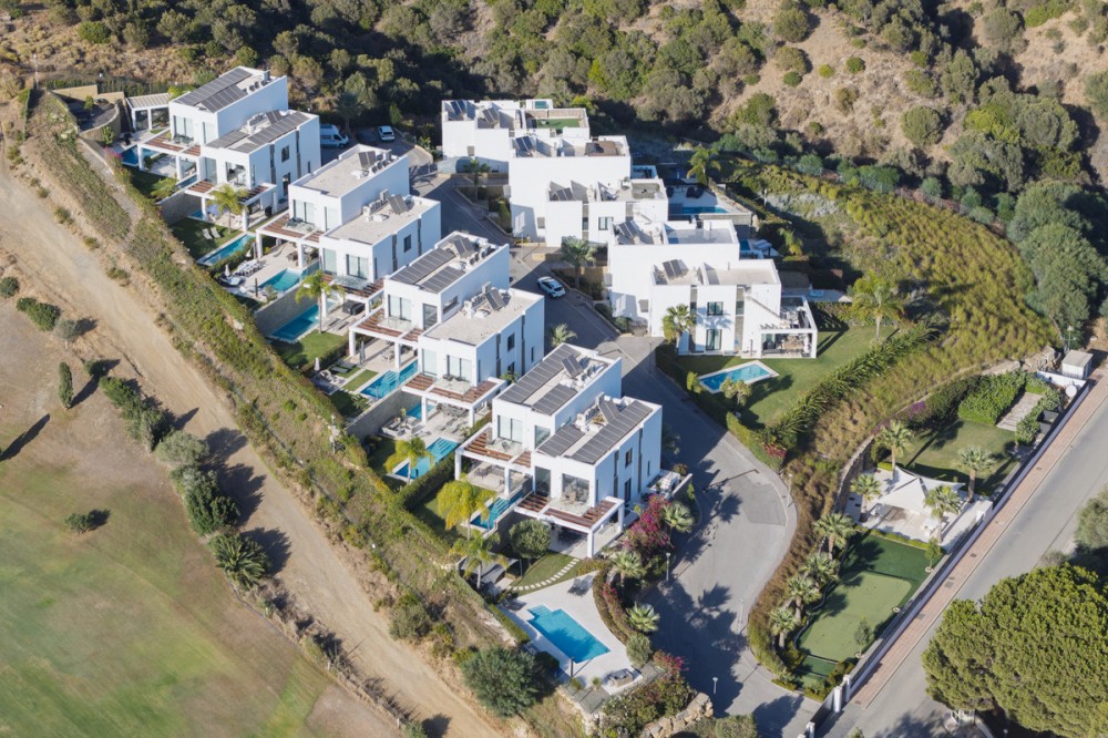 - This elegant property is located within a secure gated community of just 14 residences, overlooking the Cabopino Golf Course to the east of Marbella. The community offers both peace and privacy in a tranquil hillside setting, while remaining close to all nearby amenities. Built in 2020, the villa embodies a modern concept of elegance and functionality, designed to maximise the seamless indoor–outdoor lifestyle that the Mediterranean climate makes possible. Perfectly positioned between Marbella and Fuengirola, on the boundary of Mijas Costa and Marbella, the property enjoys a highly desirable location for both holidays and permanent living. From here, you can take in panoramic views of the golf course, sea, and surrounding countryside, while being only a 15-minute walk from some of the finest beaches in the area. Inside, the villa immediately impresses with its open-plan design. The main floor flows effortlessly from the kitchen through to the spacious living and dining areas, extending out to a well-furnished terrace, landscaped garden, and inviting pool. An additional plunge pool by the terrace offers yet another spot to relax and enjoy the sunshine. The ground floor’s contemporary kitchen allows for sociable cooking experiences, with easy interaction across the open-plan living spaces. The lower level features two bedrooms sharing a bathroom, cleverly designed to benefit from ample natural light and fresh air. This level also includes a dedicated TV lounge, perfect for quiet evenings or family entertainment. On the upper floor, the master suite enjoys its own bathroom and private terrace with stunning views over the garden, pool, golf course, and coastline. Two further bedrooms share an additional bathroom on this level. The semi-detached villa is tastefully furnished throughout, with high-quality kitchen and dining finishes and carefully selected garden furniture, ensuring maximum comfort in every corner of the home.