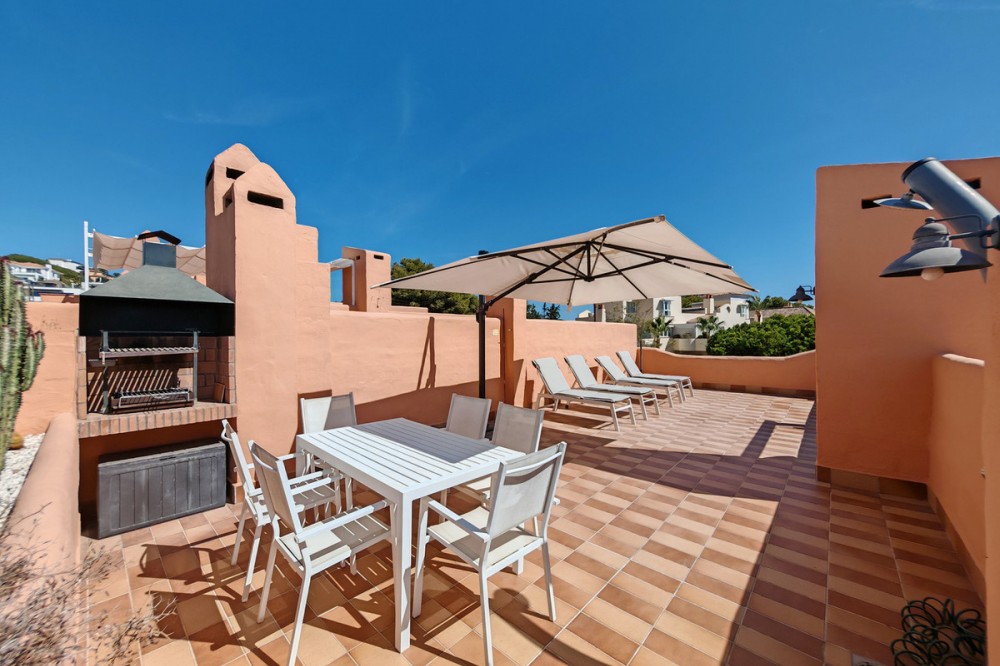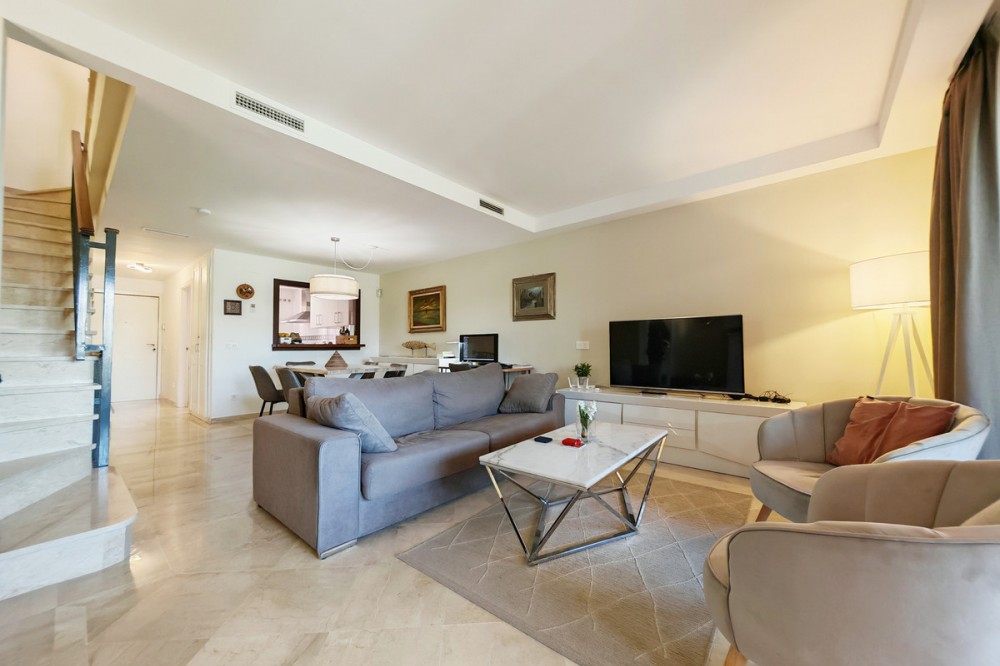 - Town House for sale in Cabopino, Marbella with 3 bedrooms, 2 bathrooms, 2 en suite bathrooms, 1 toilet and with orientation south, with communal swimming pool, private garage and private garden. Regarding property dimensions, it has 304.22 m² built and 135.56 m² plot. Has the following facilities front line golf, transport near, air conditioning, fully fitted kitchen, fireplace, marble floors, satellite tv, basement, alarm, solarium, security entrance, double glazing, video entrance, barbecue, telephone, guest toilet, private terrace, living room, sea view, golf view, smart home system, internet - wi-fi, covered terrace, electric blinds, fitted wardrobes, garden view, pool view, panoramic view, street view, close to sea / beach, close to golf, uncovered terrace, glass doors, optional furniture, excellent condition, recently renovated / refurbished, ceiling cooling system, saltwater swimming pool, close to shops, close to port, surveillance cameras and pets allowed.