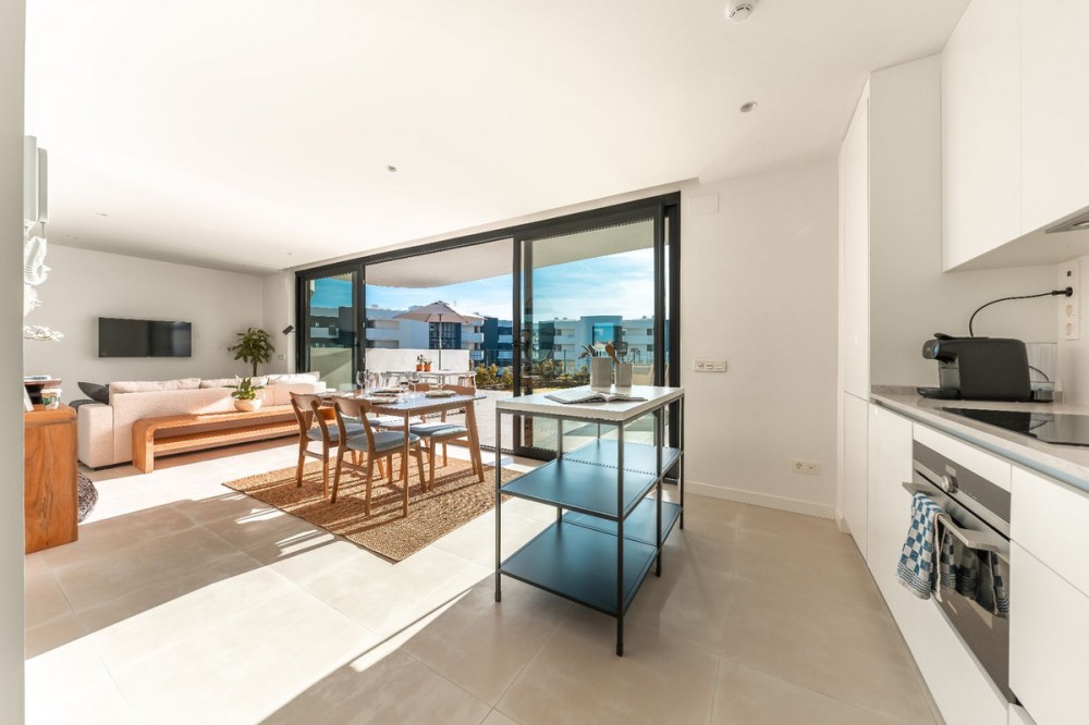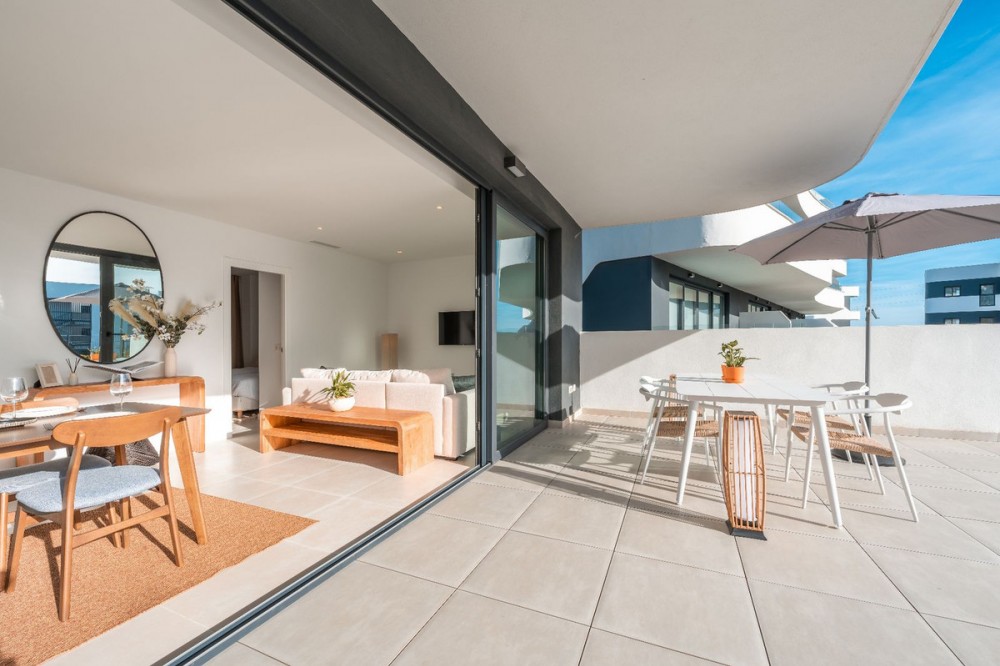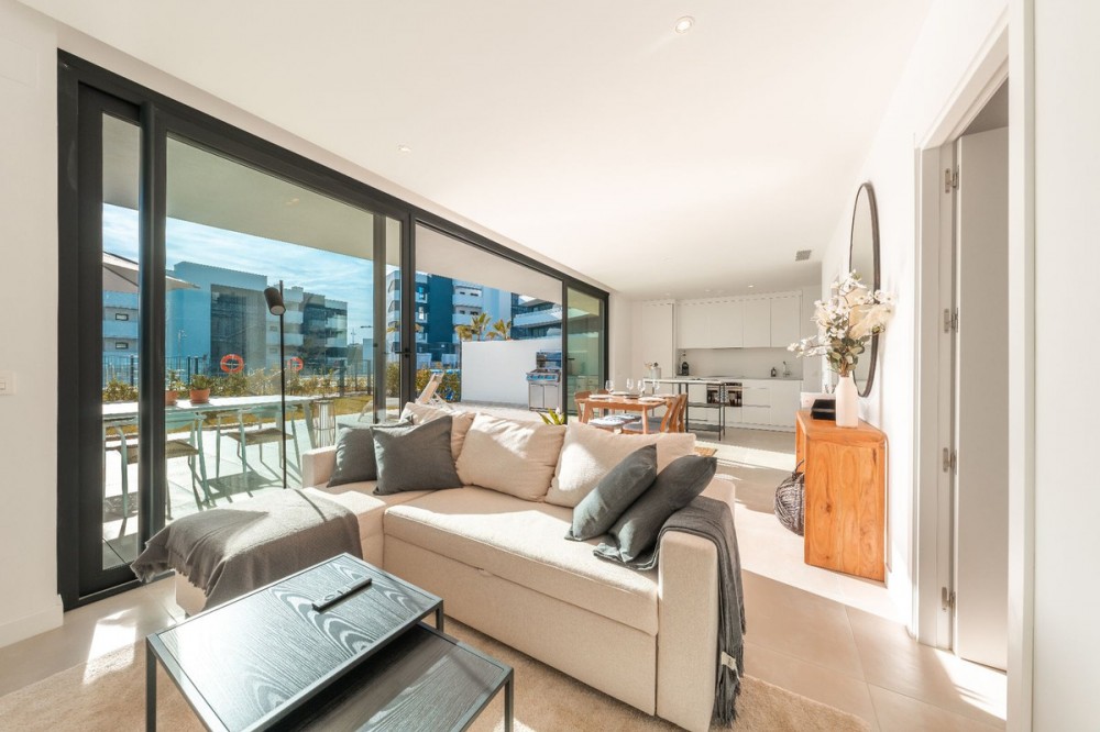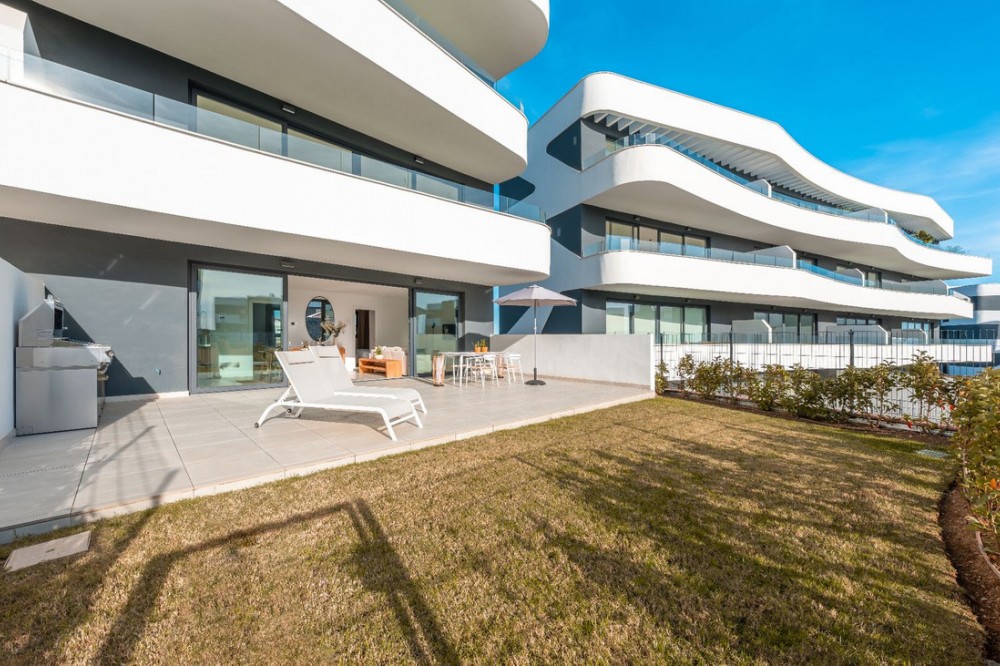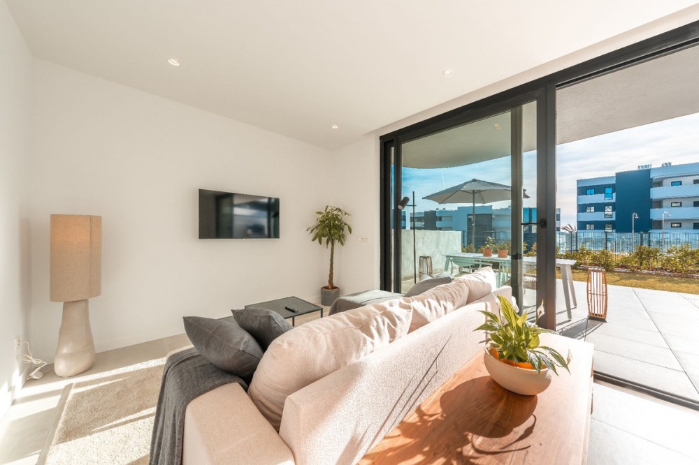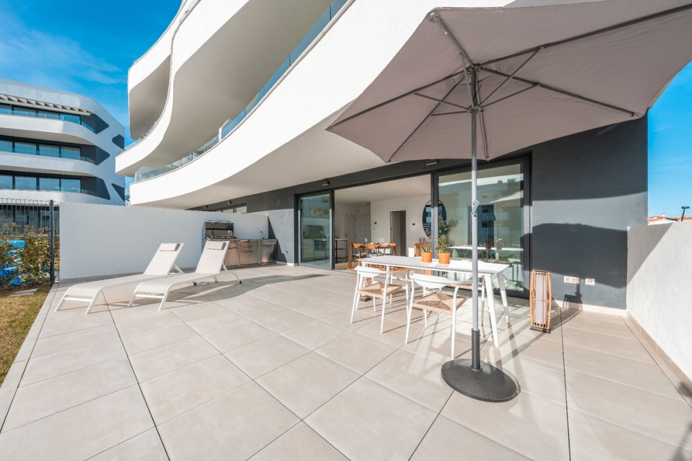 - Welcome to this serene and stylish ground-floor apartment that captures the essence of contemporary Mediterranean living. This beautifully presented two-bedroom, two-bathroom home combines modern design with warm natural tones and abundant light, creating an inviting and relaxing atmosphere from the moment you enter. The open-plan living area connects effortlessly with the spacious west-facing terrace and private garden — together measuring nearly 50 m² — offering the perfect setting for al fresco dining, morning coffee, or relaxing in the sun while overlooking the pool and landscaped gardens. The orientation ensures warm natural light throughout the day and beautiful sunset colors in the evening. Inside, every detail has been thoughtfully designed for comfort and functionality. The fully equipped kitchen includes high-quality appliances such as an oven, fridge-freezer, dishwasher, coffee machine, and more. Both bedrooms are spacious and bright, and the two bathrooms feature sleek finishes and underfloor heating for added comfort year-round. The property offers a total built area of 74.55 m², complemented by a private garden of 45.18 m². Additional features include two private underground parking spaces, a storage room of 6.87 m², air conditioning, high-speed Wi-Fi, and a Smart TV. Located in a secure and well-maintained residential complex with multiple swimming pools and beautifully landscaped common areas, the apartment provides the ideal balance between privacy, comfort, and community living. Its location is highly convenient — just five minutes from the beach, and within easy reach of Málaga Airport, Fuengirola, and Marbella — offering quick access to all major amenities along the coast. The property holds a valid short-term rental license and has been rented out very successfully over the past two years, combining excellent investment potential with the ease of a turn-key holiday home. Offered for €479,000 (furniture optional for an additional €20,000 — BBQ excluded). A refined home that blends design, sunlight, and tranquility — the perfect place to enjoy life under the southern sun.
