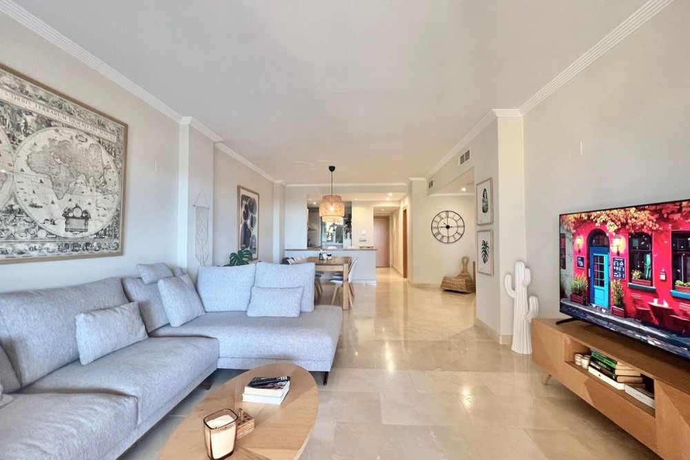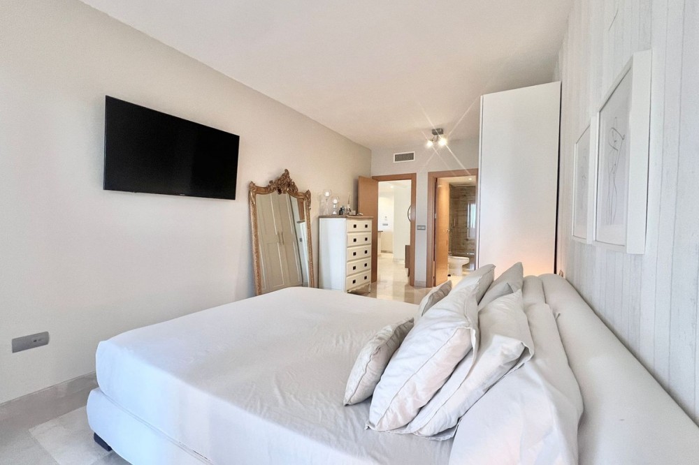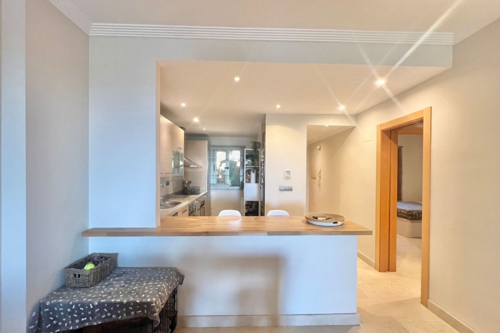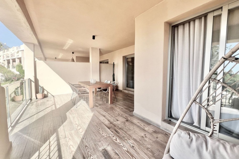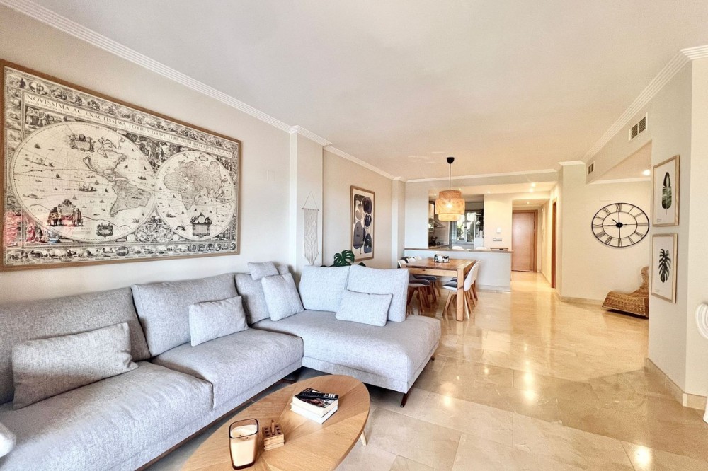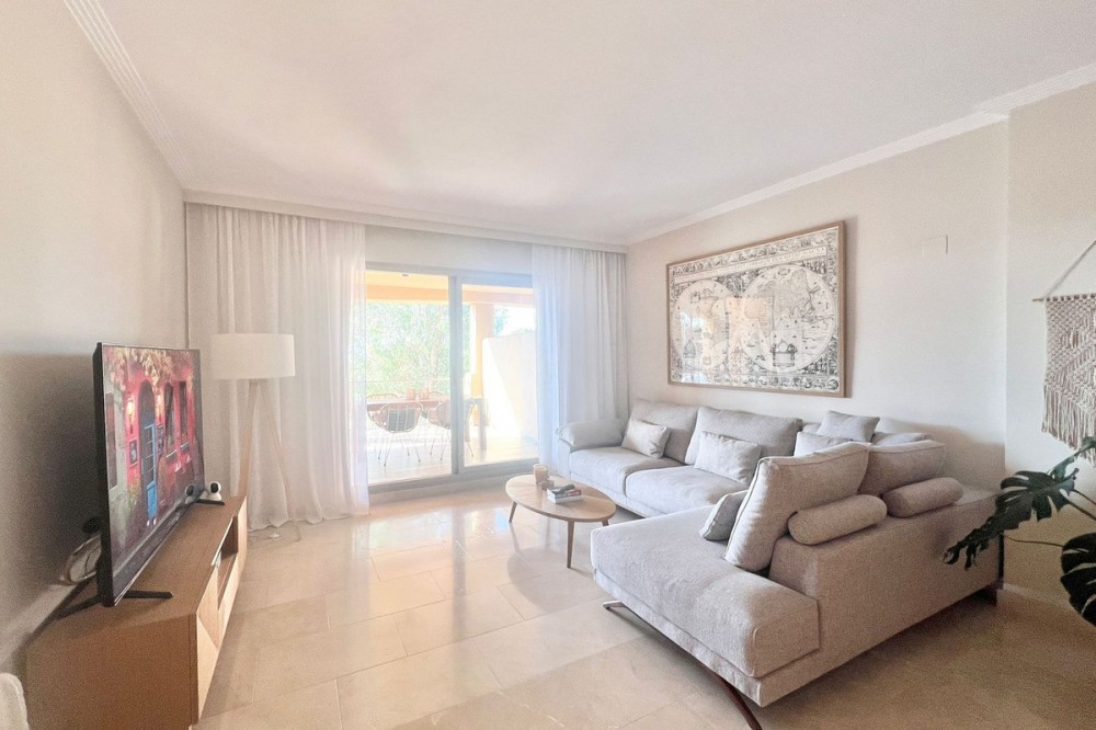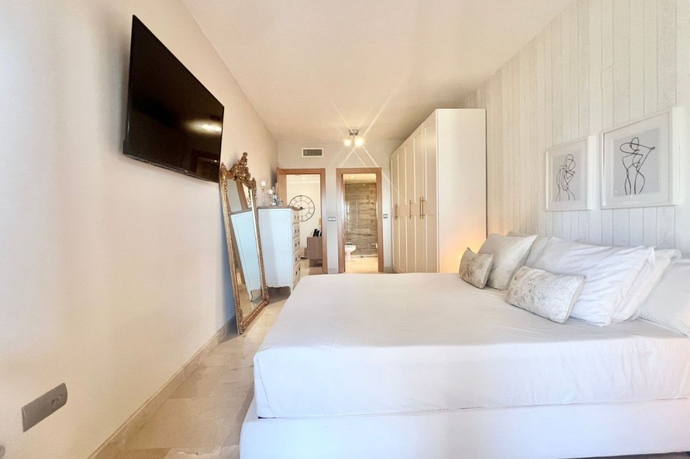 - Renovated Apartment in the New Golden Mile – 5 min from the Beach & 15 min from Puerto Banús! Discover this spectacular apartment renovated in 2021, located in one of the most sought-after areas of the Costa del Sol: the New Golden Mile, between Puerto Banús and Estepona. A strategic location, ideal for year-round living or as a second home by the sea. Just 5 minutes by car from the beach and 15 minutes on foot along a charming coastal path that leads directly to the sea. Excellent connections allow you to reach Puerto Banús or Estepona centre in just 15 minutes, surrounded by the best restaurants, beach clubs, and amenities. This bright apartment is set on a raised ground floor, offering privacy and generous spaces throughout: Spacious living room of over 30 m² with an open and modern kitchen. Master bedroom of 19 m² with a fully renovated ensuite bathroom. Second bedroom with an additional bathroom. 28 m² terrace with pleasant partial sea views, perfect to enjoy the Mediterranean climate. The complex is undergoing aesthetic renovation with restored façades in elegant off-white tones, featuring over 20,000 m² of beautifully maintained tropical gardens and two swimming pools available all year round. Includes a large parking space and storage room. A property that combines space, comfort, and a prime location in the heart of the Costa del Sol. Perfect for those who wish to live close to the sea with easy access to the most exclusive destinations and all amenities.