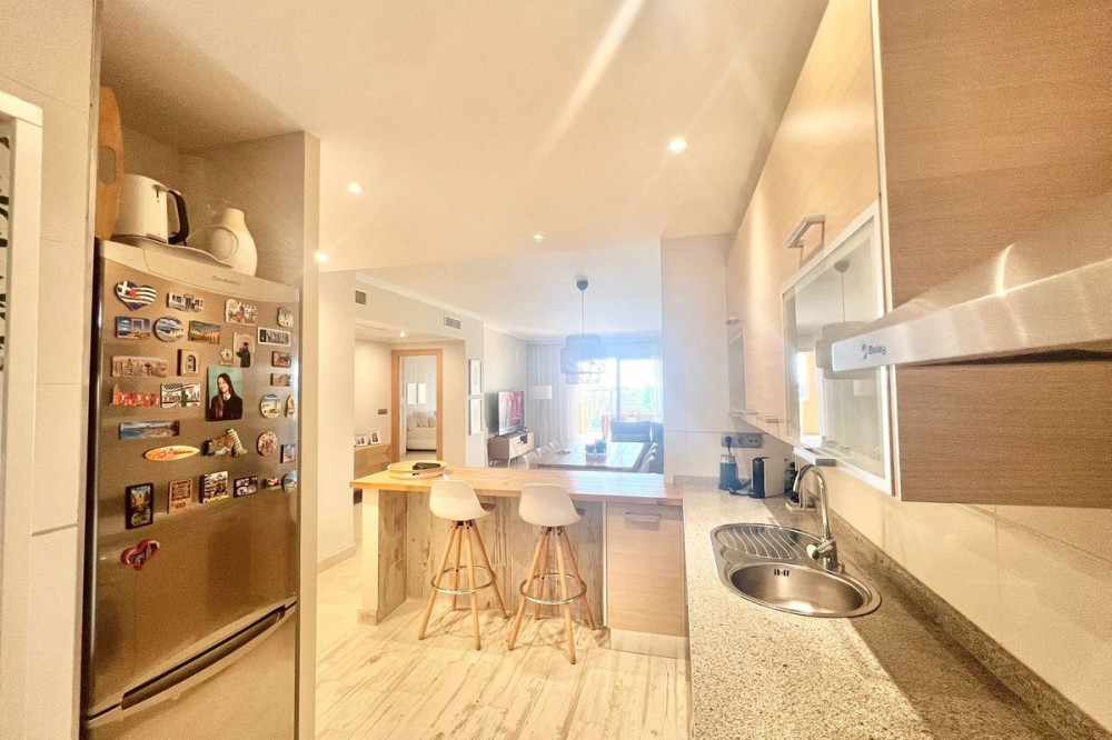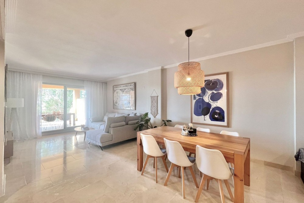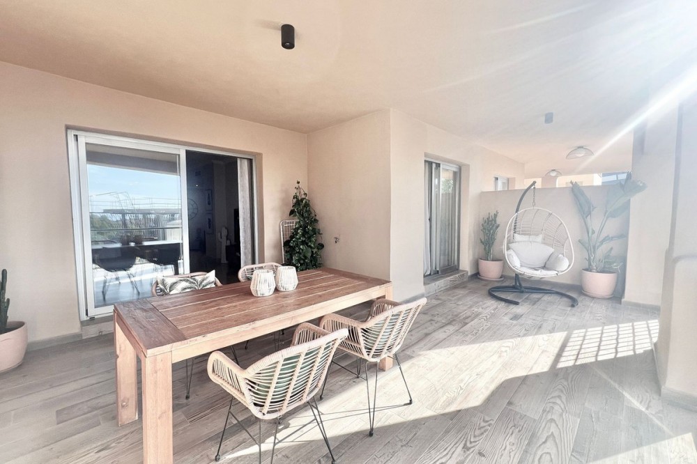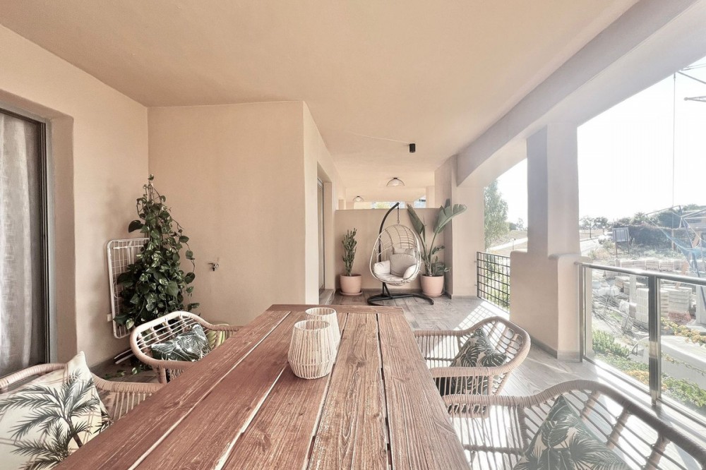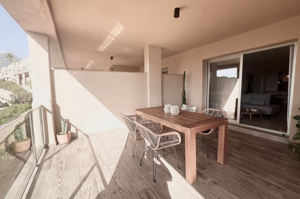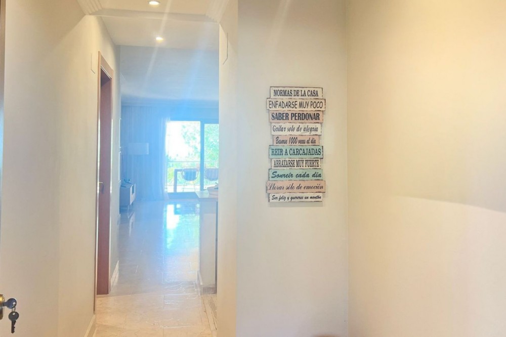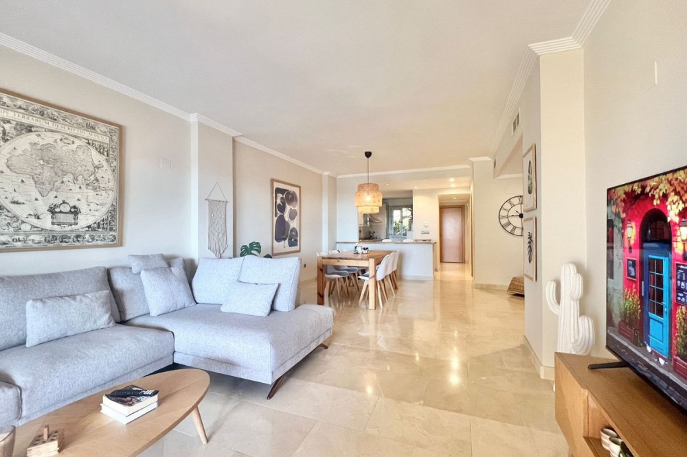 - Renovated Apartment in the New Golden Mile – 5 min from the Beach & 15 min from Puerto Banús! Discover this spectacular apartment renovated in 2021, located in one of the most sought-after areas of the Costa del Sol: the New Golden Mile, between Puerto Banús and Estepona. A strategic location, ideal for year-round living or as a second home by the sea. Just 5 minutes by car from the beach and 15 minutes on foot along a charming coastal path that leads directly to the sea. Excellent connections allow you to reach Puerto Banús or Estepona centre in just 15 minutes, surrounded by the best restaurants, beach clubs, and amenities. This bright apartment is set on a raised ground floor, offering privacy and generous spaces throughout: Spacious living room of over 30 m² with an open and modern kitchen. Master bedroom of 19 m² with a fully renovated ensuite bathroom. Second bedroom with an additional bathroom. 28 m² terrace with pleasant partial sea views, perfect to enjoy the Mediterranean climate. The complex is undergoing aesthetic renovation with restored façades in elegant off-white tones, featuring over 20,000 m² of beautifully maintained tropical gardens and two swimming pools available all year round. Includes a large parking space and storage room. A property that combines space, comfort, and a prime location in the heart of the Costa del Sol. Perfect for those who wish to live close to the sea with easy access to the most exclusive destinations and all amenities.