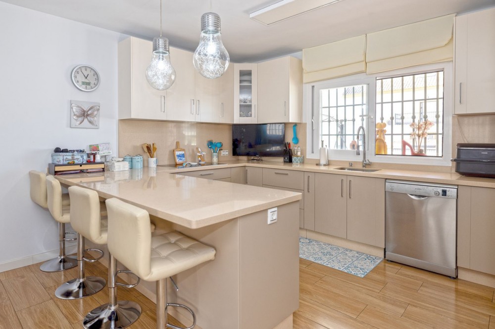 - Luxury Semi-Detached Villa in San Pedro Alcántara, Marbella Magnificent semi-detached villa ready to move into, ideal for families seeking comfort, security, and a privileged location. Situated in the prestigious area of San Pedro Alcántara, just a short distance from Guadalmina, this property combines contemporary design, high-quality materials, and excellent access to all services, schools, and leisure areas. With its south-facing orientation, the house enjoys exceptional natural light throughout the day. Located only 10 minutes’ walk from the beach, 5 minutes from the centre of San Pedro Alcántara, and 10 minutes by car from Puerto Banús, it offers the perfect setting to enjoy the Marbella lifestyle in a peaceful and secure environment. With a built area of 238 m² on a 200 m² plot, the property is distributed across four levels, maximising space and natural light. It features six bedrooms, four bathrooms (with the possibility of adding a fifth), and two spacious garages. The main floor includes a bright and open living area, a separate dining room, and a modern fully equipped kitchen. The master bedroom comes with a large dressing room that could easily be converted into an additional bedroom if desired. The basement, fully refurbished, has been adapted as an independent apartment, ideal for guests or staff, and includes a bedroom, games room, and a large cellar or storage area. The property also offers a spacious entrance and porch, as well as a service entrance and utility area, providing great comfort and functionality. High-end features include electric security shutters, premium thermal aluminium windows, natural parquet flooring, home automation and alarm system, air conditioning, built-in wardrobes, and a reinforced security door. Located in a quiet and secure residential area, this home is surrounded by shops, restaurants, supermarkets, and all essential services. Nearby are several prestigious international and bilingual schools, such as Laude San Pedro International College, Saint George’s School, and Calpe School, as well as excellent public schools. A modern, elegant, and functional home, ready to move into, perfect for those seeking quality, security, and convenience in one of the most sought-after areas of Marbella.