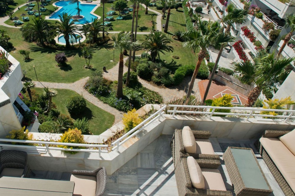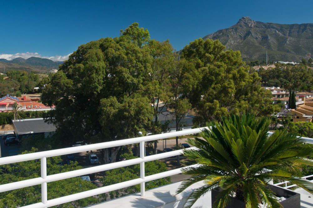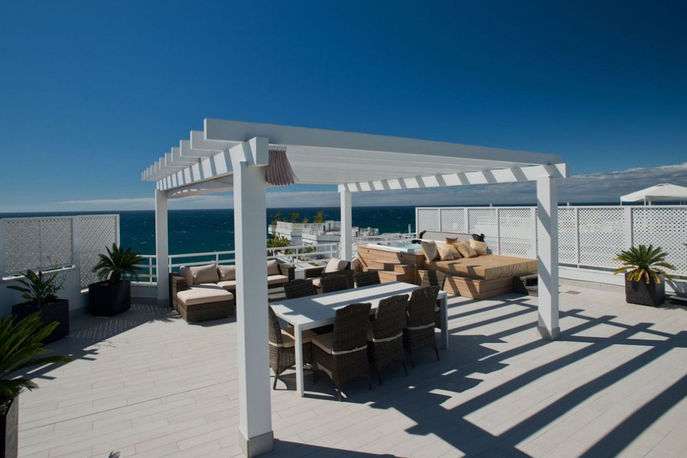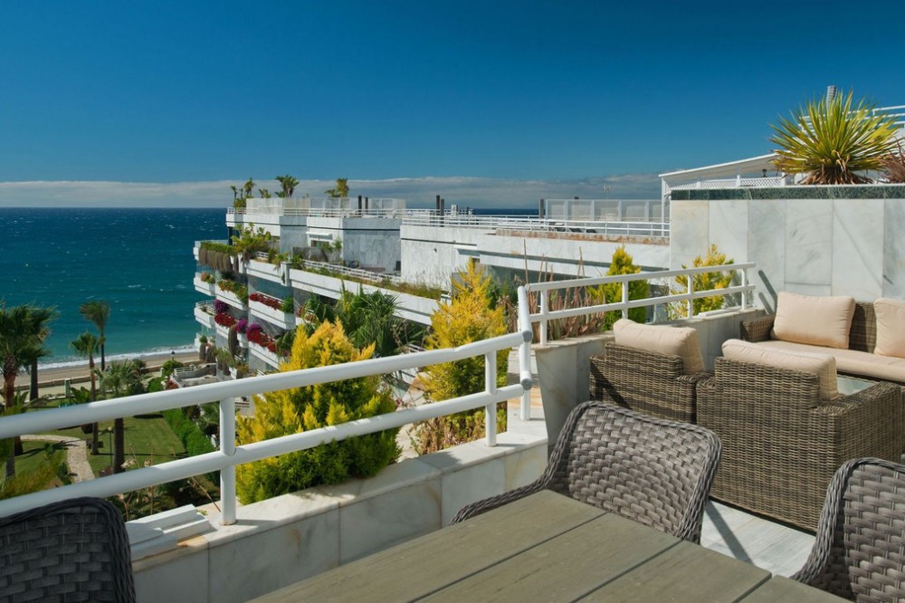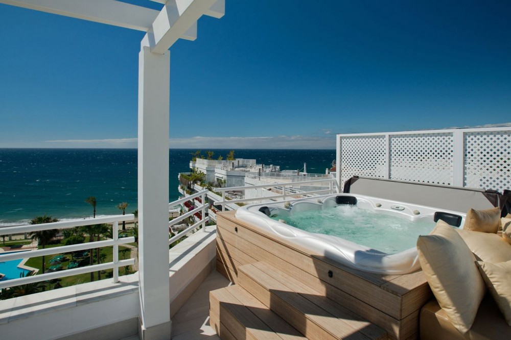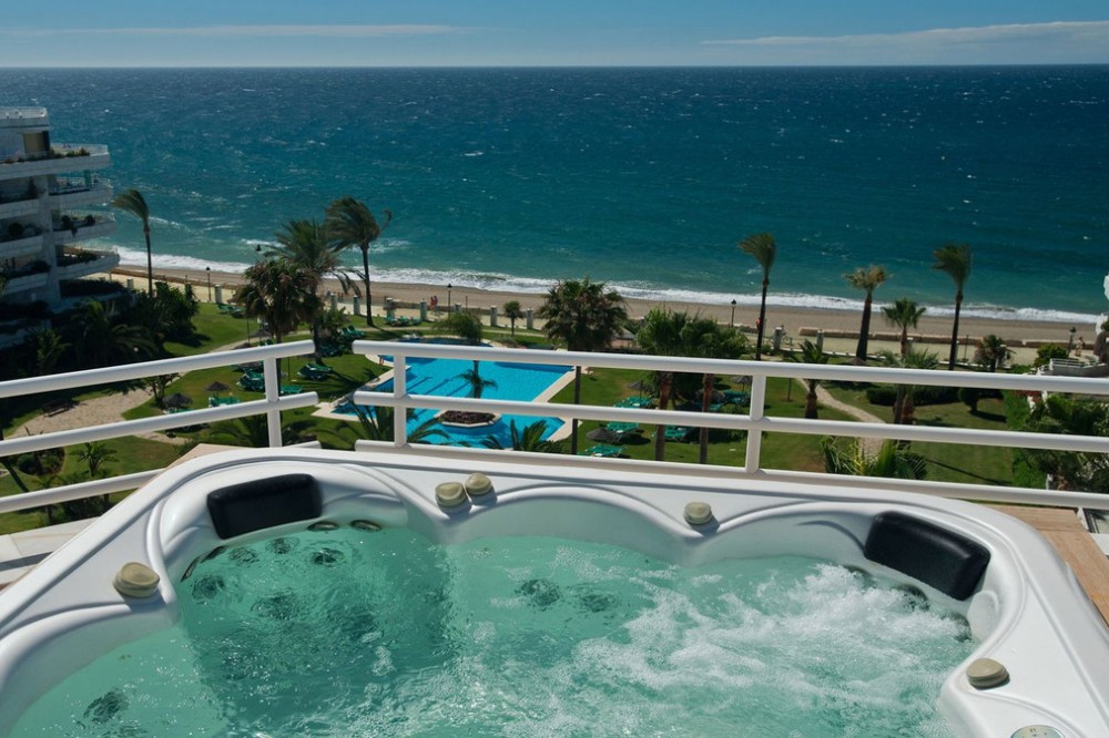 - Frontline Beach Penthouse – Playa Esmeralda, Marbella Golden Mile 3 Bedrooms | Rooftop Solarium with Jacuzzi | Panoramic Sea Views An extraordinary opportunity to own a luxury beachfront penthouse in the prestigious Playa Esmeralda residence, located on Marbella’s iconic Golden Mile. This exclusive property offers uninterrupted views of the Mediterranean Sea, stretching from the Bay of Marbella to Puerto Banús and Gibraltar, all from one of the most sought-after addresses on the Costa del Sol. The penthouse features a spacious open-plan living and dining area filled with natural light, seamlessly connecting to a large south-facing terrace overlooking the sea. A separate modern kitchen is fully equipped with high-end appliances and ample storage, making it as functional as it is stylish. The home includes three generous bedrooms: a master suite with an en-suite bathroom and terrace access, and two further bedrooms that share a beautifully finished full bathroom. Throughout the home, luxurious details such as marble flooring, double-glazed windows, and central air conditioning provide both comfort and quality. One of the standout features of this property is the expansive private rooftop solarium. Designed for both relaxation and entertaining, it boasts a large jacuzzi, a shaded dining area with BBQ facilities, and multiple sunbathing zones — all with breathtaking panoramic sea views. Whether hosting guests or enjoying quiet sunsets, this rooftop space offers the ultimate outdoor living experience. Located within the secure, gated community of Playa Esmeralda, the property benefits from 24-hour security, beautifully landscaped tropical gardens, and a large communal swimming pool. Direct access to the beach and Marbella’s famous seaside promenade allows for effortless coastal walks to either Puerto Banús or Marbella town, passing by the iconic Marbella Club and Puente Romano resorts along the way. This penthouse also includes an underground parking space and a private storage room, adding further convenience and value. Situated close to world-class restaurants, designer boutiques, beach clubs, golf courses, and top international schools, the location is second to none. Rarely does a frontline beach penthouse of this calibre become available on the Golden Mile. Whether you’re looking for a luxurious permanent residence, a prestigious holiday home, or a secure long-term investment, this is a property that delivers on all fronts. Contact us today to arrange a private viewing.
