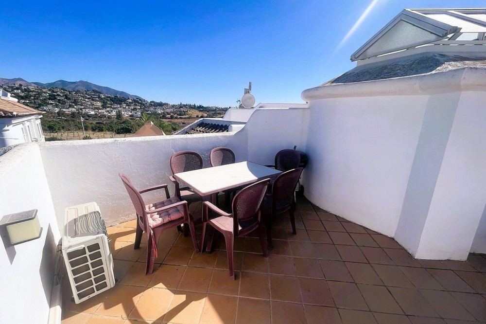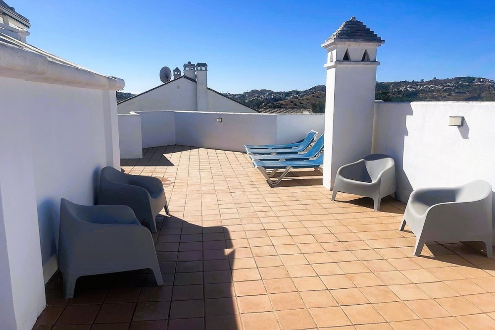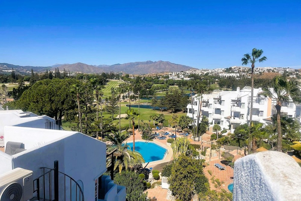 - Beautiful frontline golf penthouse with solarium and holiday rental license – Mijas Golf Located in an exclusive resort-style development, this charming penthouse offers the perfect balance of comfort, style, and natural surroundings. The community features two swimming pools and beautifully maintained gardens. The property offers 2 bedrooms, 2 bathrooms, a bright living-dining room with direct access to the terrace and a private solarium, ideal for enjoying the sun and the views. The kitchen is separate and fully equipped. It is sold furnished and ready to move in. Recently renovated, the penthouse is in very good condition, offering a fresh and modern atmosphere. Its location next to the golf course makes it ideal both as a permanent residence and as a holiday rental investment. Don’t miss this opportunity to live or invest in one of the most peaceful and attractive areas of the Costa del Sol.