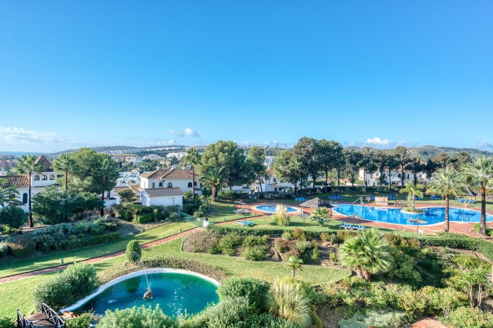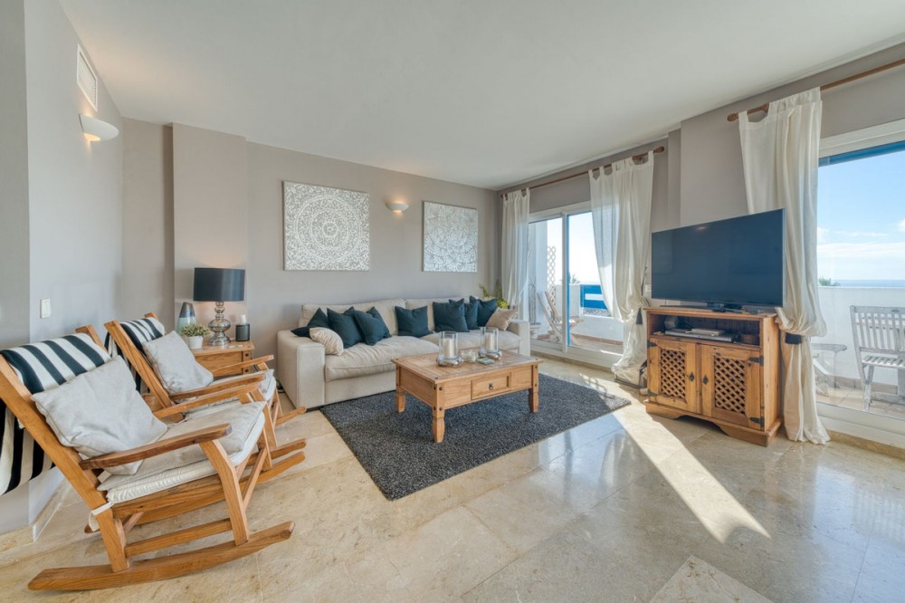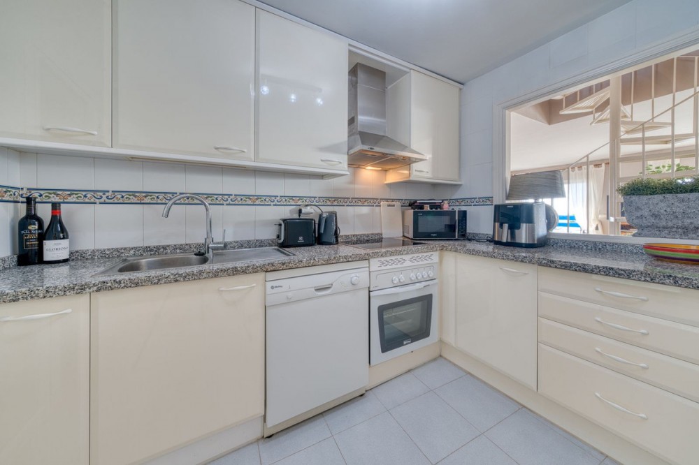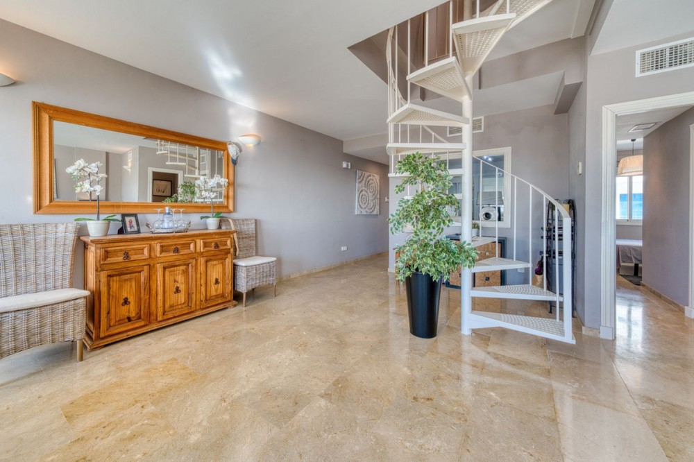 - Spacious Four-Bedroom Penthouse with Panoramic Sea and Marina Views | La Duquesa This impressive four-bedroom duplex penthouse is set within a highly sought-after 24-hour secure community in La Duquesa, offering exceptional value and breathtaking views. Beautifully maintained and generously proportioned, the property combines space, comfort, and an enviable coastal lifestyle. The apartment features four well-sized bedrooms and three bathrooms, including a master suite with en-suite facilities. The open-plan living and dining area leads onto a large terrace overlooking the landscaped gardens, swimming pool, and the sea beyond. Two additional terraces provide further outdoor space, with stunning south-westerly and north-easterly views across the Marina of La Duquesa. Interior finishes include elegant cream marble flooring throughout, a fully equipped kitchen, and a versatile upper-level bedroom or office. The community offers superb amenities, including three swimming pools, tennis courts, a barbecue area, lush gardens, and 24-hour security. Perfectly located just 350 metres from shops and restaurants, and only a 14-minute walk from the beach and Marina, this property offers the convenience of coastal living without the need for a car. A private underground parking space and storage room complete this outstanding residence, one of the finest penthouses available in La Duquesa.