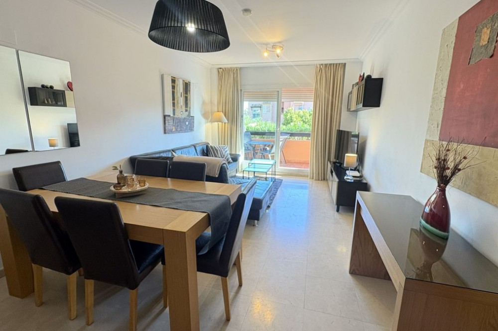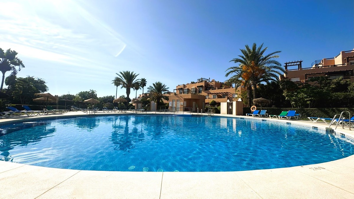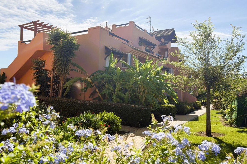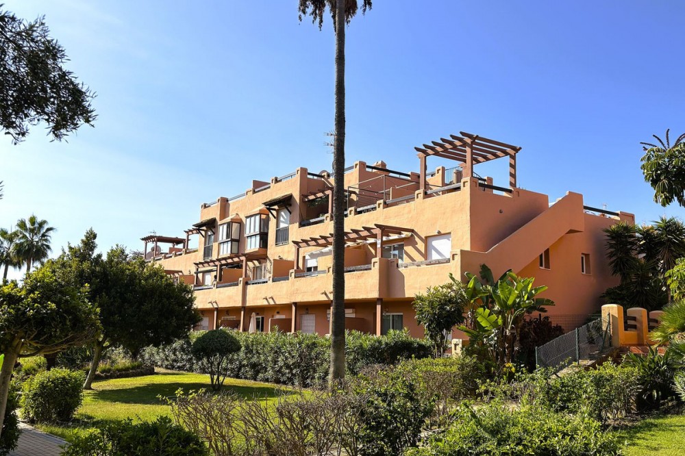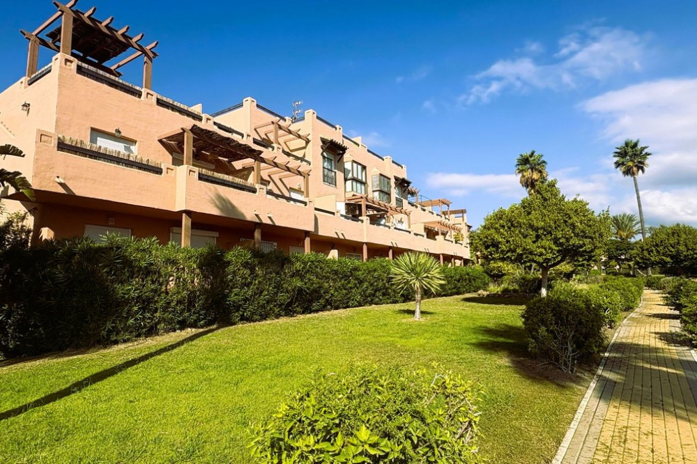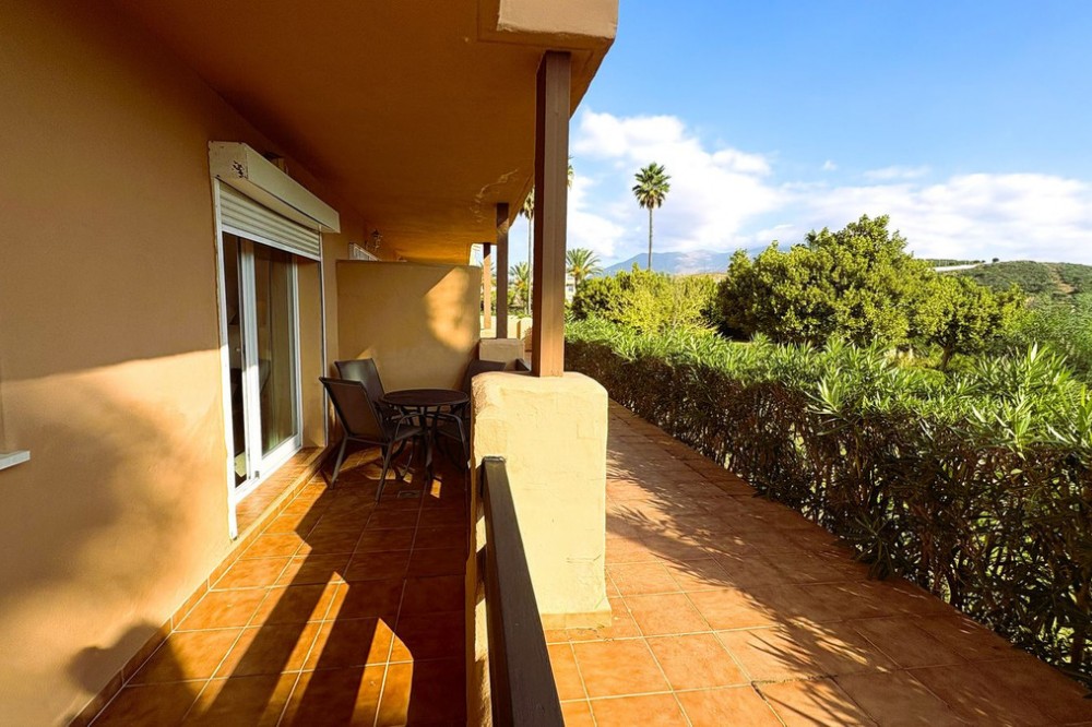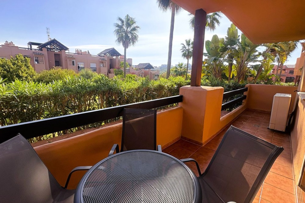- This beautifully presented two-bedroom, two-bathroom ground floor apartment is located in the highly sought-after gated community on the Casares Costa. This fabulous property has a good sized terrace with lovely views of the beautiful community gardens, perfect for enjoying the morning sun. Located in a beautifully maintained community, offering lush tropical gardens, a large swimming pool, 24-hour security, and an unrivalled sense of peace and privacy. Its prime location places the sandy beaches of Casares Costa within easy reach, along with golf courses such as Doña Julia, Finca Cortesin, and Casares Costa Golf. The lively marina of La Duquesa, the charming village of Sabinillas, and the beautiful town of Estepona are moments away, with Marbella, Gibraltar, and Málaga Airport all easily accessible. The interior of the property is in excellent condition and offered fully furnished. The bright lounge and dining area opens directly to the terrace, creating a seamless flow between indoor and outdoor living. A fully fitted kitchen with a separate utility room provides convenience, while the two generous double bedrooms feature fitted wardrobes. The master bedroom benefits from its own en-suite bathroom, and there is also an independent family shower room. High-quality finishes include marble floors, hot and cold air conditioning, and an electric sunblind in the living room. The property also includes private underground parking and a large storeroom for added convenience. The terrace is east facing, capturing the soft morning sun while enjoying serene views of the landscaped surroundings. This terrace offers the possibility to be extended to double its size, creating an exceptional space for al fresco dining and outdoor living.