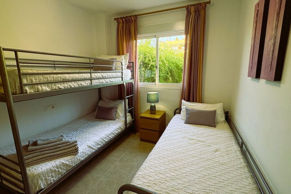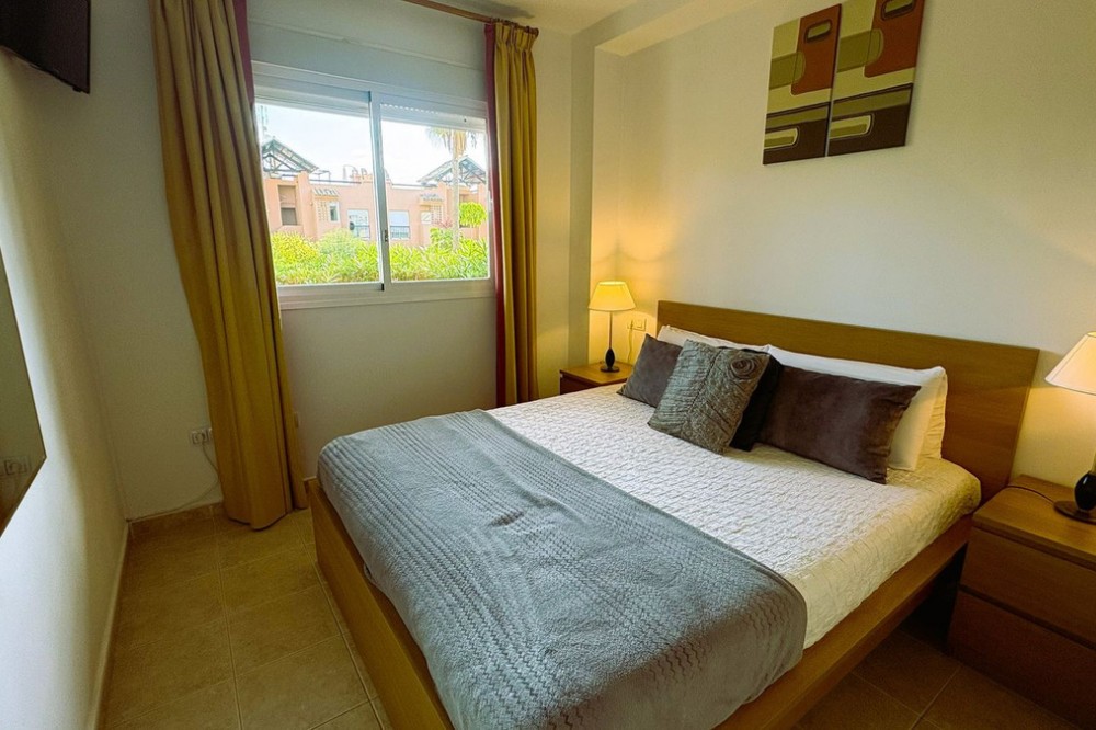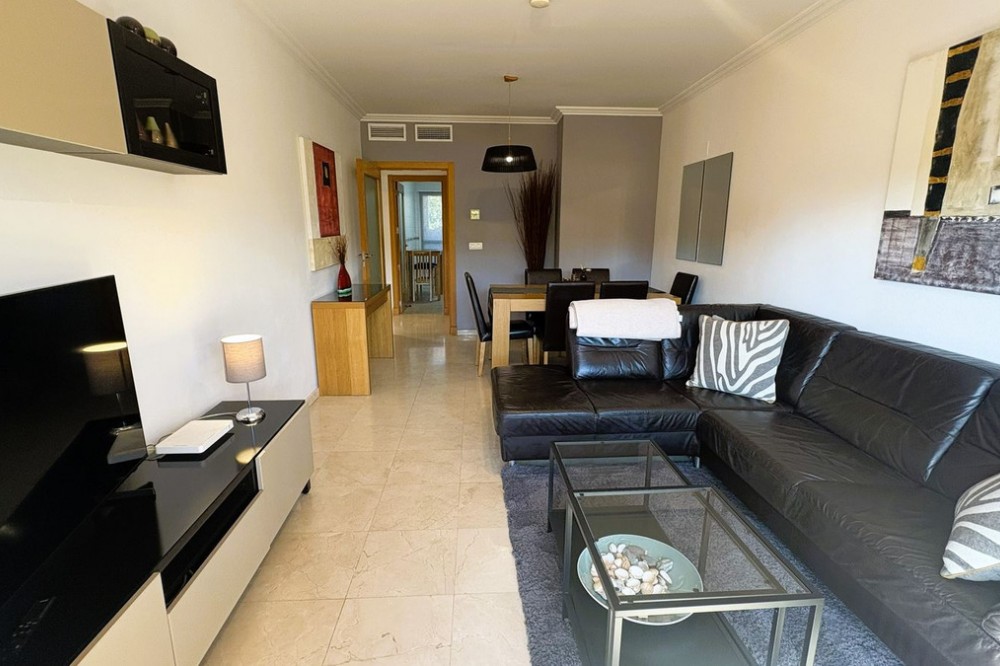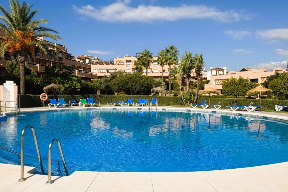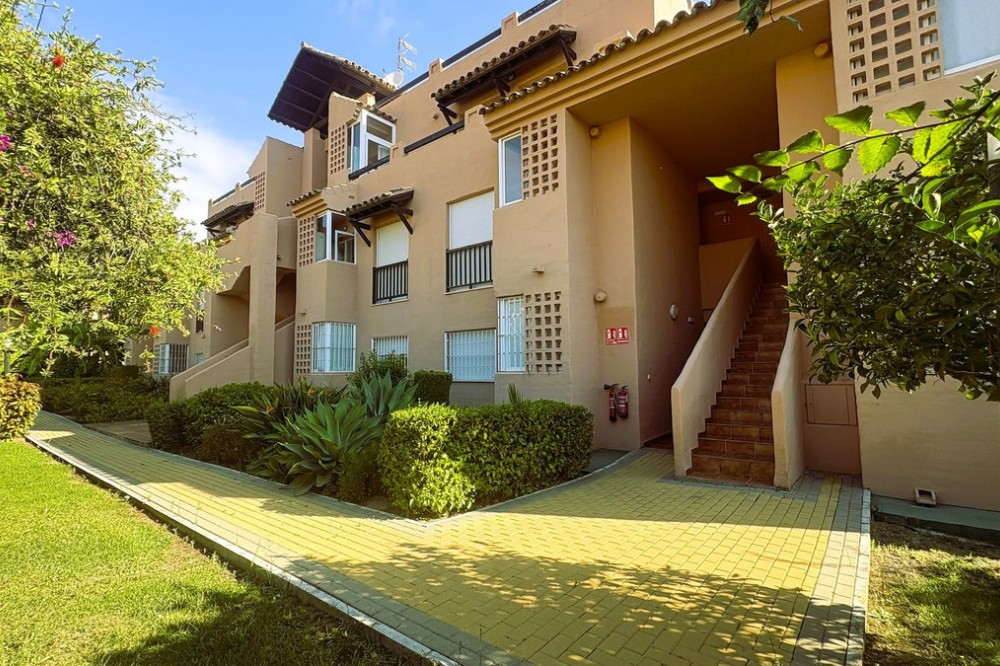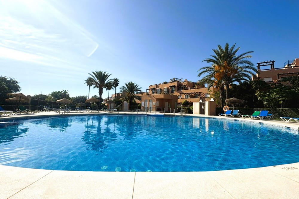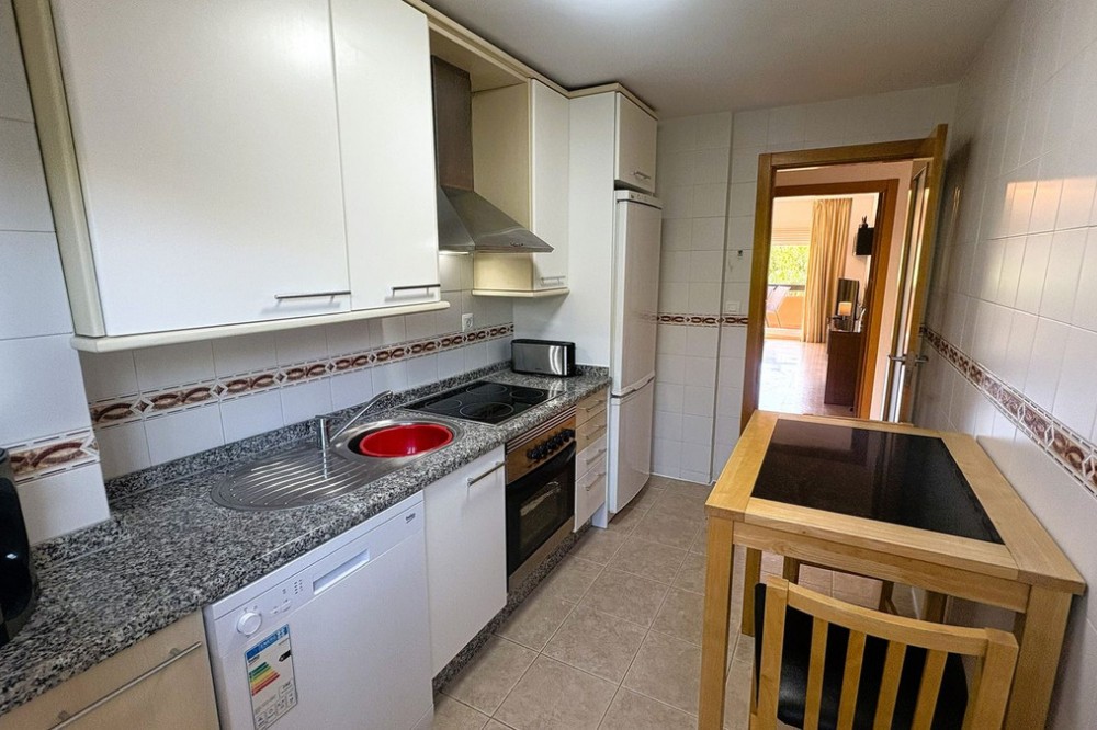- This beautifully presented two-bedroom, two-bathroom ground floor apartment is located in the highly sought-after gated community on the Casares Costa. This fabulous property has a good sized terrace with lovely views of the beautiful community gardens, perfect for enjoying the morning sun. Located in a beautifully maintained community, offering lush tropical gardens, a large swimming pool, 24-hour security, and an unrivalled sense of peace and privacy. Its prime location places the sandy beaches of Casares Costa within easy reach, along with golf courses such as Doña Julia, Finca Cortesin, and Casares Costa Golf. The lively marina of La Duquesa, the charming village of Sabinillas, and the beautiful town of Estepona are moments away, with Marbella, Gibraltar, and Málaga Airport all easily accessible. The interior of the property is in excellent condition and offered fully furnished. The bright lounge and dining area opens directly to the terrace, creating a seamless flow between indoor and outdoor living. A fully fitted kitchen with a separate utility room provides convenience, while the two generous double bedrooms feature fitted wardrobes. The master bedroom benefits from its own en-suite bathroom, and there is also an independent family shower room. High-quality finishes include marble floors, hot and cold air conditioning, and an electric sunblind in the living room. The property also includes private underground parking and a large storeroom for added convenience. The terrace is east facing, capturing the soft morning sun while enjoying serene views of the landscaped surroundings. This terrace offers the possibility to be extended to double its size, creating an exceptional space for al fresco dining and outdoor living.