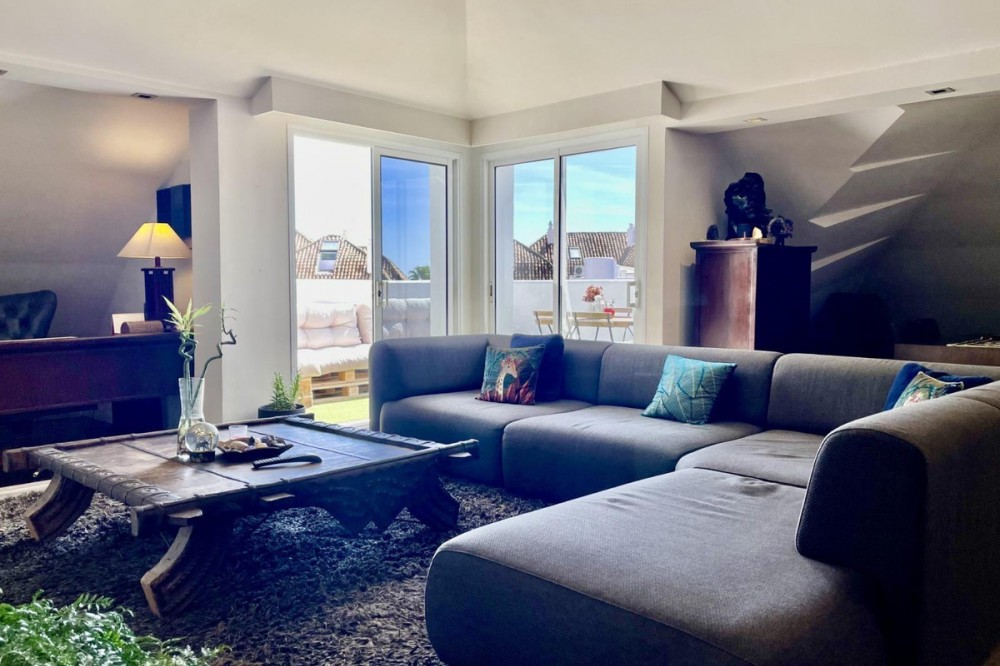- Stylish Loft-Style Penthouse in Las Lomas del Marbella Club This unique loft-style penthouse is located in the highly sought-after Las Lomas del Marbella Club, one of Marbella’s most prestigious addresses. Set within an exclusive gated community, residents enjoy 24-hour concierge and security services, ensuring both comfort and peace of mind. The urbanization also boasts beautifully maintained gardens and three swimming pools, one of which is heated during the spring season. The apartment is accessed via a private entrance hall, with stairs leading to a bright and spacious main floor. The open-plan living and dining area is designed in a modern loft style, featuring high ceilings and large windows that flood the space with natural light. A fully equipped kitchen complements the living area, creating a seamless flow for everyday living and entertaining. There are two generously sized bedrooms and two bathrooms, including a master suite with direct access to the terrace. The living room and master bedroom both open onto a sunny, south and east-facing wraparound terrace offering sweeping views of the mountains and landscaped gardens—a perfect setting for relaxing or dining al fresco. The property also includes a large underground parking space and a private storage room. Ideally located just five minutes from Puente Romano and the Golden Mile’s top dining, shopping, and beaches, this penthouse is an exceptional lifestyle property. Please note: Short-term holiday rentals are not permitted under the current community statutes, making it ideal for private use or long-term stays rather than as an investment property.