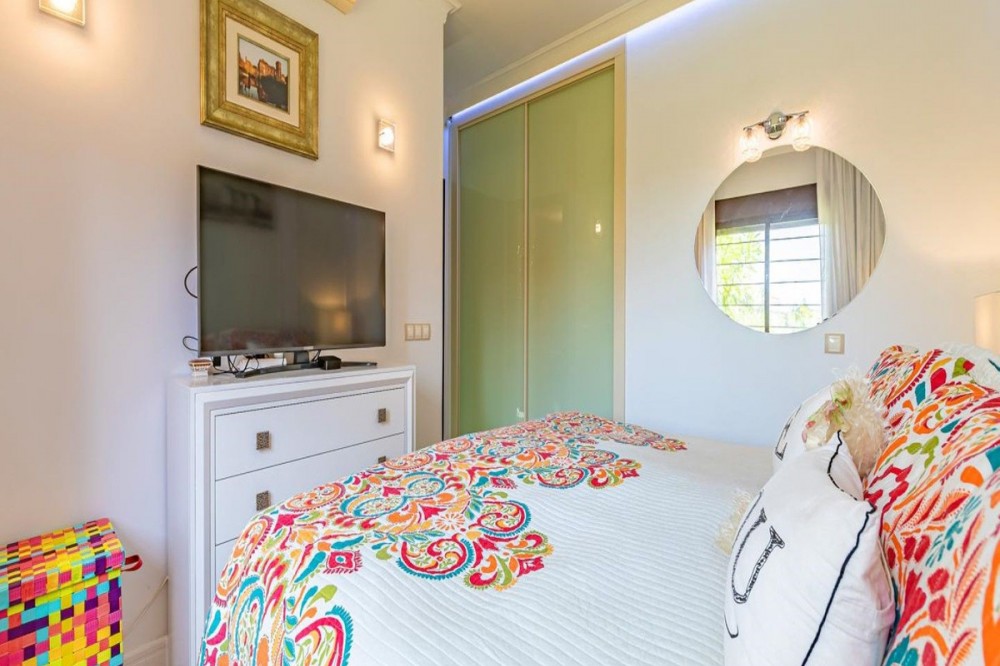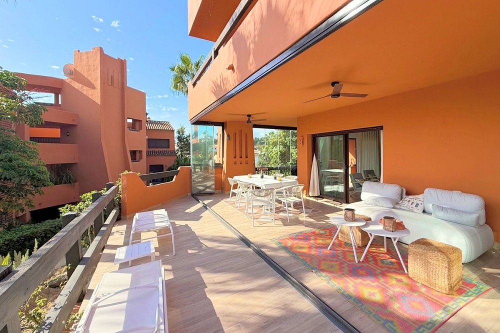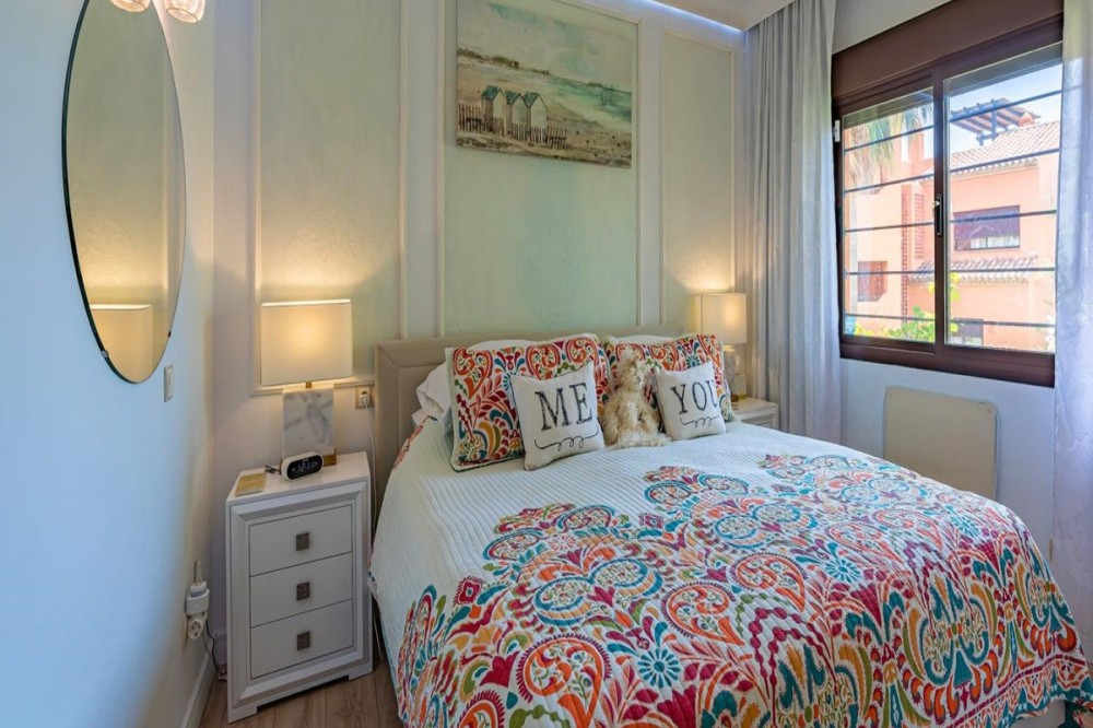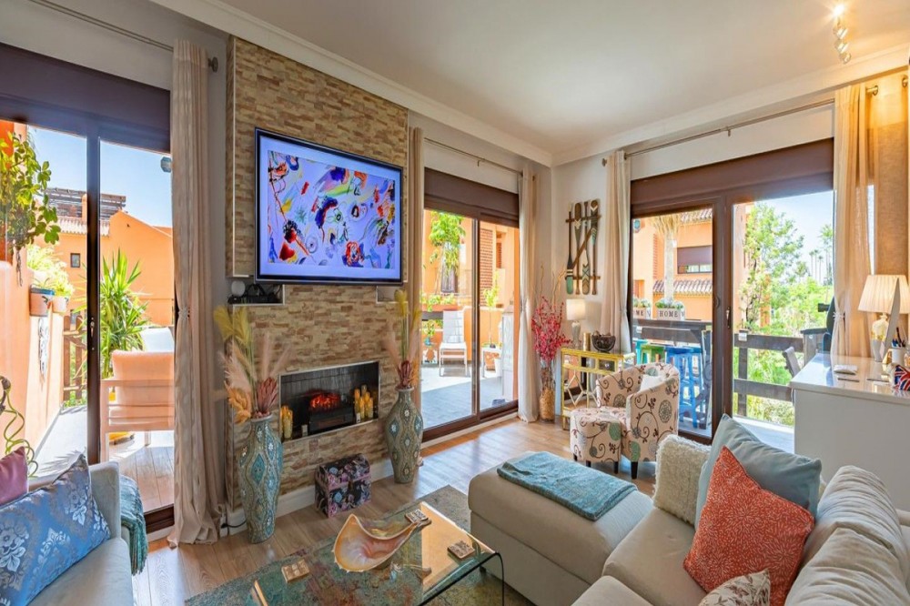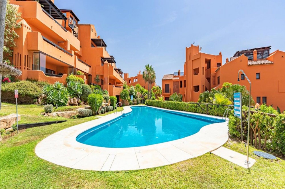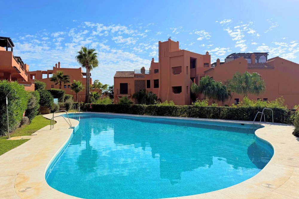 - GROUND-FLOOR APARTMENT WITH LARGE TERRACE AND TOURIST LICENSE NEAR THE SEA. Privileged location in a charming Mediterranean-style complex, just 200 m from the beach and only a 5-minute drive from Estepona and the vibrant Duquesa Marina, where you’ll find all kinds of services, restaurants, and leisure options. This beautiful ground-floor apartment stands out for its brightness, thanks to its southeast orientation, and for its magnificent newly renovated terrace, featuring glass curtains, an outdoor kitchen area, and elegant parquet flooring that adds warmth and style. The property, built with high-quality materials, offers two spacious bedrooms, carefully redesigned lighting that enhances every corner, and a practical anti-limescale system for greater comfort. From the terrace, you can enjoy pleasant views of the lush gardens, the communal pool, and a partial sea view. Located in a quiet and well-maintained community with a swimming pool and large green areas, this apartment also includes a parking space and a storage room. With a **tourist license obtained this year**, it represents an excellent opportunity both as an investment with high rental potential and as a cozy home by the sea. **A must-see — you’ll love it!**