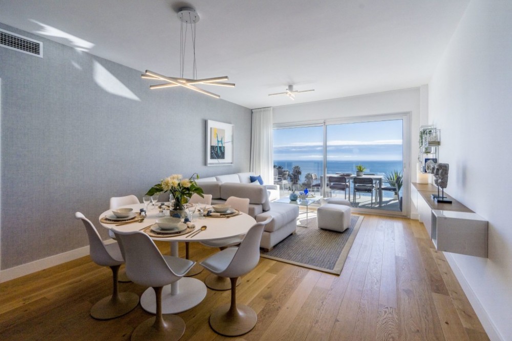 - 2 bed, 2 bath apartments SOLD OUT! 3 bed, 2 bath apartments SOLD OUT! 4 bed, 2 bath duplex penthouses from 963.000 euros (only 2 left) Prices excl. 10% VAT / READY FOR OCCUPATION! Located only a few hundred meters from the Mediterranean Sea in Mijas Costa. These modern and spacious apartments and penthouses are located in a quiet and beautifully maintained urbanization, yet close to all amenities. From the living room you have access via sliding doors to the very large terrace facing south with panoramic views over the communal gardens, the pool, mountains and the sea. The main bedroom with fitted wardrobes has an ensuite bathroom with bath and separate shower. The complex is gated and has 24 hour security. There is a private garage space in the underground garage with lifts to all levels There is a supermarket, bar, restaurant and a bus stop to Fuengirola only 400 meters away. The beach is walking distance, and is accessible via a footbridge over the coastal road. Fuengirola is the nearest town, within 10 minutes' drive. Here you will find the indoor Miramar shopping center, zoo, water park Aguapark, the beach with harbour and nightlife. The apartment is located halfway between Malaga and Marbella are both about 25 minutes away with the beautiful Puerto Banus a further 10 minutes west. There are several award winning golf courses in the vicinity. One: the 18-hole El Chaparral Golf Club just a few minutes' drive.