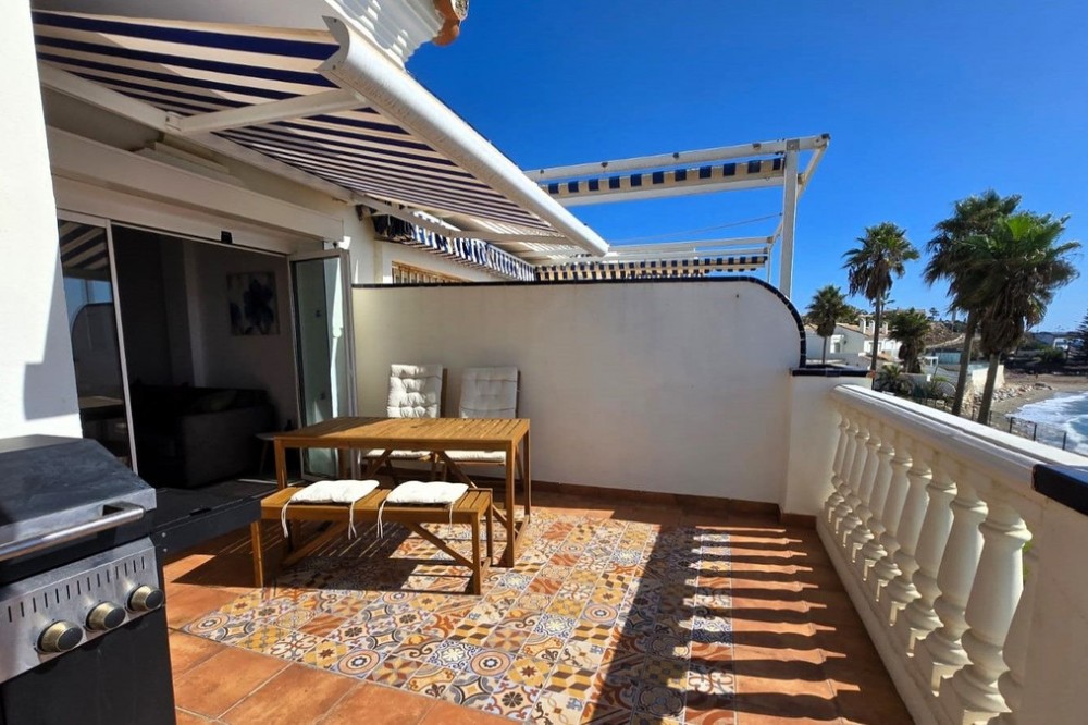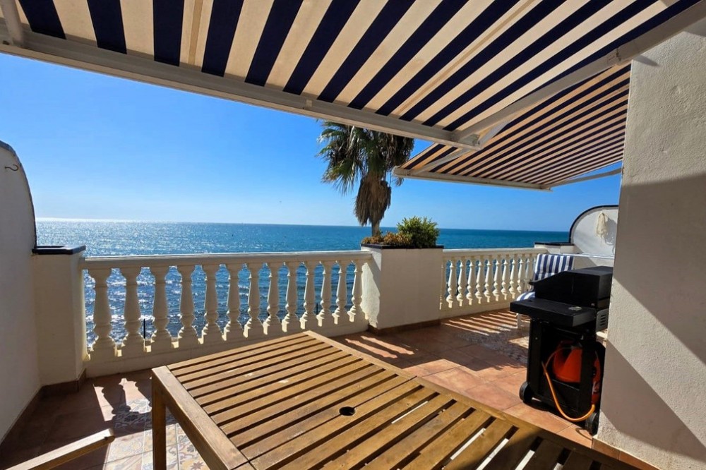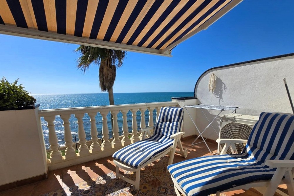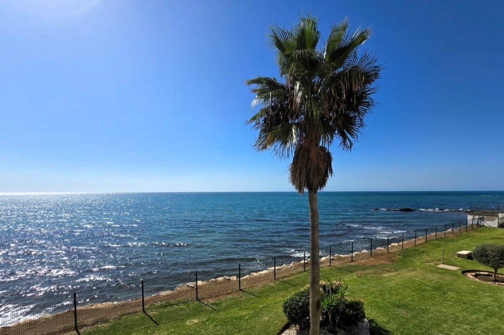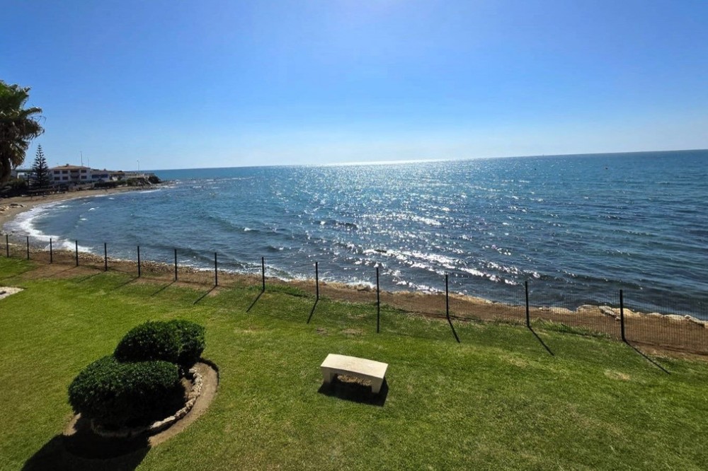 - Exceptional front-line beach property newly listed in Akardia Beach. Located in the highly desirable Maona Urbanization, we are pleased to present this beautiful two-bedroom apartment offering unobstructed views of the Mediterranean Sea and Arkadia Beach. Just a short walk to the historic lighthouse and beachfront access, this apartment benefits from its location on the beachside of the coastal motorway, ensuring a peaceful environment free from noise pollution. Nearby amenities include Cala de Mijas (3 minutes), Myarma Shopping District (3 minutes), Marbella (15 minutes), and Malaga International Airport (15 minutes). Upon entering this spacious and welcoming residence through the open-concept kitchen and living area, you will be immediately captivated by the spectacular sea views provided by the floor-to-ceiling sliding glass doors. Its south-facing orientation allows for abundant sunlight throughout the year, which can be enjoyed from both the interior and exterior balcony. The kitchen has been recently upgraded with modern cabinetry and appliances. The master bedroom features floor-to-ceiling Venetian-style double-pane windows, filling the space with natural light and offering panoramic sea views. Large enough to accommodate a king-size bed, it also includes built-in wardrobes and an en-suite bathroom. The second bathroom contains a walk in shower and separates the master bedroom from the second bedroom, with the main living area situated to the side. Opening the sliding glass doors creates an indoor-outdoor living experience, with the terrace located only 20 meters from the beach. With an area of 27 square meters, the terrace is spacious enough to accommodate a grill and dining for up to eight guests, with additional space for a lounge area. The property also includes exclusive parking for two vehicles just outside the entrance and a private storage room for convenience.