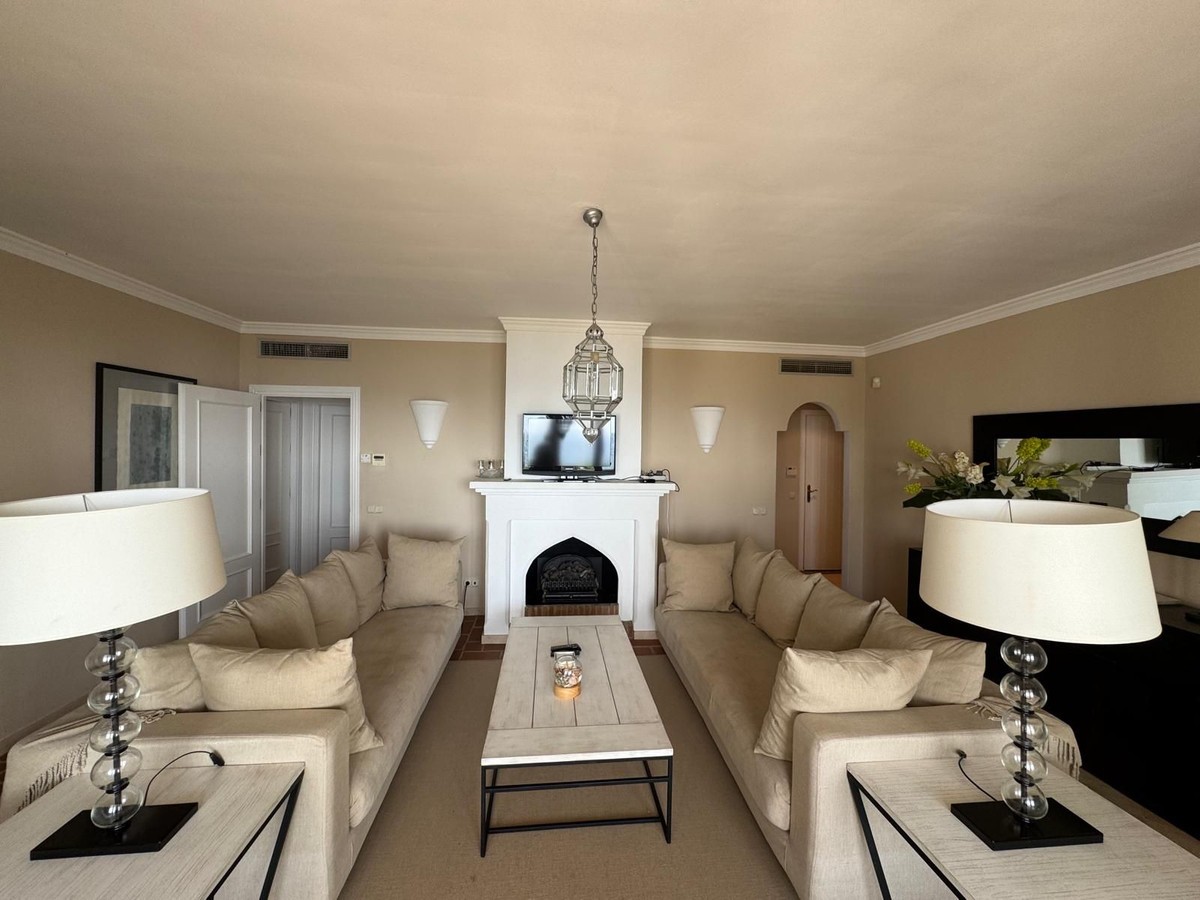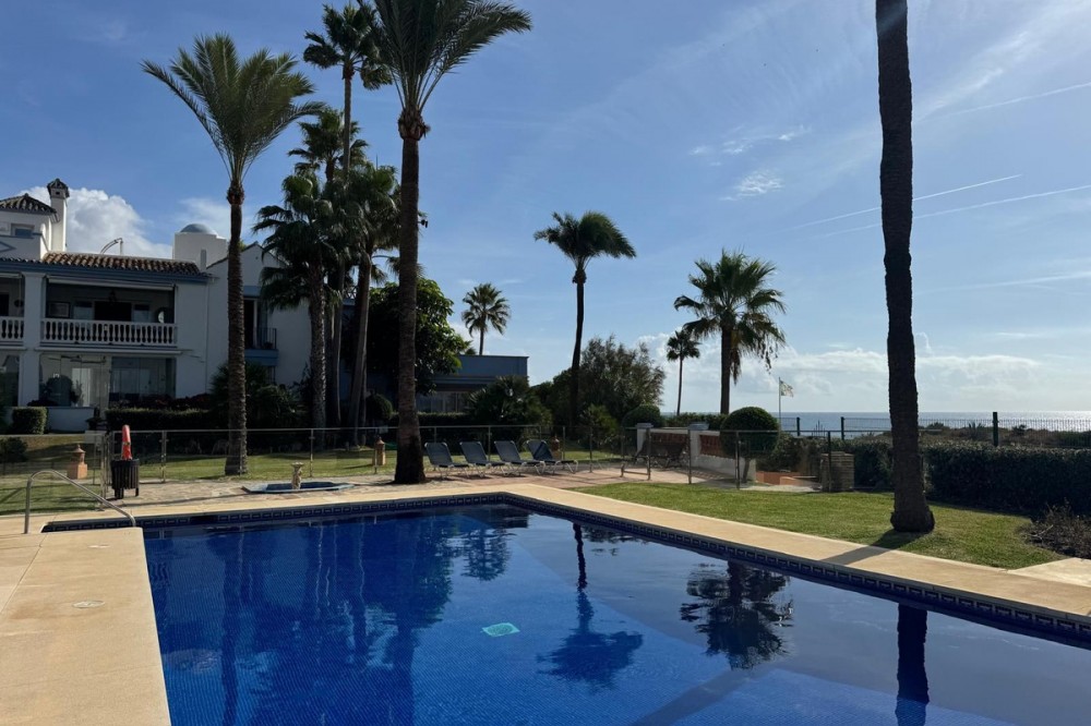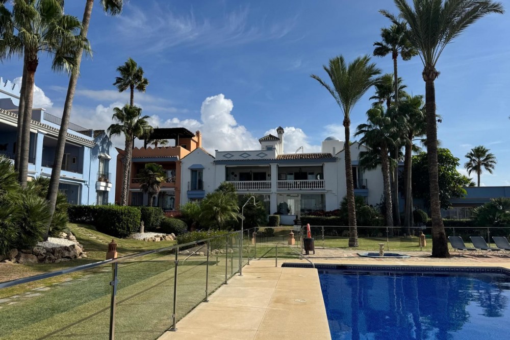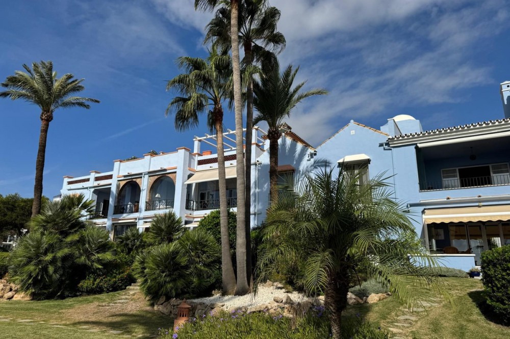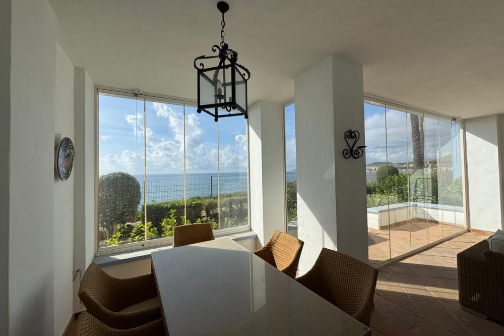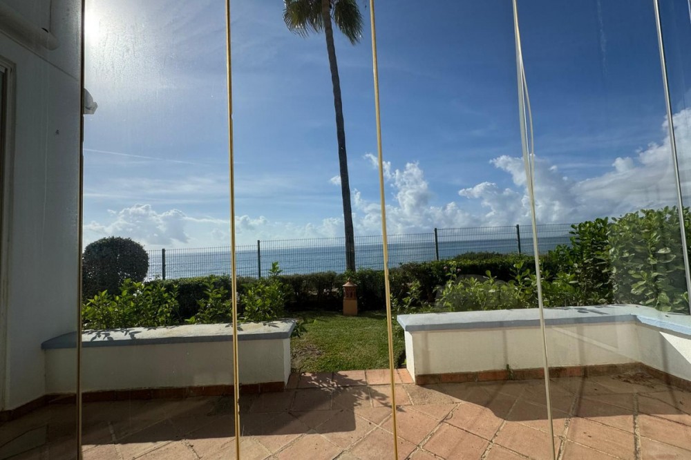 - Beautiful 3-bedroom ground floor apartment facing the sea, located in one of the best residential areas in the area. A high-quality, fully furnished flat. The living/dining room has a fireplace, is very bright and opens onto a covered glassed-in terrace of over 60m² with spectacular sea views. The kitchen is separate and also enjoys the views, as does the master bedroom with its en-suite bathroom. The property is sold with a garage and storage room included. The development is gated with surveillance cameras and night security patrols. Several swimming pools, one of which is heated, in a paradisiacal setting, right on the beachfront. If you want to live in the best of the Costa del Sol, near Estepona, Sotogrande and Marbella, don't wait any longer and request a viewing. There's nothing better than seeing this wonderful property with your own eyes.