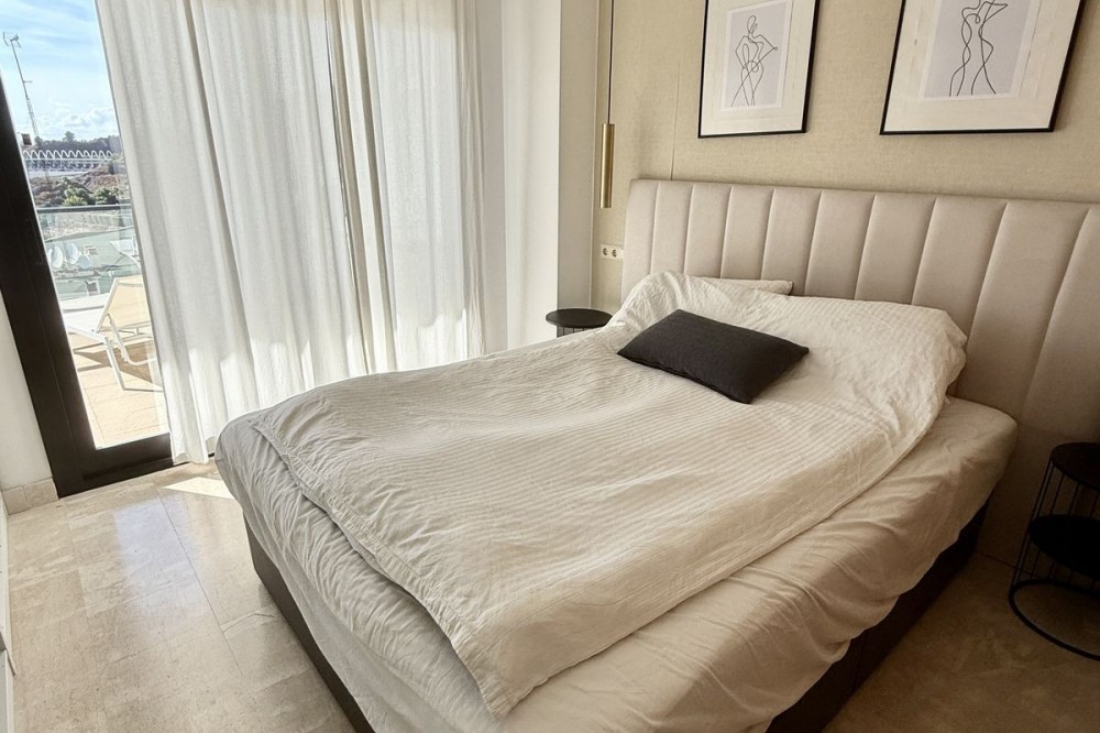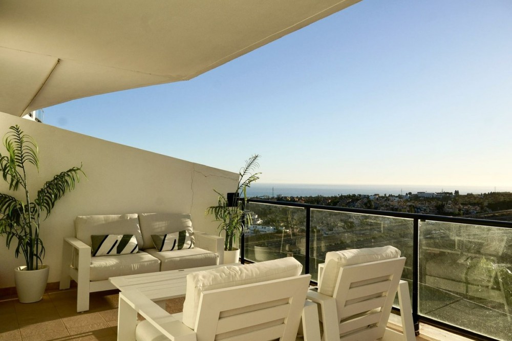 - FABULOUS PANORAMIC SEAVIEWS AND FULLY REFORMED APARTMENT!!! This immaculate and bright property comprises of entrance hall, luxury fully fitted open plan kitchen, lounge/dining room with patio doors leading to an amazing full apartment width terrace, south west facing for almost all day long sunshine and enjoying the most incredible sunset and sea views. In addition there are 2 double bedrooms with fitted wardrobes and 2 bathrooms. Accessed via lift or stairs, the property has a large underground carparking space and storage room. Sold with quality furnishings also. The community is immaculately kept and subtropical plants, lawns and of course the fabulous swimming pool! Riviera del Sol has beautiful beaches, an award winning golf course, tennis clubs and lots of bars, restaurants and shops. Easy access to the toll road motorway for speedy travel too! And, the apartment is sold with a holiday rental licence. Apartment built size 79m2 Garage 29m2 Storeroom 8m2