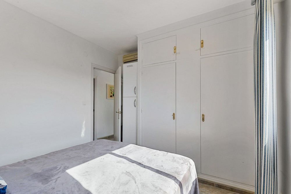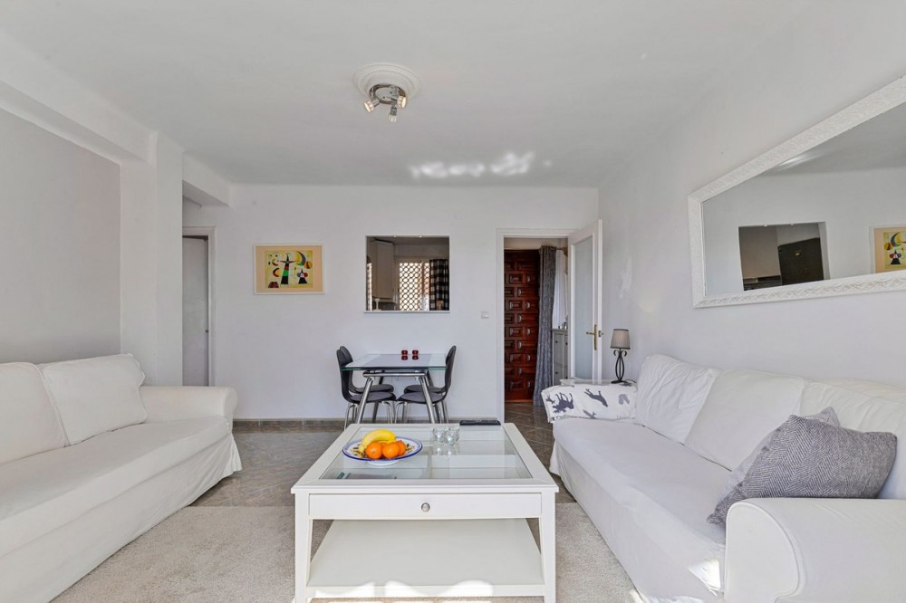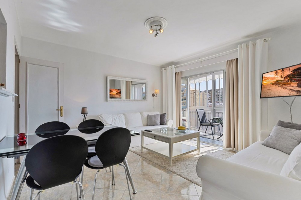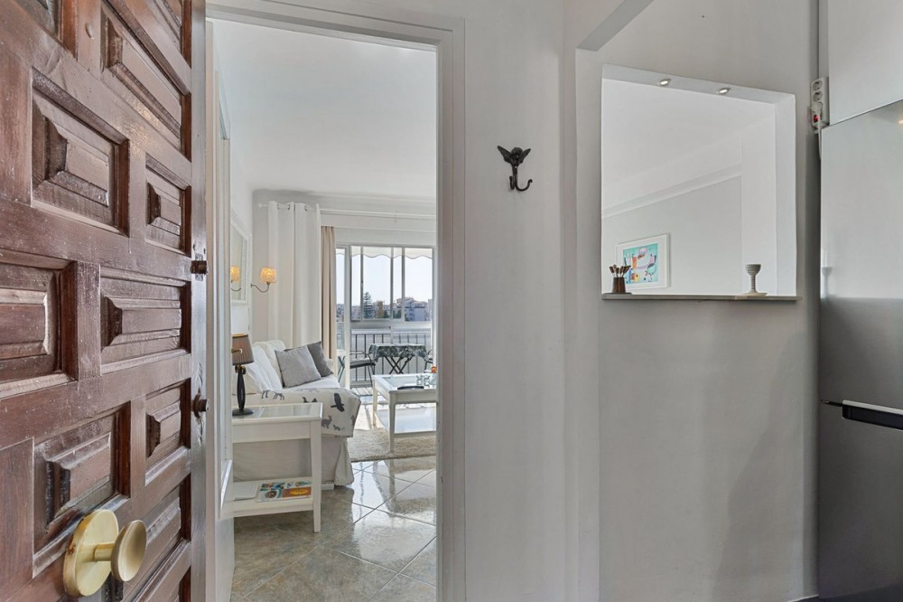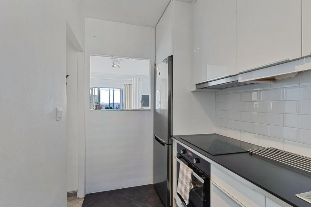 - Bright corner apartment in Los Boliches only 10 minutes walk from the beach. Lovely southwest location with open views of the sea, mountains and green area. The apartment is in very good condition and has a small entrance hall, fully equipped kitchen, two bedrooms and a bathroom with shower and washing machine. From the living room there is access to an in-glazed terrace with space for a dining table and 4 chairs. The apartment is located on the 6th floor, the building has two elevators. Convenient walking distance to supermarkets, restaurants, train station etc. The apartment is sold furnished.
