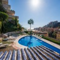- Just 20 minutes from Malaga Airport, within walking distance of Benalmádena Costa beach, restaurants and a supermarket, and close to the famous Torrequebrada golf course, you will find this luxury urbanisation 'VistaQuebrada'. This residential complex is located on a hillside and therefore offers stunning views of the sea, the mountains and the surrounding area. Next to the resort is a small shopping centre, a Mercadona supermarket and an international school. The promenade with its many cosy 'Chiringuitos' (beach bars) and the N340 coastal road are opposite the urbanisation and therefore very easily accessible. Just a short drive from 'VistaQuebrada' are the famous villages of Benalmádena Pueblo, Arroyo de la Miel, La Carihuela, Torremolinos, Fuengirola and the famous marina of Benalmádena, “Puerto Marina”, with its many shops, restaurants and vibrant nightlife. The 3-bedroom apartment, which is in excellent condition has a living area of 120m2, faces south-west and is located on the 1st floor. Through the main entrance there is a wheelchair lift to the normal lift which takes you to both the different floors and the indoor garage. The flat is therefore easily accessible for wheelchairs. The neutrally decorated flat is fully furnished, equipped with air conditioning/heating and has fast Wi-Fi. The open and spacious kitchen offers various built-in appliances, including a dishwasher, oven, microwave, fridge/freezer and a ceramic hob. From the kitchen you have access to a private patio of 35m2 wich can be used in many ways. From the dining/living room with a cosy fireplace there is direct access to the spacious terrace of 40m2 with sea views and space for both various sun loungers and a dining area for 6 people. The spacious master bedroom has fitted wardrobes and direct access to the terrace. The en-suite bathroom has double sinks, a bath/shower and a toilet. The second bedroom has fitted wardrobes and also access to the terrace and, together with the third bedroom, shares a separate second bathroom with a bath/shower and a toilet. The flat also has a laundry area with a washing machine and a dryer. In the underground car park, there is a personal storage room and 2 private parking spaces. If you are looking for a unique and centrally located, wheelchair-friendly and spacious flat near the beach with sea views and plenty of sun, make an appointment for a viewing without obligation!