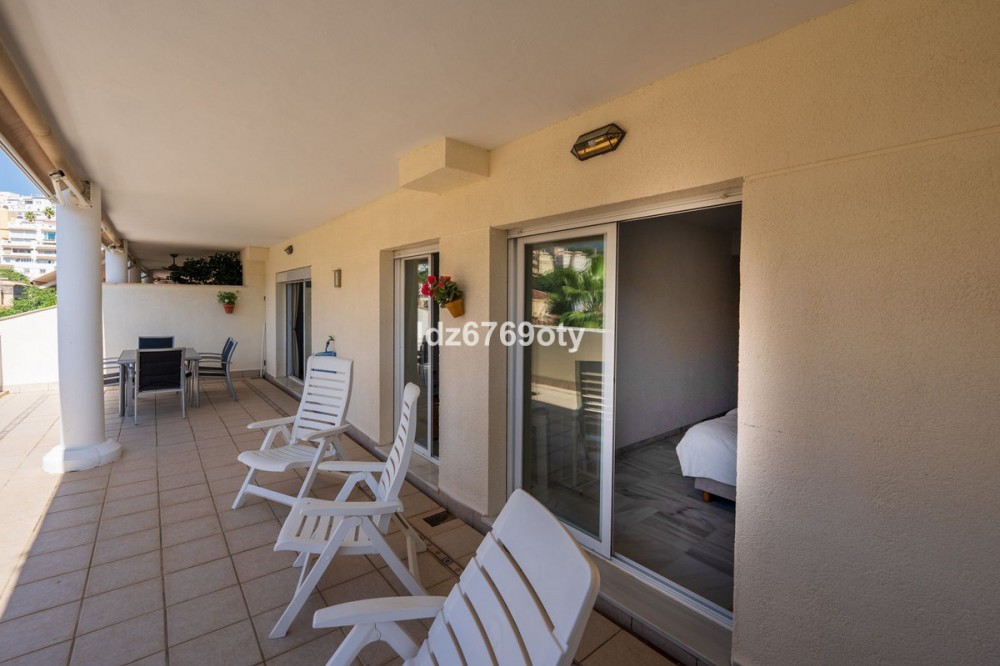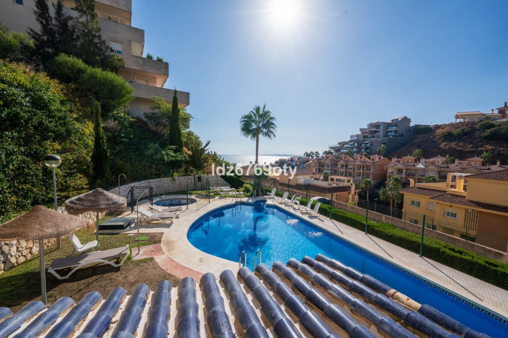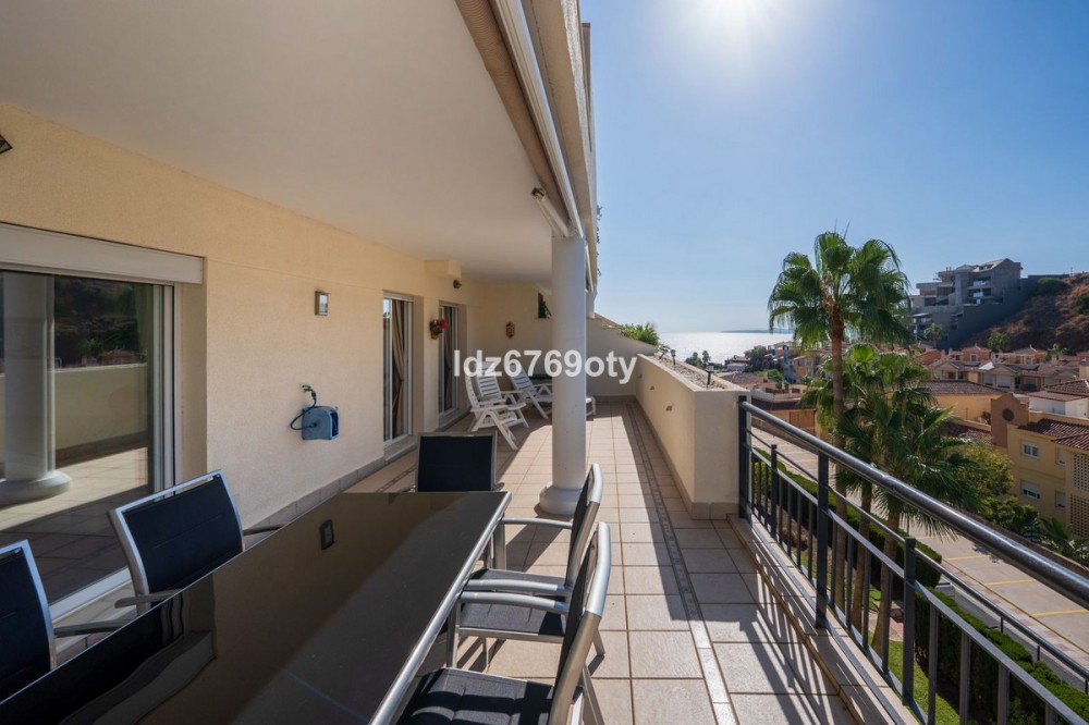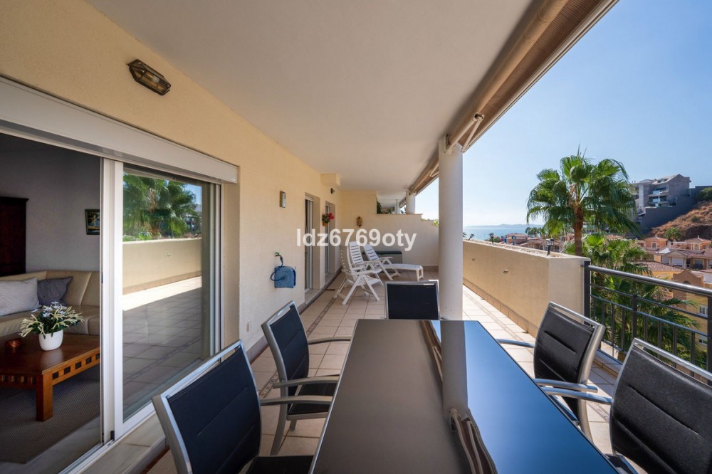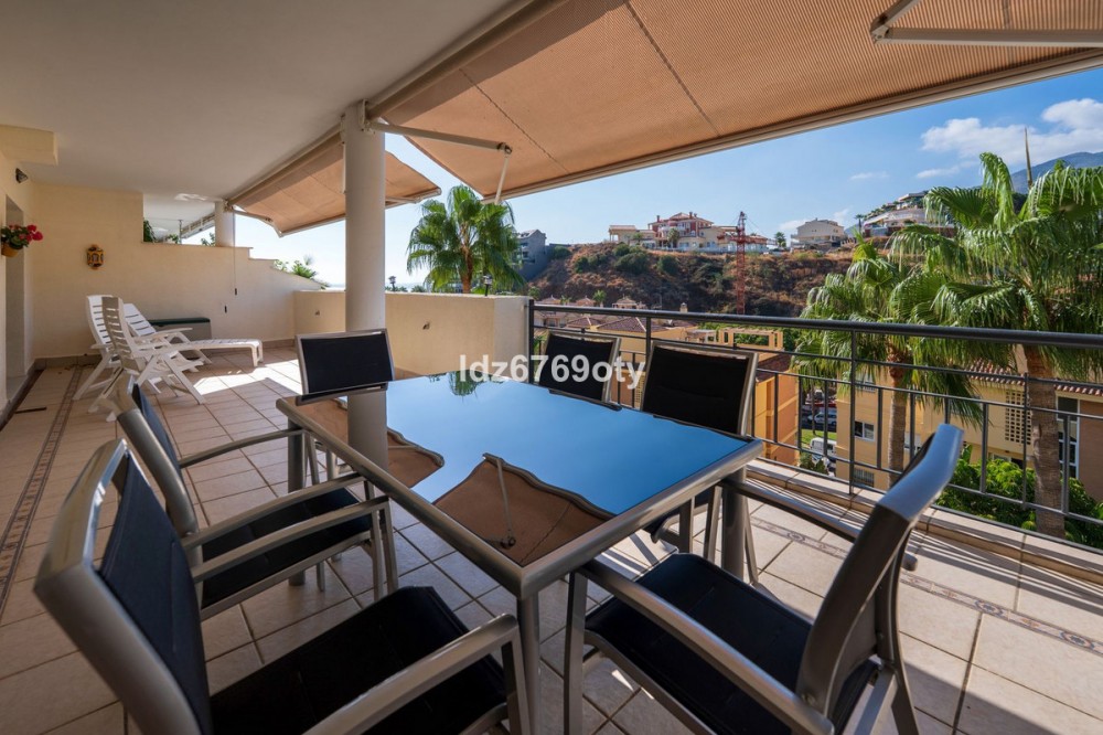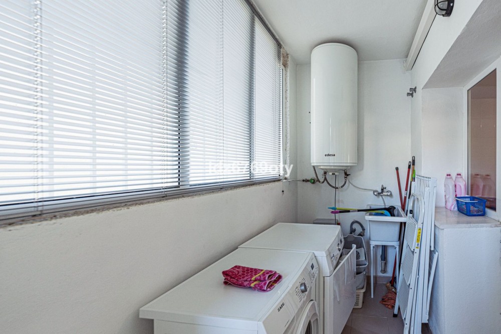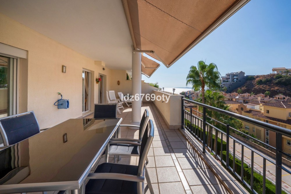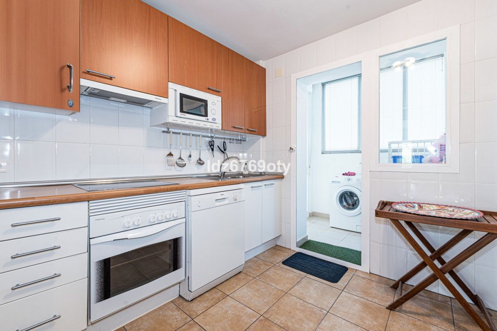 - Just 20 minutes from Malaga Airport, within walking distance of Benalmádena Costa beach, restaurants and a supermarket, and close to the famous Torrequebrada golf course, you will find this luxury urbanisation 'VistaQuebrada'. This residential complex is located on a hillside and therefore offers stunning views of the sea, the mountains and the surrounding area. Next to the resort is a small shopping centre, a Mercadona supermarket and an international school. The promenade with its many cosy 'Chiringuitos' (beach bars) and the N340 coastal road are opposite the urbanisation and therefore very easily accessible. Just a short drive from 'VistaQuebrada' are the famous villages of Benalmádena Pueblo, Arroyo de la Miel, La Carihuela, Torremolinos, Fuengirola and the famous marina of Benalmádena, “Puerto Marina”, with its many shops, restaurants and vibrant nightlife. The 3-bedroom apartment, which is in excellent condition has a living area of 120m2, faces south-west and is located on the 1st floor. Through the main entrance there is a wheelchair lift to the normal lift which takes you to both the different floors and the indoor garage. The flat is therefore easily accessible for wheelchairs. The neutrally decorated flat is fully furnished, equipped with air conditioning/heating and has fast Wi-Fi. The open and spacious kitchen offers various built-in appliances, including a dishwasher, oven, microwave, fridge/freezer and a ceramic hob. From the kitchen you have access to a private patio of 35m2 wich can be used in many ways. From the dining/living room with a cosy fireplace there is direct access to the spacious terrace of 40m2 with sea views and space for both various sun loungers and a dining area for 6 people. The spacious master bedroom has fitted wardrobes and direct access to the terrace. The en-suite bathroom has double sinks, a bath/shower and a toilet. The second bedroom has fitted wardrobes and also access to the terrace and, together with the third bedroom, shares a separate second bathroom with a bath/shower and a toilet. The flat also has a laundry area with a washing machine and a dryer. In the underground car park, there is a personal storage room and 2 private parking spaces. If you are looking for a unique and centrally located, wheelchair-friendly and spacious flat near the beach with sea views and plenty of sun, make an appointment for a viewing without obligation!