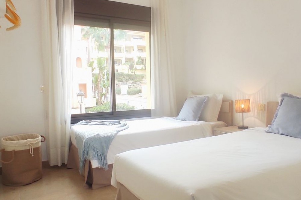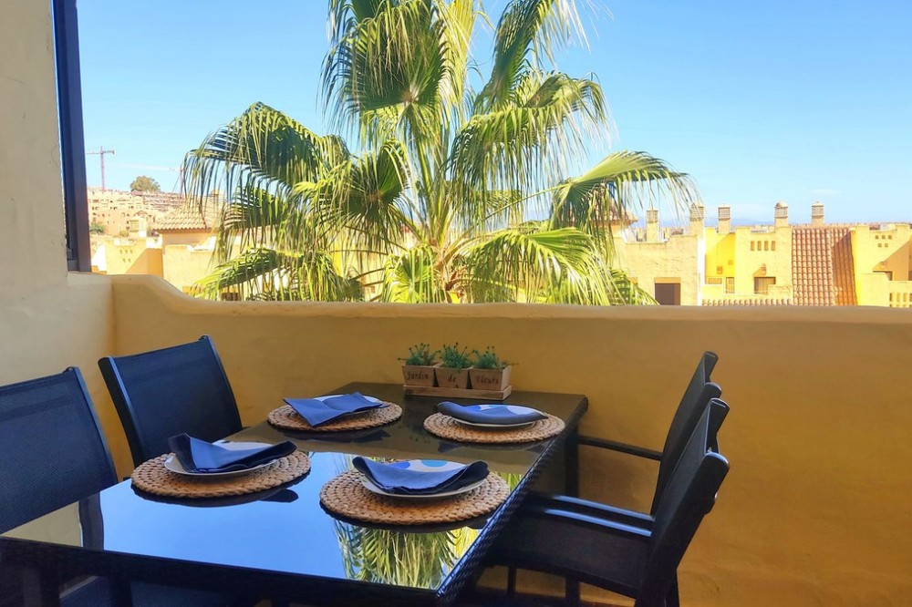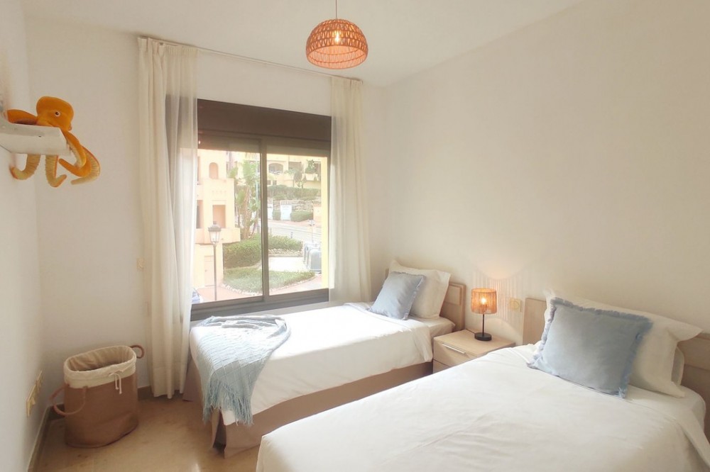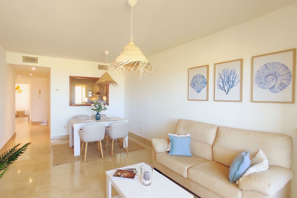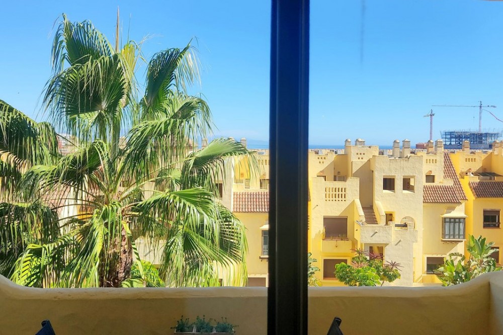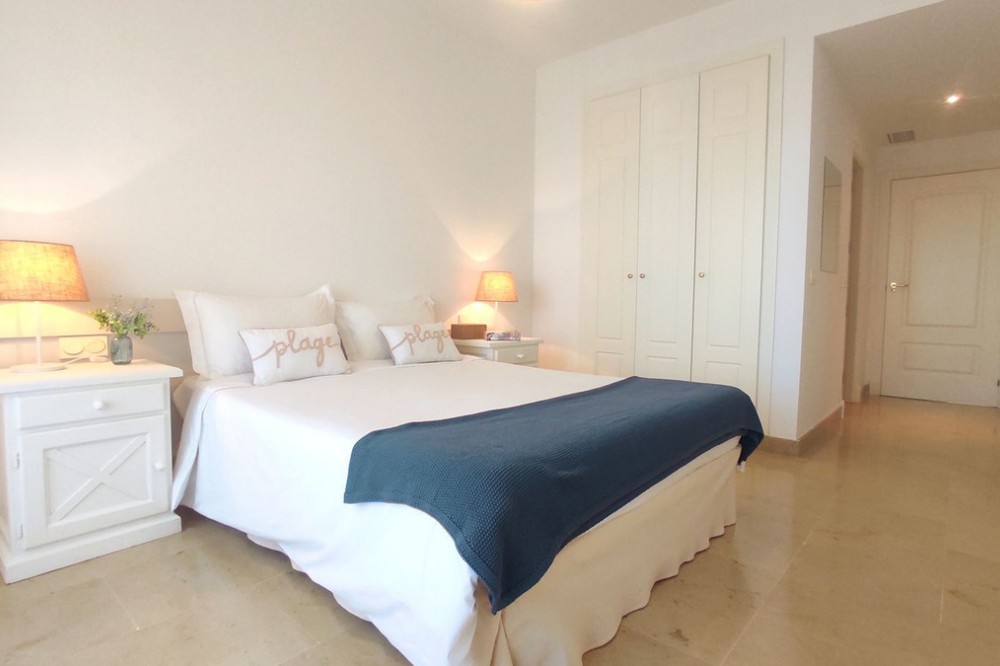 - Luxury 2-Bedroom Apartment Near the Picturesque Port of La Duquesa Located just 2.2 km from the charming Port of La Duquesa, the most picturesque and inviting marina on the Costa del Sol, known for its long sandy beaches and outstanding seaside restaurants, this impeccably renovated apartment offers the perfect blend of comfort, style, and Mediterranean living. Set within one of the best-built and most prestigious complexes in the entire Duquesa area, the residence enjoys 24-hour security, beautifully maintained communal gardens, and a peaceful, exclusive atmosphere. The apartment features two spacious bedrooms and two bathrooms, including a large master suite with an ensuite bathroom. Both bathrooms are finished with elegant beige marble tiles, which also extend throughout the apartment, giving it a refined and timeless appeal. Decorated in a Scandinavian style with delicate beach-inspired accents, the home feels bright, fresh, and serene. The open-plan living area opens onto a private terrace offering partial sea views and lovely mountain vistas, overlooking a large communal pool and a separate children’s pool—perfect for family enjoyment or quiet relaxation. Additional features include a large storage room and underground parking space, ensuring both convenience and security. The apartment is sold fully furnished, exactly as shown in the pictures, ready for immediate occupancy. Ideally located, the property is less than an hour’s drive from Gibraltar and only 14 km from the exclusive resort of Sotogrande, offering easy access to some of the region’s finest golf courses, marinas, and leisure facilities. With its exceptional build quality, recent renovations, and prime location near La Duquesa’s enchanting marina, this apartment represents one of the best opportunities for a sophisticated Mediterranean lifestyle—whether as a holiday retreat, investment, or permanent residence.