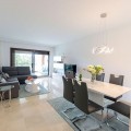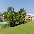 - Elegance and Comfort in New Golden Mile - a Privileged Setting on the Costa del Sol Nestled within one of the most exclusive and impeccably maintained residential complexes in the area, this distinguished ground-floor residence perfectly combines luxury, comfort, and Mediterranean style. The gated community offers a serene and refined atmosphere, featuring beautifully landscaped gardens, an elegant swimming pool, a separate children’s pool, and modern paddle courts — the ideal environment to enjoy a sophisticated and relaxed lifestyle. The apartment stands out for its brightness and well-planned layout. It comprises three spacious bedrooms, two full bathrooms with walk-in showers, and a guest toilet, all finished with high-quality materials. The glazed terrace, facing southwest, invites you to enjoy charming views of the garden and the sea, bathed in the warm natural light that fills every corner of the home. Additional features include hot and cold air conditioning, space for a washer and dryer, an underground parking space, and a storage room, ensuring functionality without compromising on style. Its location is truly exceptional — 20 minutes walk from the beach, and a short drive from the charm of Estepona town centre, the glamour of Puerto Banús, and the cosmopolitan atmosphere of Marbella. Nearby, you will find supermarkets, restaurants, pharmacies, banks, and an excellent selection of public and private schools, all within easy reach. A home that invites you to unwind — where every detail has been thoughtfully designed to create a perfect harmony between elegance, comfort, and proximity to the sea. Note: 1. This property is sold fully furnished, ready to move into with no complications. 2. The apartment is very bright throughout the day, although the photos may not fully convey this due to being taken on a cloudy day.