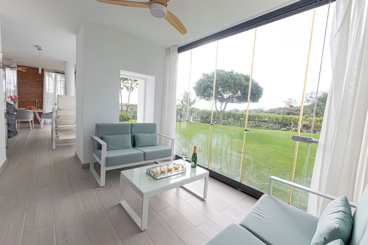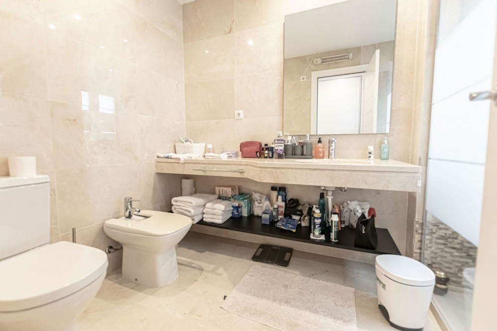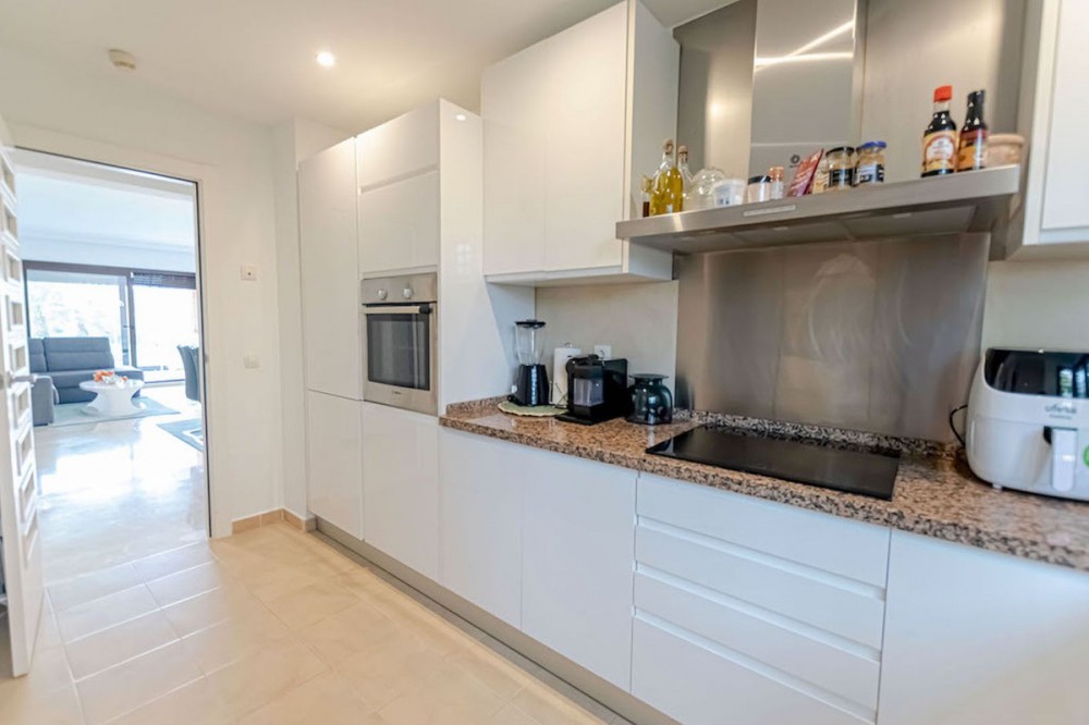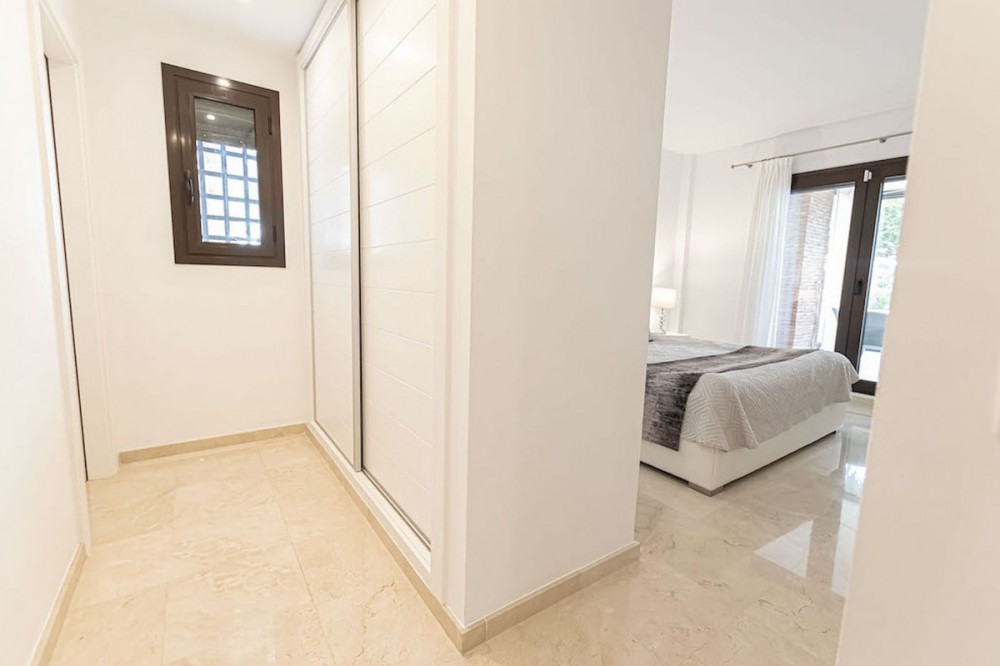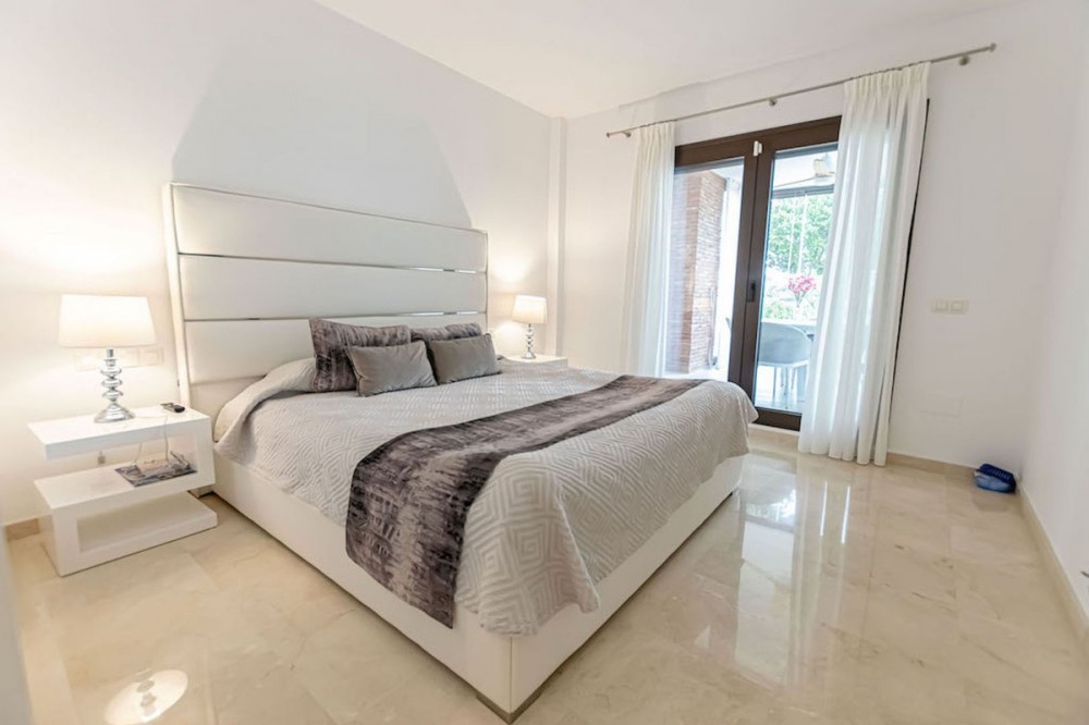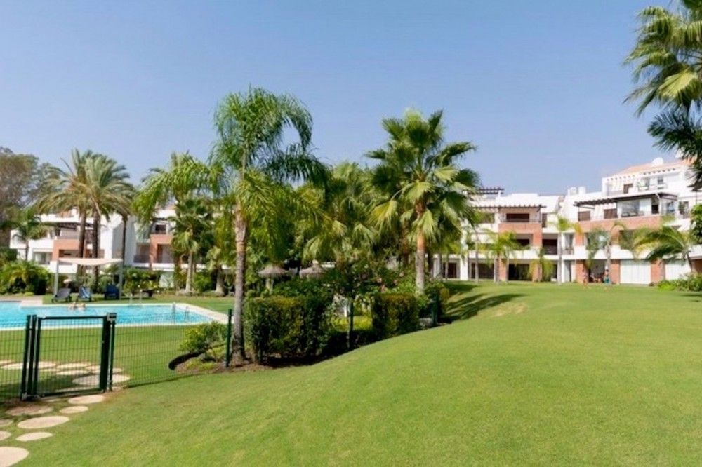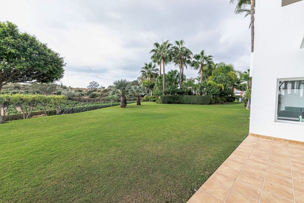 - Elegance and Comfort in New Golden Mile - a Privileged Setting on the Costa del Sol Nestled within one of the most exclusive and impeccably maintained residential complexes in the area, this distinguished ground-floor residence perfectly combines luxury, comfort, and Mediterranean style. The gated community offers a serene and refined atmosphere, featuring beautifully landscaped gardens, an elegant swimming pool, a separate children’s pool, and modern paddle courts — the ideal environment to enjoy a sophisticated and relaxed lifestyle. The apartment stands out for its brightness and well-planned layout. It comprises three spacious bedrooms, two full bathrooms with walk-in showers, and a guest toilet, all finished with high-quality materials. The glazed terrace, facing southwest, invites you to enjoy charming views of the garden and the sea, bathed in the warm natural light that fills every corner of the home. Additional features include hot and cold air conditioning, space for a washer and dryer, an underground parking space, and a storage room, ensuring functionality without compromising on style. Its location is truly exceptional — 20 minutes walk from the beach, and a short drive from the charm of Estepona town centre, the glamour of Puerto Banús, and the cosmopolitan atmosphere of Marbella. Nearby, you will find supermarkets, restaurants, pharmacies, banks, and an excellent selection of public and private schools, all within easy reach. A home that invites you to unwind — where every detail has been thoughtfully designed to create a perfect harmony between elegance, comfort, and proximity to the sea. Note: 1. This property is sold fully furnished, ready to move into with no complications. 2. The apartment is very bright throughout the day, although the photos may not fully convey this due to being taken on a cloudy day.