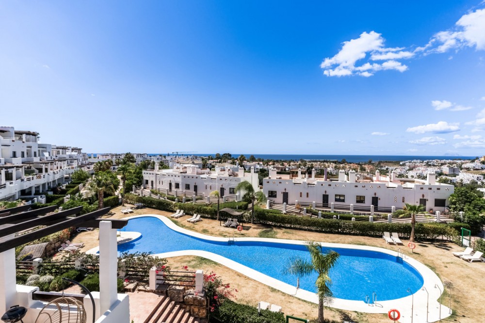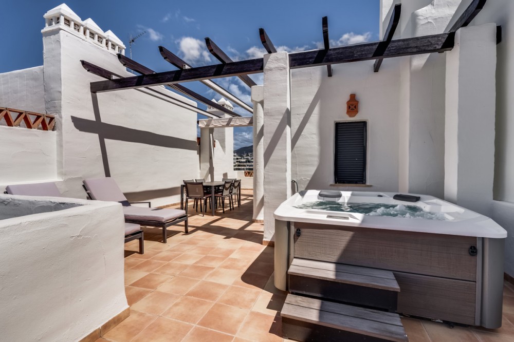- Discover the ultimate Costa del Sol lifestyle in this modern 2-bedroom, 2-bathroom duplex penthouse located in the exclusive Urbanización Sunset Golf, Estepona. This south-facing home offers panoramic sea views and a light-filled open-plan layout designed for comfort and style. The spacious living area connects seamlessly to a 65m² private terrace, featuring a private jacuzzi — perfect for relaxing and entertaining while enjoying the Mediterranean panorama. The property includes two elegant bathrooms (one en-suite), a fully equipped contemporary kitchen, and high-quality finishes throughout. Set within a secure gated community with a doorman, residents enjoy beautifully maintained gardens and a large communal pool. Additional highlights include: Two underground parking spaces Private storage room South orientation for maximum sunlight 20-minute walk to the beach Only 10 minutes from Marbella and Estepona This penthouse is the perfect blend of luxury, privacy, and convenience — an exceptional home for permanent living or as a high-end holiday retreat.