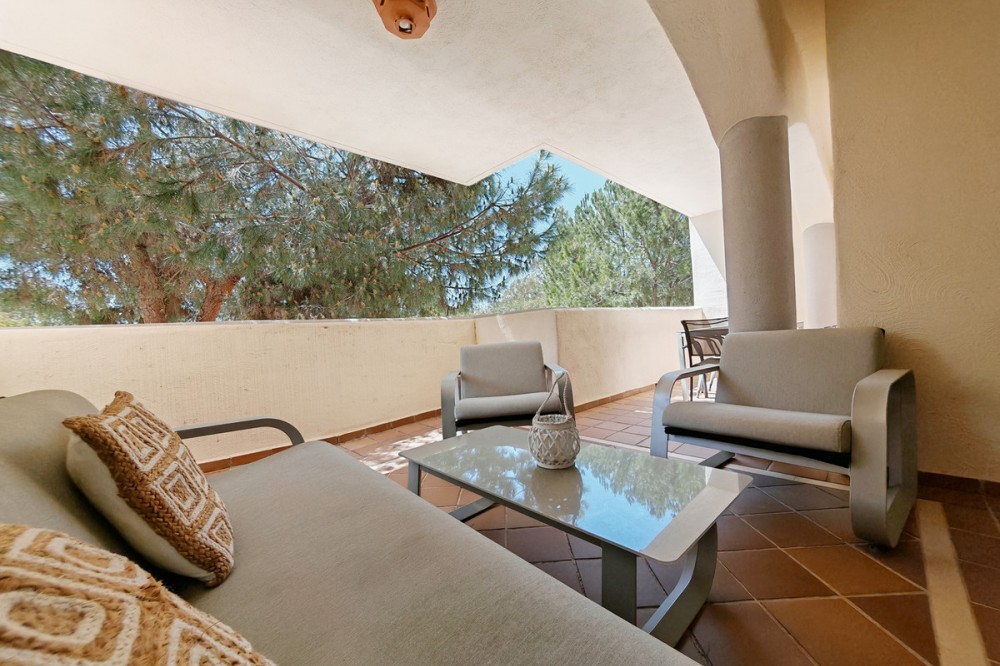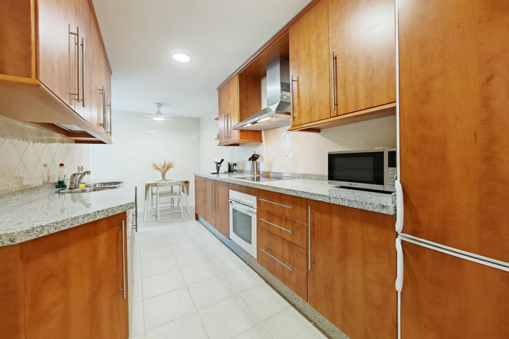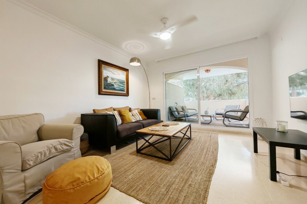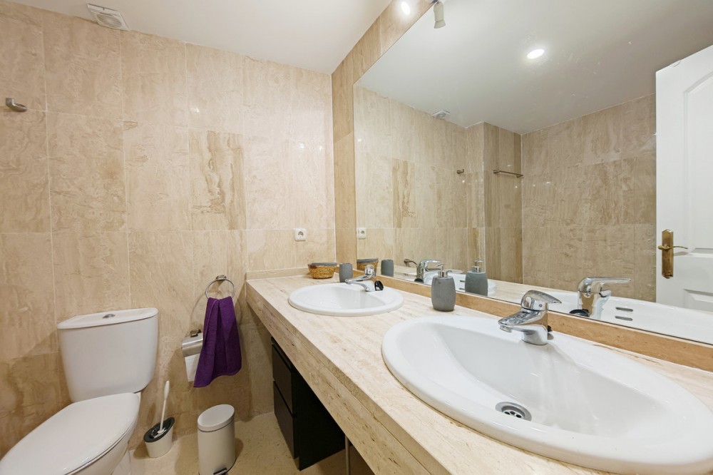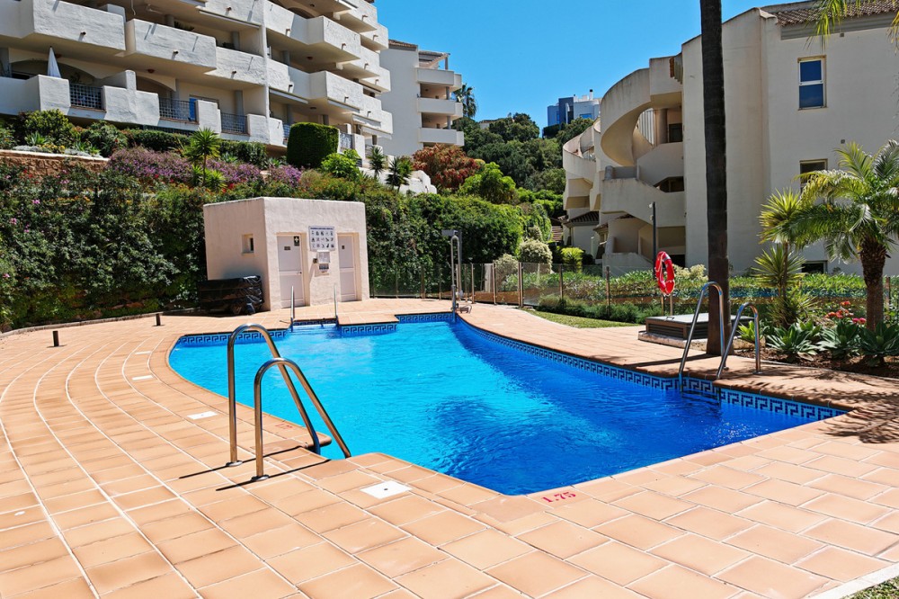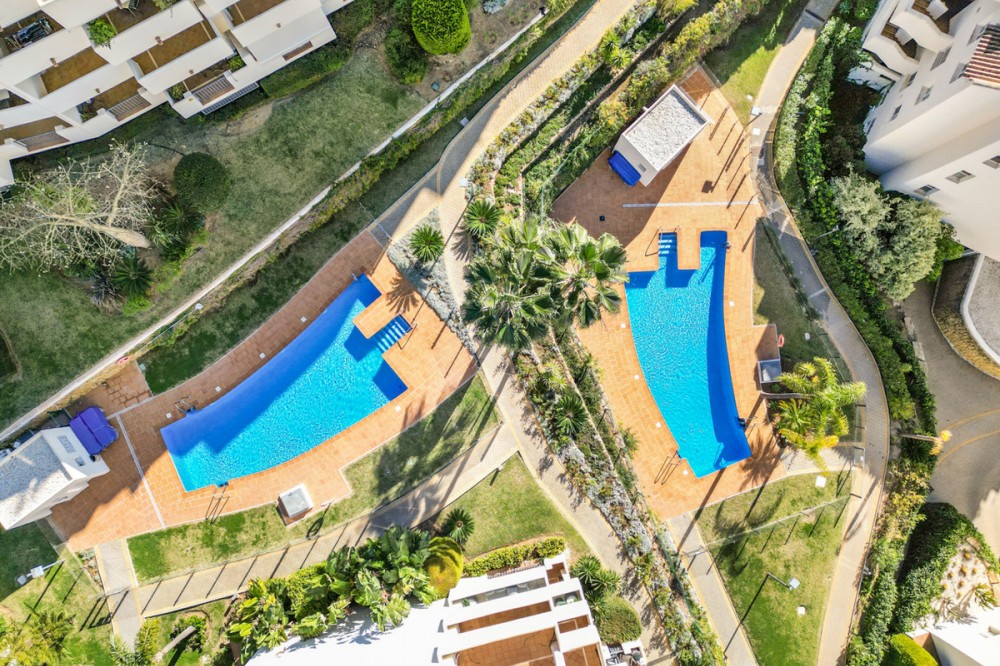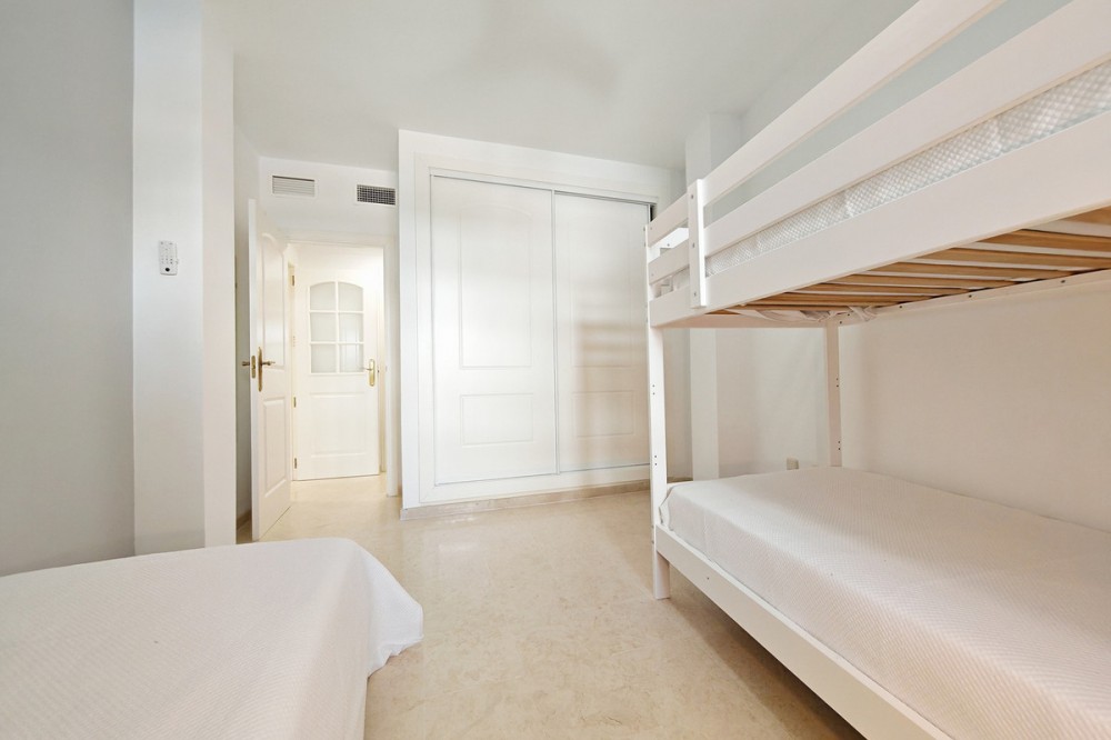 - Apartment for sale in Elviria, Marbella with 2 bedrooms, 2 bathrooms, 1 on suite bathroom and with orientation south/west, with communal swimming pool, communal garage (1 parking spaces) and communal garden. Regarding property dimensions, it has 123 m² built and 16.25 m² terrace. Has the following facilities amenities near, air conditioning, fully furnished, fully fitted kitchen, marble floors, private terrace, kitchen equipped, water tank, country view, indoor pool, laundry room, internet - wi-fi, covered terrace, fitted wardrobes, gated community, lift, close to sea / beach, close to golf, balcony, excellent condition, ceiling cooling system, close to town, close to schools, surveillance cameras, inside golf resort and close to restaurants.