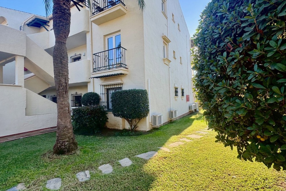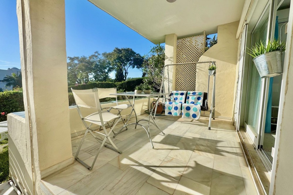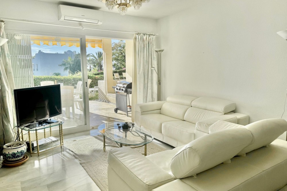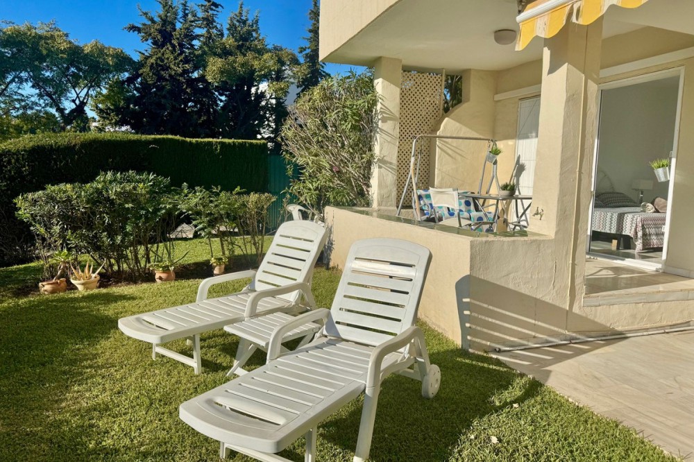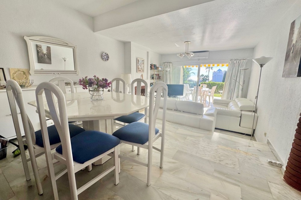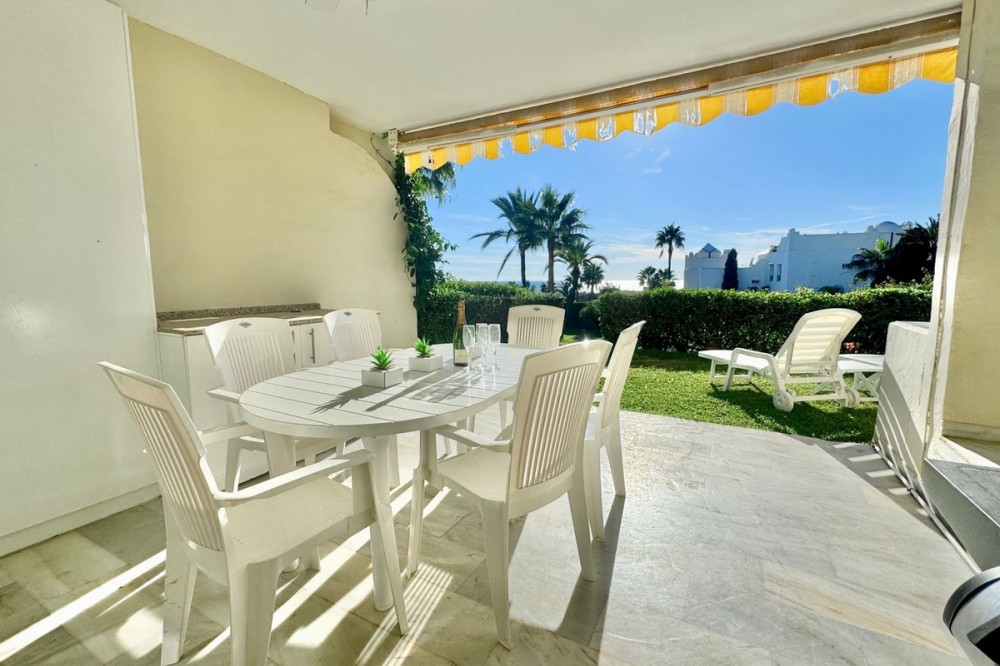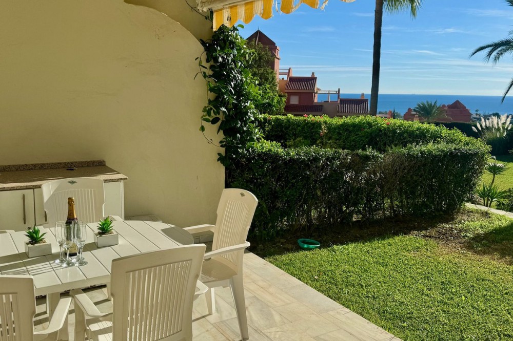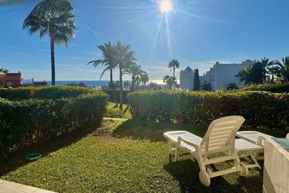 • A fantastic opportunity to own a ground-floor corner apartment in the highly desirable Reserva de Marbella (Las Chapas). Situated within an exclusive gated community of just 18 residences, the complex boasts beautifully landscaped gardens and a large communal pool. The location is ideal—just a short walk to local amenities and a pleasant 25-minute stroll to the picturesque Marbesa beach and the protected Artola dunes. This bright and airy corner apartment offers excellent potential for modernisation and enjoys impressive sea views. A spacious terrace, accessible from both the living room and main bedroom, flows directly into a private garden area, creating a tranquil and secluded outdoor space. Inside, the property features two generous bedrooms and two bathrooms. It comes fully furnished and includes full air conditioning for year-round comfort. A private parking space located just outside the community adds to the convenience.