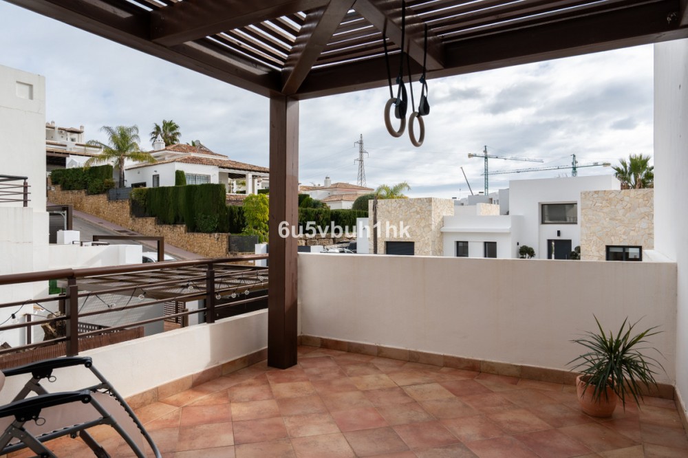 - Nestled in the charming heart of Benalmádena Pueblo, this elegant 285 m² semi-detached house blends comfort, space, and unforgettable views. Step into a warm living room with a cozy fireplace, a bright dining area, and a spacious kitchen—perfect for family life and entertaining. There are on the top floor three comfortable bedrooms with wardrobes from ceiling to floor, two spacious bathrooms and terrace, and on the first floor additionally a guest toilet. The home offers exceptional outdoor living: two spacious terraces, a big patio, and a 110 m² private garden. Relax by your private pool while admiring serene mountain views and Castillo Colomares. Enjoy the sea view from the front terrace and bedroom. Additional features include a large multifunctional basement with natural light, big laundry room, storage room and a carport for two cars. A beautiful blend of tranquility, style, and Andalusian charm— the house is waiting for new owners. A home that truly has it all. Contact us for a viewing!