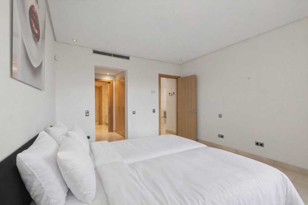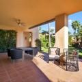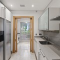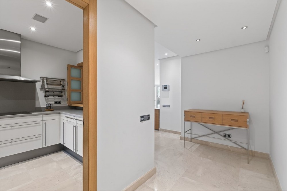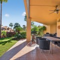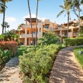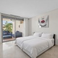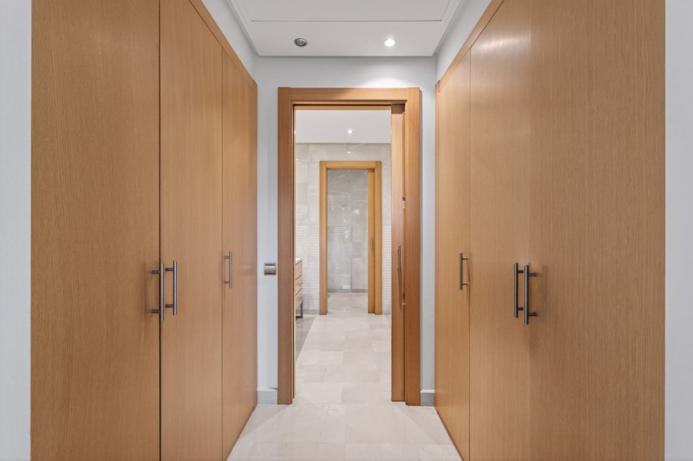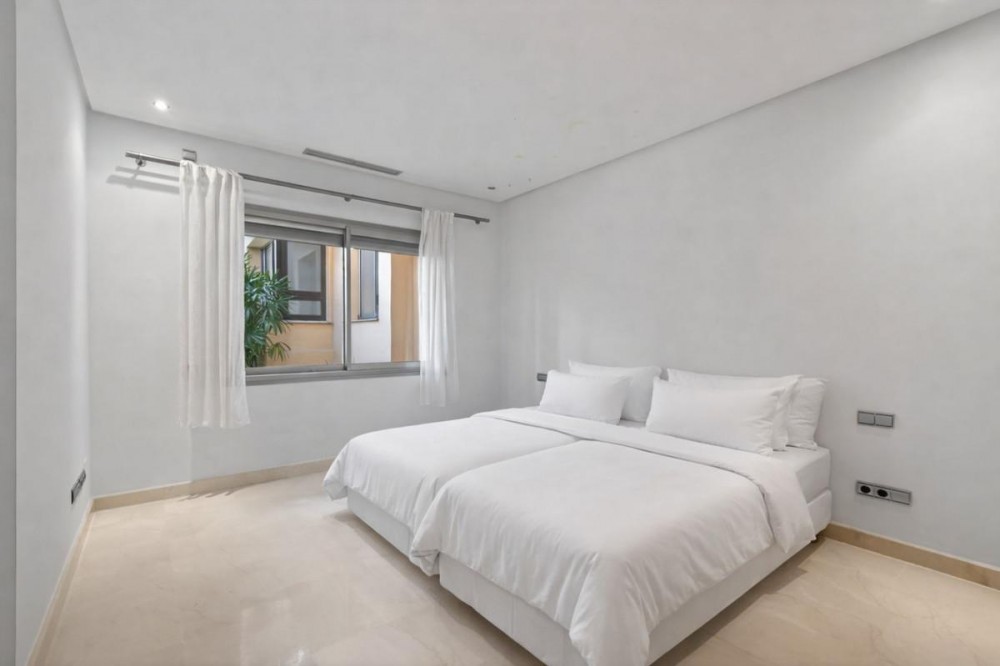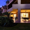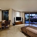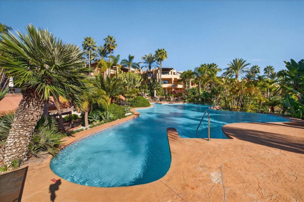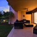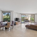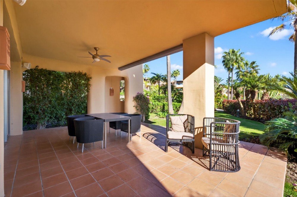 - Dit op het zuidoosten georiënteerde tuinappartement is gelegen in de bekende, afgesloten woonwijk Mansion Club, aan de Gouden Mijl van Marbella. De wijk wordt gewaardeerd om zijn privacy, veiligheid en gunstige ligging ten opzichte van het strand, restaurants, winkels en enkele van Marbella's meest gerenommeerde hotels en voorzieningen. Het appartement is licht en goed ingedeeld, met een comfortabele woon- en eetkamer die via grote glazen deuren direct toegang biedt tot een privéterras. Het terras biedt ruimte om buiten te eten en te zitten en kijkt uit over de goed onderhouden gemeenschappelijke tuinen, wat zorgt voor een aangename en besloten buitenruimte. De keuken is volledig uitgerust met hoogwaardige apparatuur en beschikt over een praktisch doorgeefluik dat de eet- en woonkamer met elkaar verbindt, waardoor een functionele en open sfeer ontstaat. De hoofdslaapkamer heeft directe toegang tot het terras en beschikt over een en-suite badkamer met zowel een ligbad als een aparte douche, evenals een kleedruimte met voldoende opbergruimte. De tweede slaapkamer is eveneens ruim, profiteert van natuurlijk licht door grote ramen en heeft een tweede badkamer die op een vergelijkbare manier is afgewerkt. Bewoners van Mansion Club hebben toegang tot diverse gemeenschappelijke voorzieningen, waaronder een fitnessruimte, een spa, een buitenzwembad, een verwarmd binnenzwembad, een sauna en een hamam. De gemeenschap beschikt tevens over aangelegde tuinen en een rustig privépark met zitjes en fonteinen. De Gouden Mijl is een van de meest gevestigde woonwijken van Marbella, bekend om de nabijheid van het stadscentrum en Puerto Banús, evenals de strandpromenade, restaurants en voorzieningen. Door het beperkte aanbod en de constante vraag blijven woningen op deze locatie zeer gewild, zowel als woonhuis als als investering voor de lange termijn.