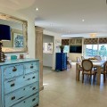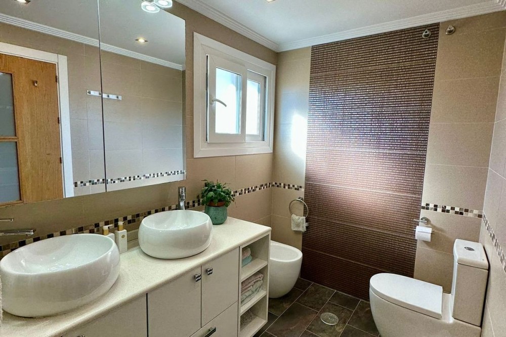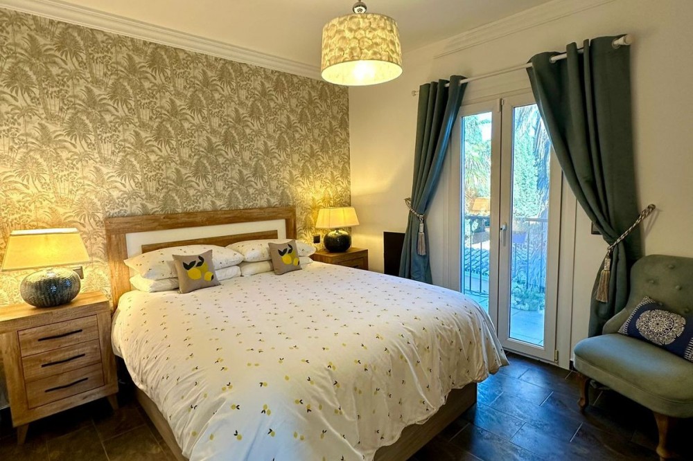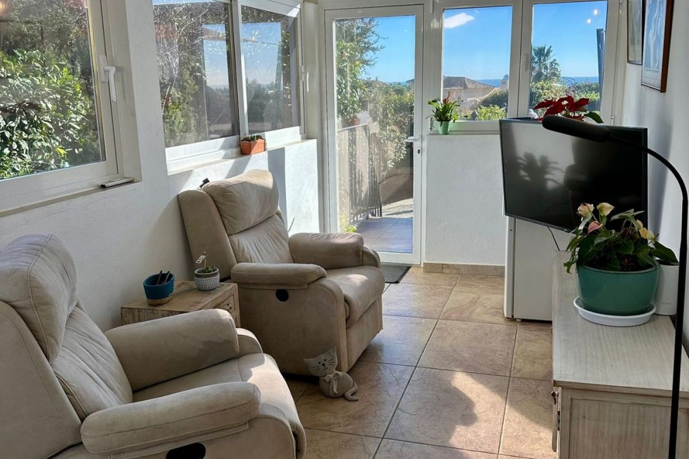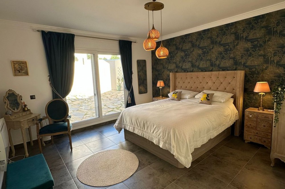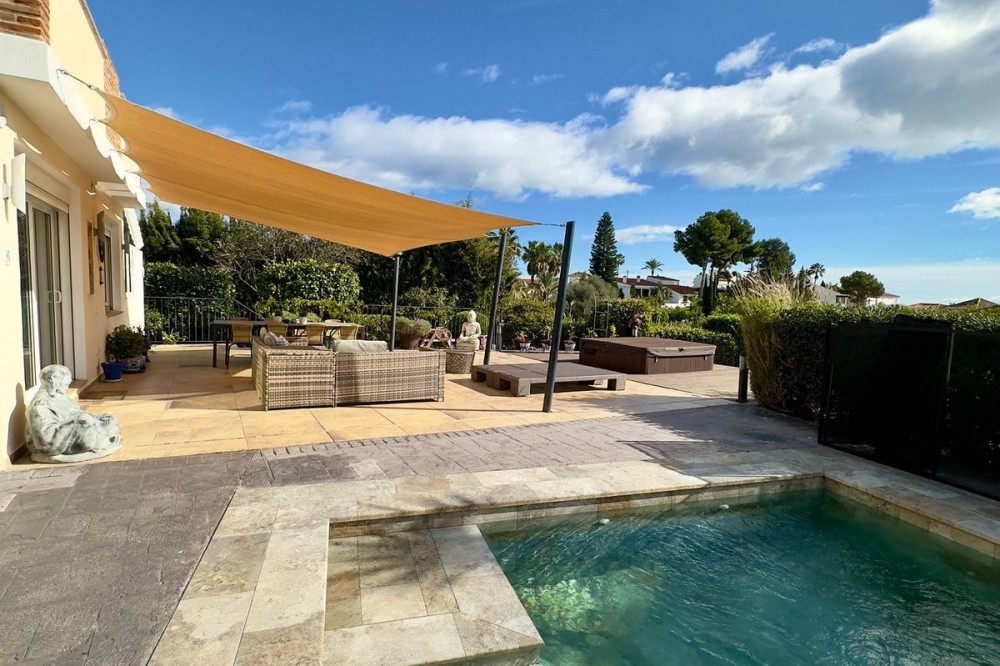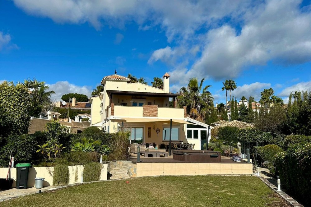 - Deze prachtige, op het zuiden georiënteerde gezinswoning is gelegen in Las Lomas, Estepona, in een rustige en veilige woonwijk en biedt een adembenemend panoramisch uitzicht over de Middellandse Zee. De woning is prachtig gerenoveerd tot een uitzonderlijk hoog niveau en is verdeeld over twee ruime verdiepingen, die comfort, functionaliteit en een uitstekende levenskwaliteit bieden. De begane grond beschikt over een lichte, open woonruimte die naadloos overgaat in een gloednieuwe, volledig ingerichte keuken, eethoek en zithoek. Vanuit de woonkamer is er directe toegang tot een groot terras, een privézwembad en een prachtig aangelegde tuin, waardoor een perfecte overgang tussen binnen en buiten ontstaat, ideaal voor dagelijks gebruik en het ontvangen van gasten. Grenzend aan de keuken bevindt zich een charmante, lichte kamer die perfect dienst kan doen als thuiskantoor, speelkamer of ontspanningsruimte. Deze verdieping omvat tevens een gastentoilet, een wasruimte en een ruime slaapkamer met eigen badkamer. De bovenverdieping biedt drie extra slaapkamers en twee badkamers, met als hoogtepunt de indrukwekkende master suite, die beschikt over een eigen badkamer en een groot privéterras met spectaculair panoramisch uitzicht op zee. De woning is volledig uitgerust met centrale verwarming en airconditioning, elektrische rolluiken voor extra comfort en veiligheid, en recent geïnstalleerde zonnepanelen. Alle slaapkamers zijn voorzien van inbouwkasten. De woning staat op twee samengevoegde percelen van in totaal circa 1.300 m² en beschikt over een groot, recent betegeld zwembad, een jacuzzi, een zorgvuldig onderhouden tuin, twee opritten met elektrische poorten en voldoende parkeerruimte. Als extraatje omvat het pand een aparte bungalow met twee slaapkamers, slechts een jaar oud, ideaal voor bezoekende familie en gasten, als huurinkomstenbron of als extra woonruimte. Gelegen in een rustige en kindvriendelijke omgeving op het platteland van Estepona, ligt de woning op slechts vijf minuten rijden van Laguna Village en tien minuten van het centrum van Estepona, en biedt zo de perfecte balans tussen privacy, uitzicht op zee en de nabijheid van alle voorzieningen.