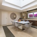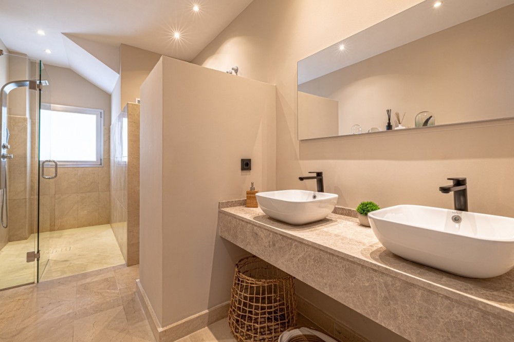 • HOOGTEPUNTEN Deze schitterende, moderne luxe villa, gerenoveerd in 2025 en compleet met privézwembad, is perfect gelegen in de meest exclusieve en rustige wijk El Rosario, in het hart van Marbella Oost. Ontworpen door een gerenommeerd Nederlands architectenbureau, toont de woning uitzonderlijk vakmanschap en een verfijnde stijl, en biedt een naadloze mix van modern design, privacy en absoluut comfort. Elk detail van deze uitzonderlijke woning is zorgvuldig samengesteld om een luxueuze maar gastvrije sfeer te creëren, die garant staat voor een onvergetelijk verblijf. INTRODUCTIE VAN HET PAND Deze villa ligt in Marbella Oost, vlakbij de mooiste stranden van de stad: lange stroken zacht, goudkleurig zand, omzoomd door beschermde duinen en inheemse vegetatie. Gasten profiteren van gemakkelijke toegang tot enkele van de meest glamoureuze strandclubs en eersteklas golfbanen aan de Costa del Sol, zoals Santa Clara Golf, Río Real Golf en Marbella Golf Club. Het stadscentrum van Marbella ligt op slechts 10 minuten afstand en via de snelweg A7 bent u in ongeveer 30 minuten op de luchthaven van Málaga. BUITENKANT De villa ligt in een beveiligde, afgesloten woonwijk te midden van weelderig mediterraan groen en biedt volledige privacy, met name rond het stijlvolle, moderne zwembad. De buitenruimte is prachtig ingericht om te ontspannen en buiten te dineren, en vormt de perfecte setting om tot rust te komen of gasten te ontvangen onder de Andalusische zon. INTERIEUR De begane grond beschikt over een ruime, lichte woonkamer met een grote bank, smart-tv en directe toegang tot de tuin. Een strakke, volledig uitgeruste keuken en een gastentoilet maken deze verdieping compleet. De open indeling en de ramen van vloer tot plafond creëren een serene en uitnodigende sfeer in het hele huis. De villa beschikt over drie royale slaapkamers, elk met een eigen badkamer, wat gasten privacy en comfort biedt. Elke ruimte weerspiegelt een verfijnde, minimalistische esthetiek, ontworpen om ontspanning te bevorderen met behoud van een moderne en functionele uitstraling. Deze accommodatie combineert op perfecte wijze hedendaagse luxe met een natuurlijke omgeving. Of u nu een familievakantie plant of een stijlvol uitje met vrienden, elk detail is zorgvuldig samengesteld om u een eersteklas levensstijl te bieden in het hart van Marbella Oost.