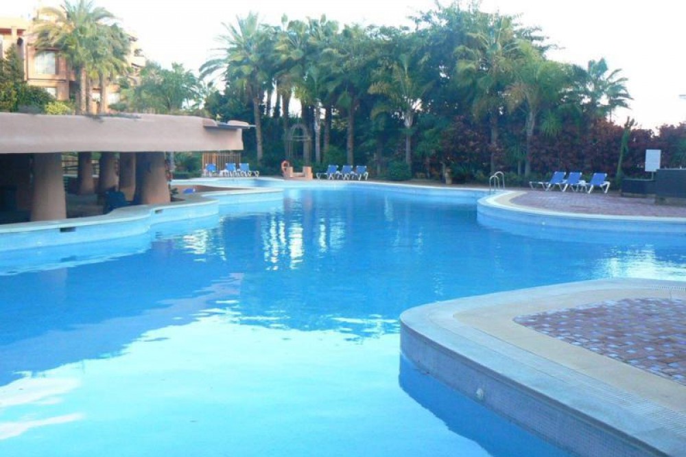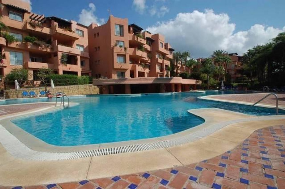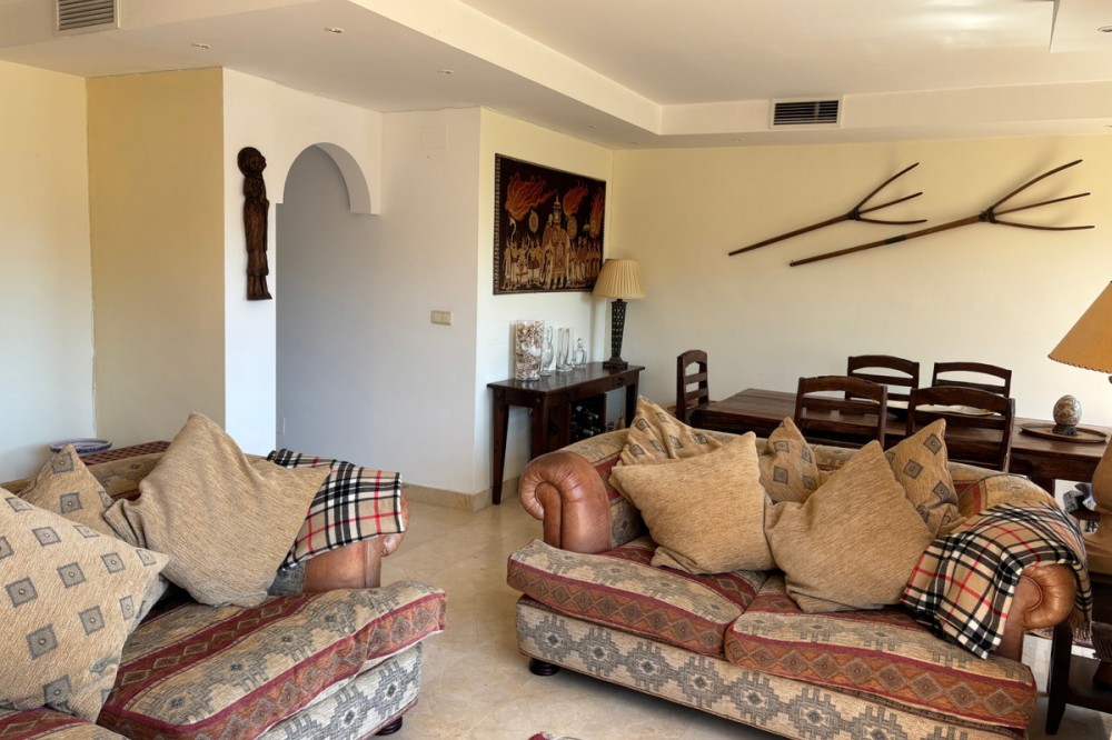 - Met genoegen presenteren wij dit fantastische appartement met 3 slaapkamers op de 3e verdieping, gelegen op het zuidwesten in de prestigieuze wijk Golden Mile in Marbella. Het appartement bevindt zich vlakbij het beroemde Puente Romano Hotel Resort en op loopafstand van het strand en het centrum van Marbella. Het complex is beveiligd met een poort en bewaking. De accommodatie is licht en ruim en biedt een grote woon-/eetkamer, een volledig uitgeruste keuken met een aangrenzende bijkeuken. Er zijn 3 badkamers, allemaal voorzien van een douche. Er zijn drie tweepersoonsslaapkamers, waarvan de hoofdslaapkamer een complete en-suite badkamer heeft met bad en douche. De kamer heeft dubbele glazen openslaande deuren naar een terras dat, dankzij de ligging op het westen, van de middagzon geniet. Er zijn nog twee tweepersoonsslaapkamers met voldoende opberg-/kastruimte. In dit bijgebouw bevindt zich nog een badkamer met een aparte douchecabine. Vanuit de woonkamer leiden grote glazen schuifdeuren naar een ruim terras waar u kunt genieten van een prachtig uitzicht op zee. Er is voldoende ruimte om buiten te dineren, te barbecueën en te ontspannen terwijl u geniet van de zuidwestelijke zon. De woning beschikt over airconditioning (warm en koud). Er zijn momenteel plannen om van deze woning een woning met 4 slaapkamers te maken, wat eenvoudig te realiseren is. Binnen het complex is er een gemeenschappelijke parkeerplaats, een groot, vrij toegankelijk zwembad, een fitnessruimte, een sauna en een jacuzzi, allemaal gelegen in een prachtig aangelegde gemeenschappelijke tuin met exotische planten en struiken. Deze tuinen worden perfect onderhouden dankzij de goed georganiseerde en georganiseerde gemeenschap.
