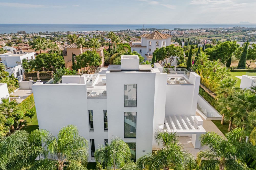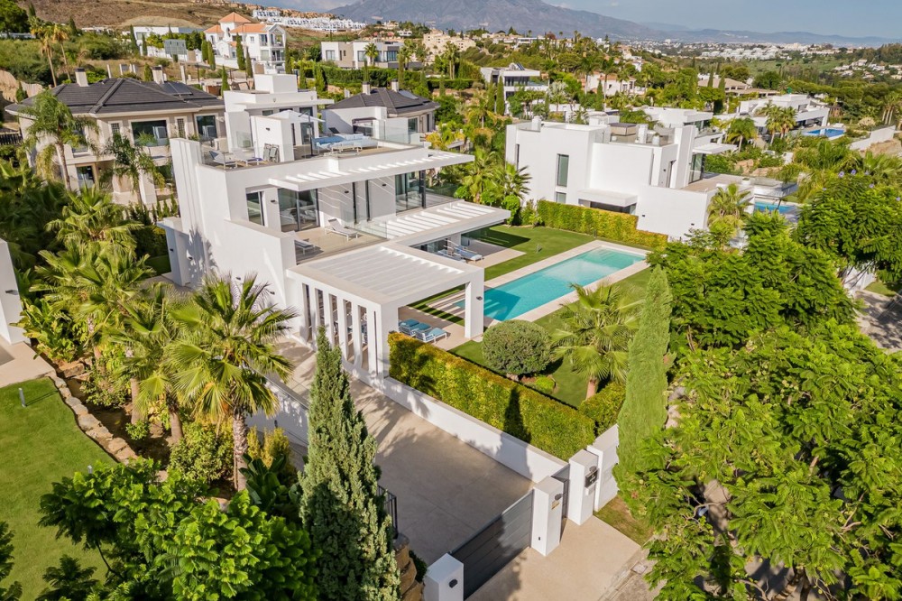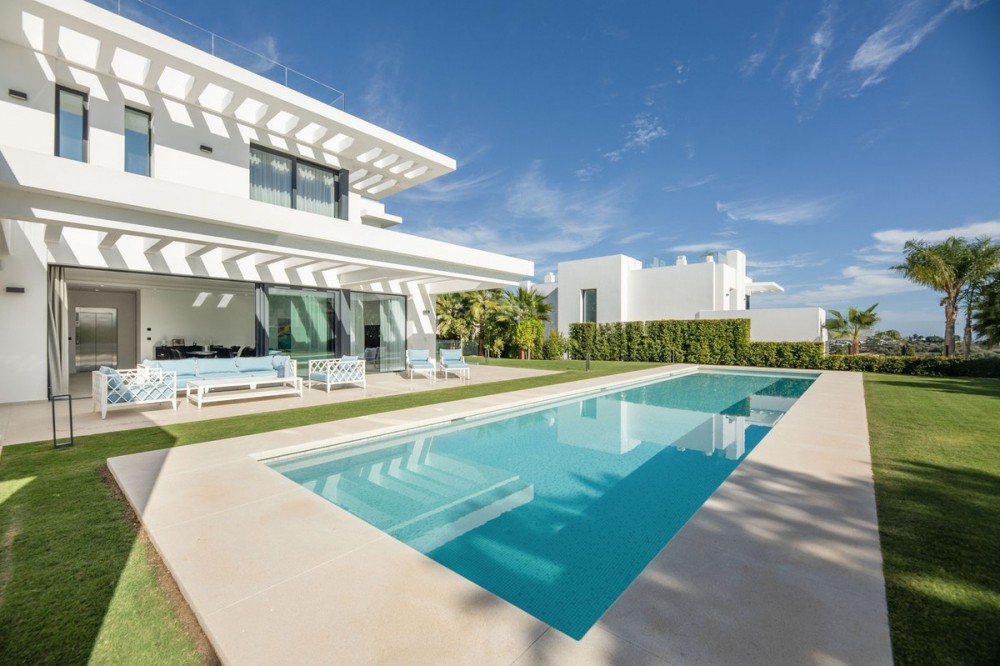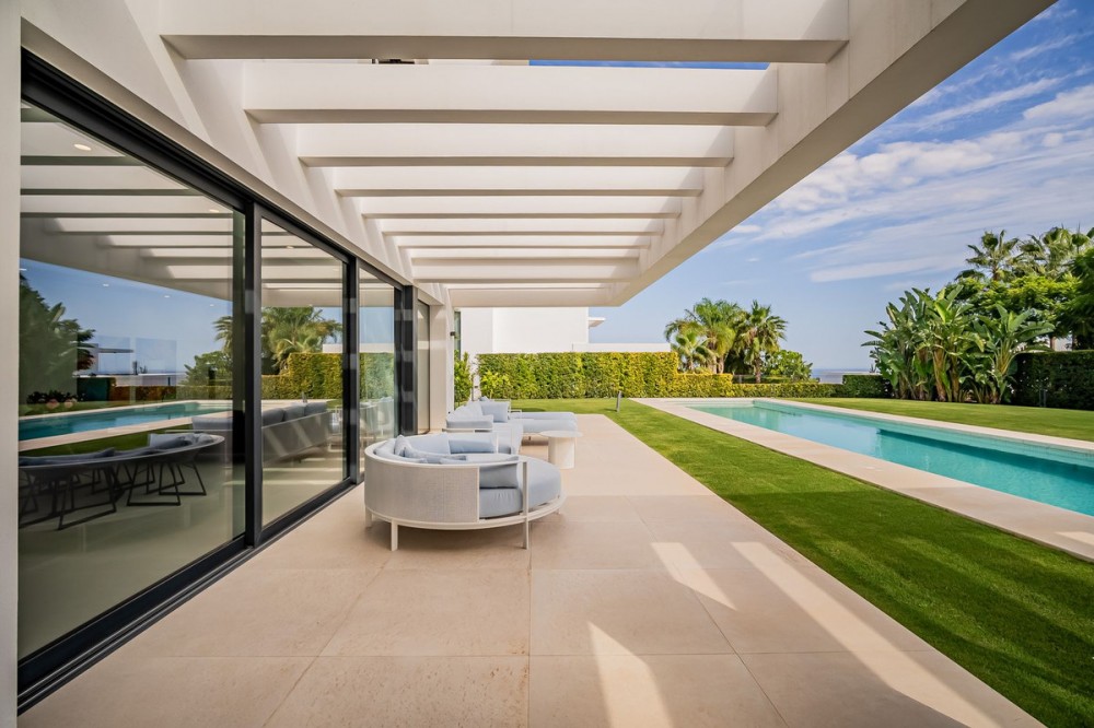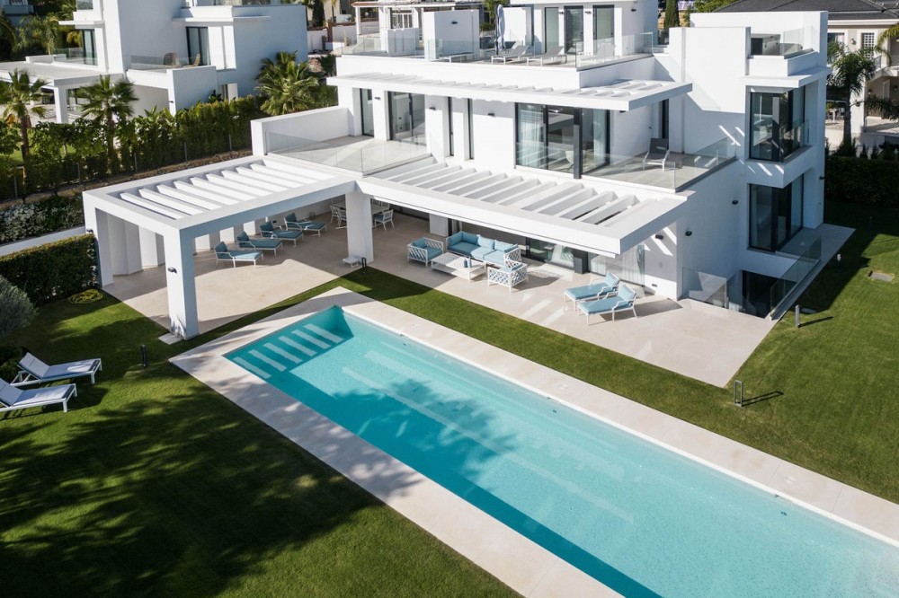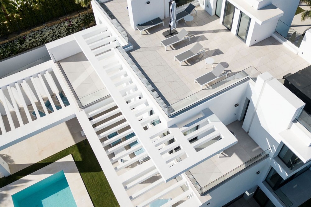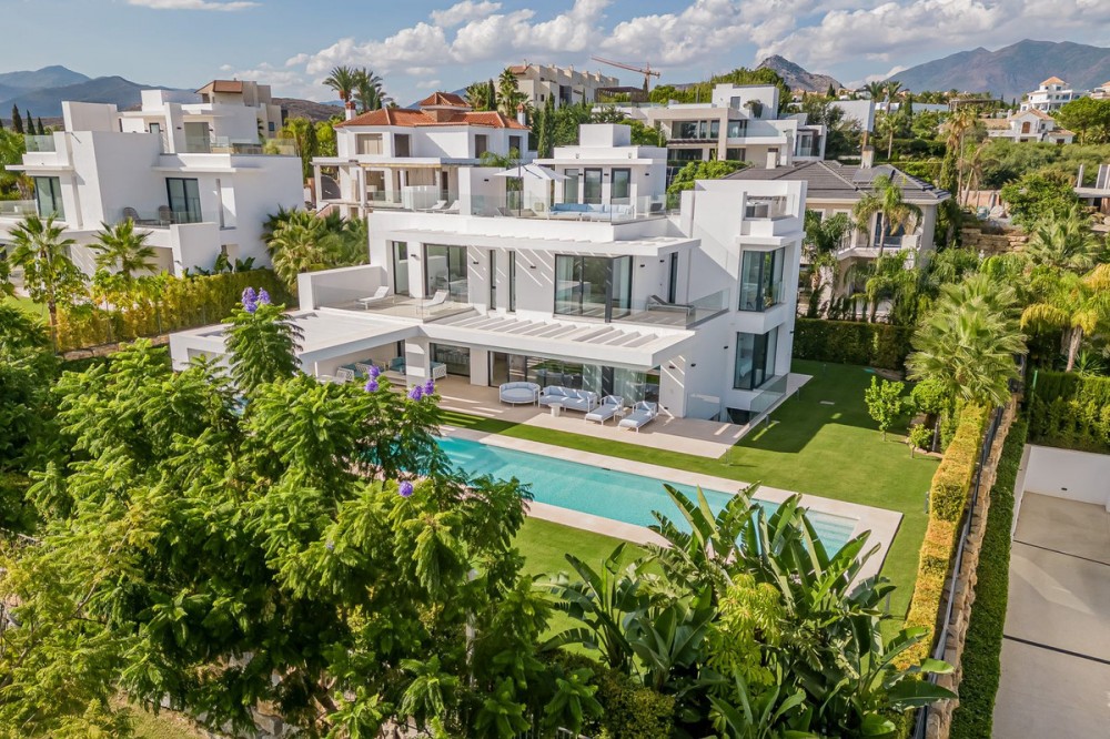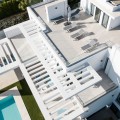 - Live the dream in this meticulously crafted 5-bedroom contemporary masterpiece situated within the prestigious Los Flamingos gated community, Benahavis. This brand new property offers unparalleled luxury, breathtaking panoramic views, and the ultimate in contemporary living. Unwind in spacious en-suite bedrooms spread across four levels, each designed for ultimate comfort and privacy. The open-plan living area on the ground floor seamlessly connects with the pool terrace, inviting the Mediterranean vistas right into your home. On the first floor, the master suite with a private terrace awaits, complemented by 2 further en-suite bedrooms.Ascend to the rooftop terrace and be mesmerised by spectacular uninterrupted sea views stretching to Marbella and La Concha, Morocco, and Gibraltar. Descend to the basement level sanctuary and discover a haven of relaxation – a fifth en-suite bedroom and a state-of-the-art spa with a gym, Finnish sauna, steam room, shower, and toilet. This haven even offers independent access to the pool via a private staircase.