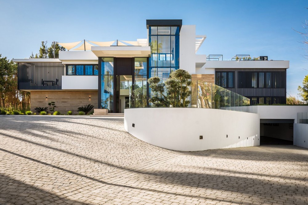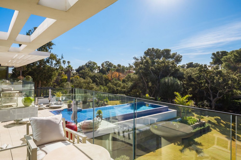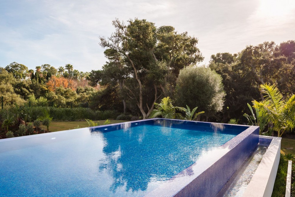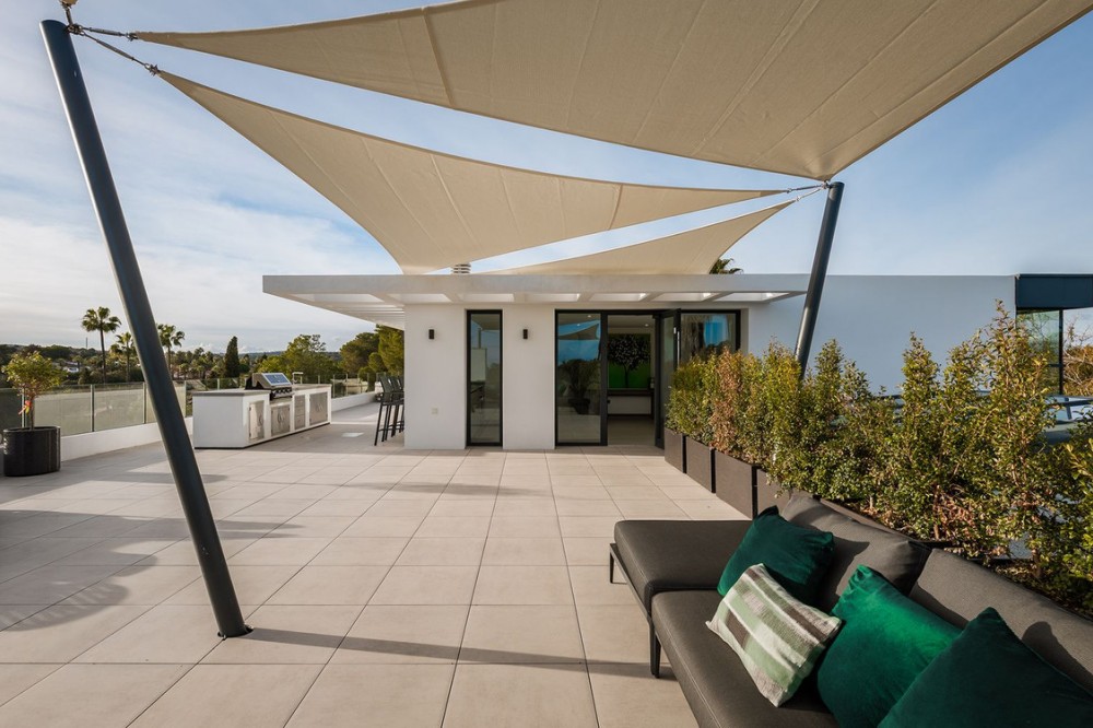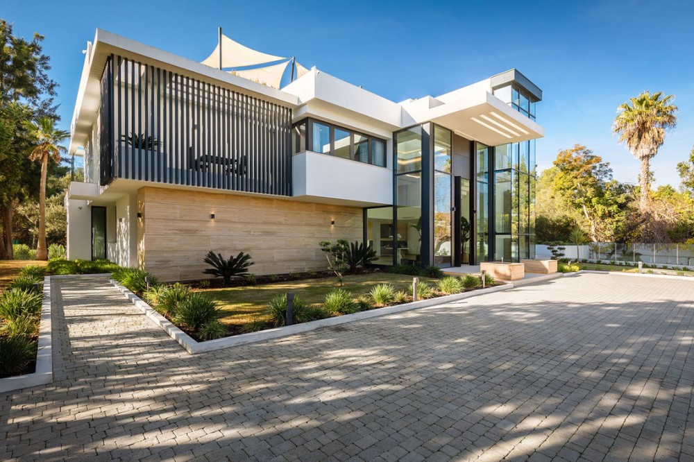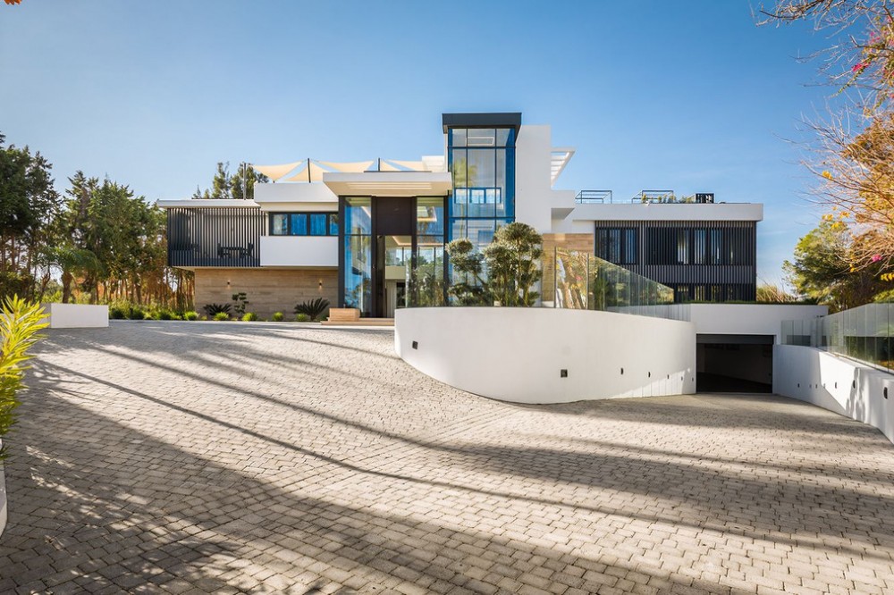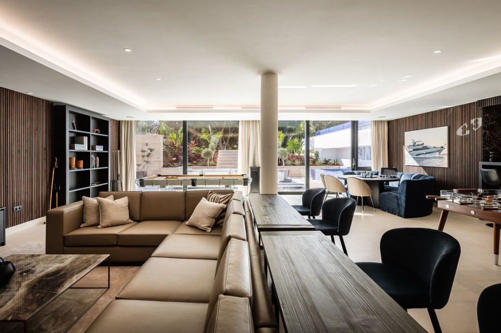 - Stunning Villa in Sotogrande! Beautiful contemporary villa set in the heart of Sotogrande’s prestigious Kings and Queens enclave, just moments from the beach, marina and world-class golf. Set on a generous, landscaped plot, the home blends clean modern architecture with light-filled open spaces designed for relaxed Mediterranean living. Double-height interiors, seamless indoor–outdoor areas and a stunning kitchen make it ideal for both everyday life and entertaining. With seven en-suite bedrooms, rooftop terraces, wellness areas and a serene infinity pool, it offers privacy, comfort and effortless luxury in one of Sotogrande’s most sought-after locations. Thoughtfully laid out for both daily comfort and social gatherings, the home features multiple indoor and outdoor living areas. At its heart is a fully equipped Gaggenau kitchen with a central island, complemented by a separate prep kitchen and an adjoining outdoor BBQ space—perfect for entertaining. The seven bedrooms each come with en-suite bathrooms, ensuring both privacy and luxury for residents and guests. Additional features enhance the home’s appeal, including a dedicated wellness area with a sauna and steam room, a games room, and a private elevator that adds both convenience and accessibility. The rooftop solarium offers a stunning setting for relaxation, complete with a BBQ area, shower, and an open-air lounge boasting panoramic views—ideal for sun-soaked afternoons or evening gatherings. Outside, a sleek infinity pool is framed by lush, mature landscaping, creating a serene, resort-like ambiance. The large private garage provides secure parking for several vehicles, further underlining the home’s practical luxuries.
