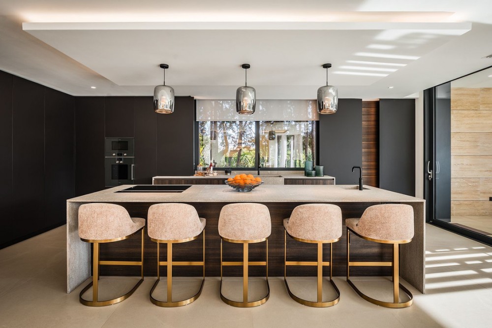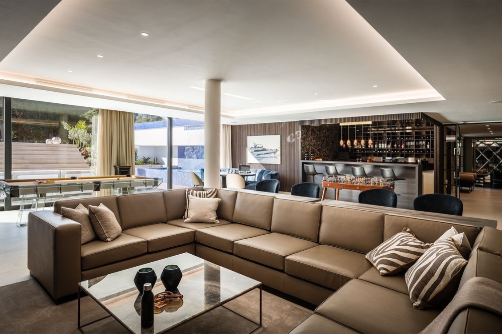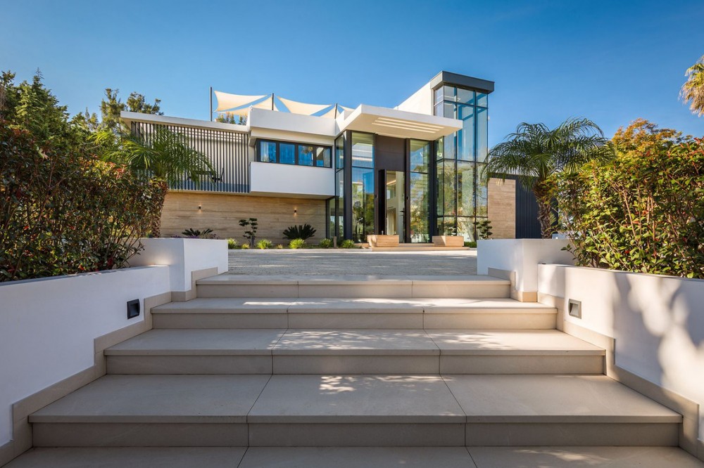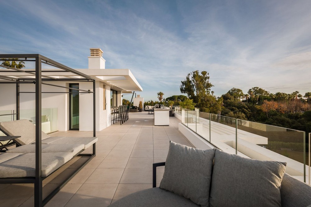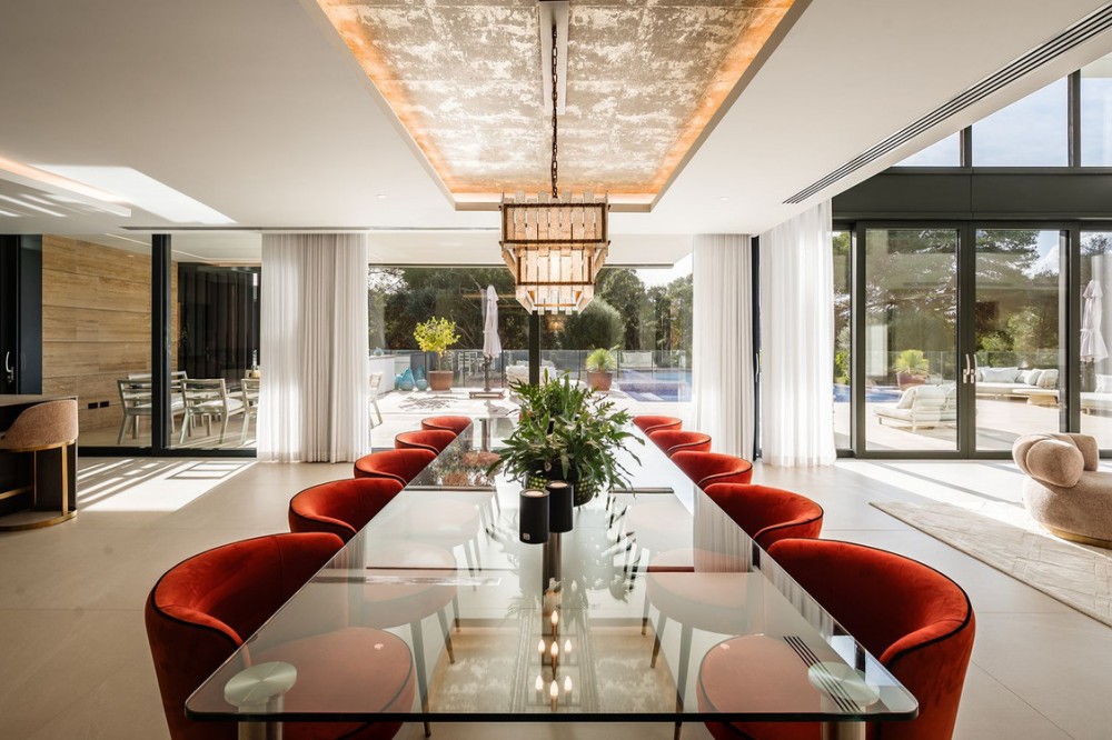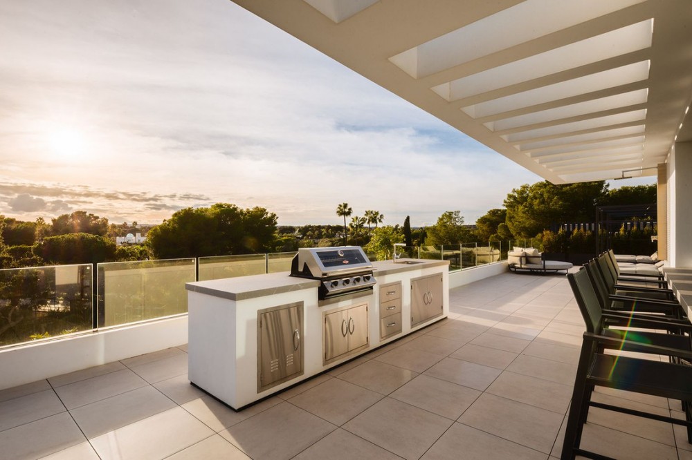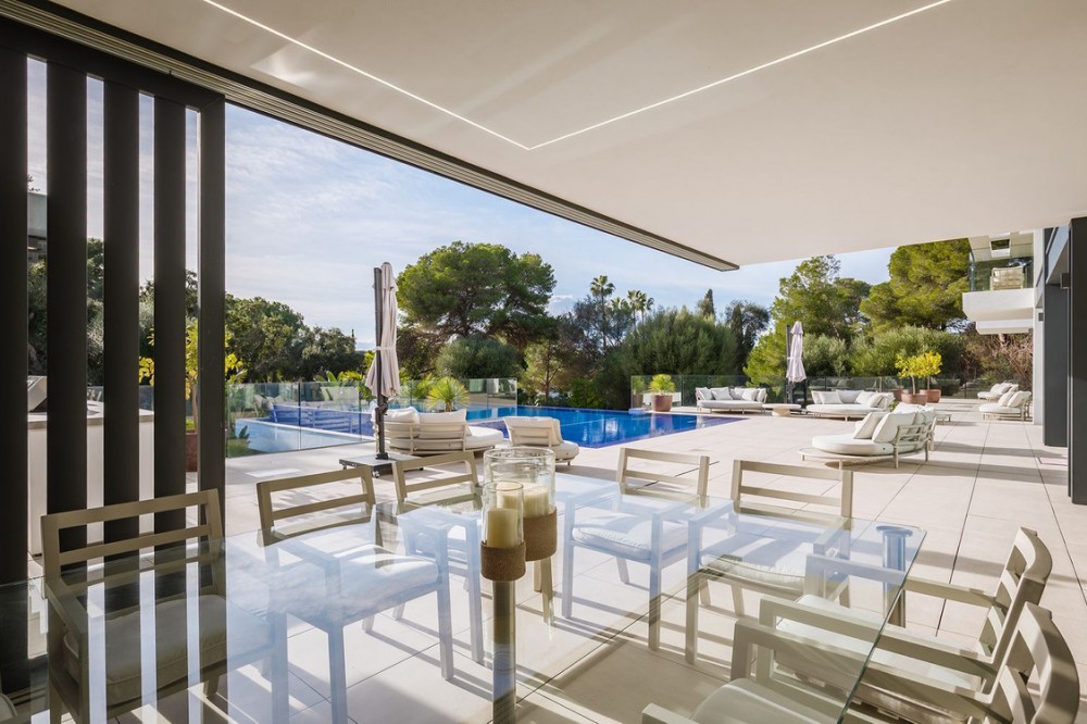 - Stunning Villa in Sotogrande! Beautiful contemporary villa set in the heart of Sotogrande’s prestigious Kings and Queens enclave, just moments from the beach, marina and world-class golf. Set on a generous, landscaped plot, the home blends clean modern architecture with light-filled open spaces designed for relaxed Mediterranean living. Double-height interiors, seamless indoor–outdoor areas and a stunning kitchen make it ideal for both everyday life and entertaining. With seven en-suite bedrooms, rooftop terraces, wellness areas and a serene infinity pool, it offers privacy, comfort and effortless luxury in one of Sotogrande’s most sought-after locations. Thoughtfully laid out for both daily comfort and social gatherings, the home features multiple indoor and outdoor living areas. At its heart is a fully equipped Gaggenau kitchen with a central island, complemented by a separate prep kitchen and an adjoining outdoor BBQ space—perfect for entertaining. The seven bedrooms each come with en-suite bathrooms, ensuring both privacy and luxury for residents and guests. Additional features enhance the home’s appeal, including a dedicated wellness area with a sauna and steam room, a games room, and a private elevator that adds both convenience and accessibility. The rooftop solarium offers a stunning setting for relaxation, complete with a BBQ area, shower, and an open-air lounge boasting panoramic views—ideal for sun-soaked afternoons or evening gatherings. Outside, a sleek infinity pool is framed by lush, mature landscaping, creating a serene, resort-like ambiance. The large private garage provides secure parking for several vehicles, further underlining the home’s practical luxuries.