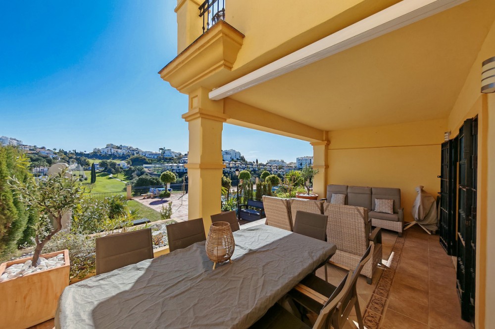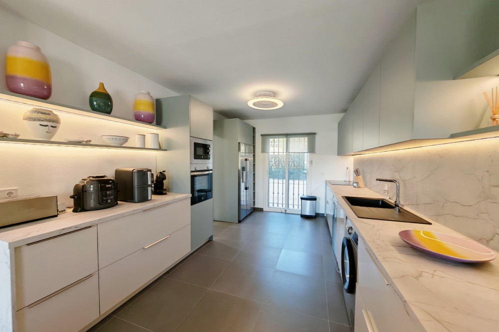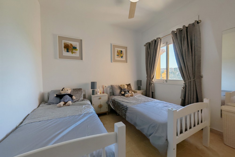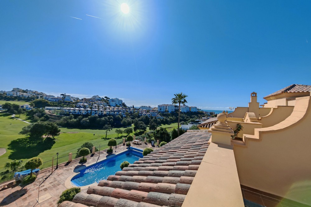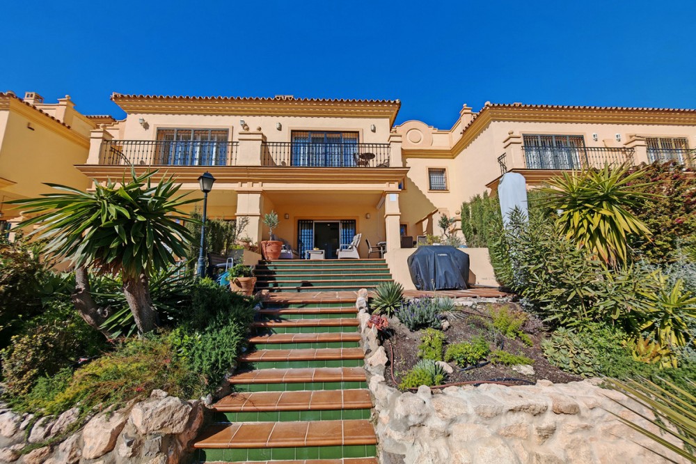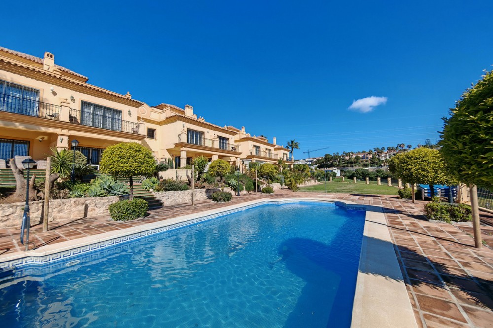 - Town House for sale in , Mijas Costa with 4 bedrooms, 3 bathrooms, 1 toilet and with orientation south/east, with communal swimming pool, private garage (3 parking spaces) and private garden. Regarding property dimensions, it has 175 m² built and 70 m² terrace. Has the following facilities front line golf, air conditioning, fully furnished, fully fitted kitchen, utility room, marble floors, basement, storage room, alarm, solarium, security entrance, double glazing, security service 24h, guest toilet, private terrace, living room, separate apartment, sea view, golf view, heated pool, automatic irrigation system, security shutters, smart home system, bars, laundry room, internet - wi-fi, covered terrace, fitted wardrobes, gated community, garden view, pool view, panoramic view, close to children playground, close to sea / beach, close to golf, uncovered terrace, glass doors, balcony, wheelchair-accessible, recently renovated / refurbished, lake view, ceiling cooling system, ceiling heating system, close to shops, close to schools, guest apartment, inside golf resort, office room and pets allowed.
