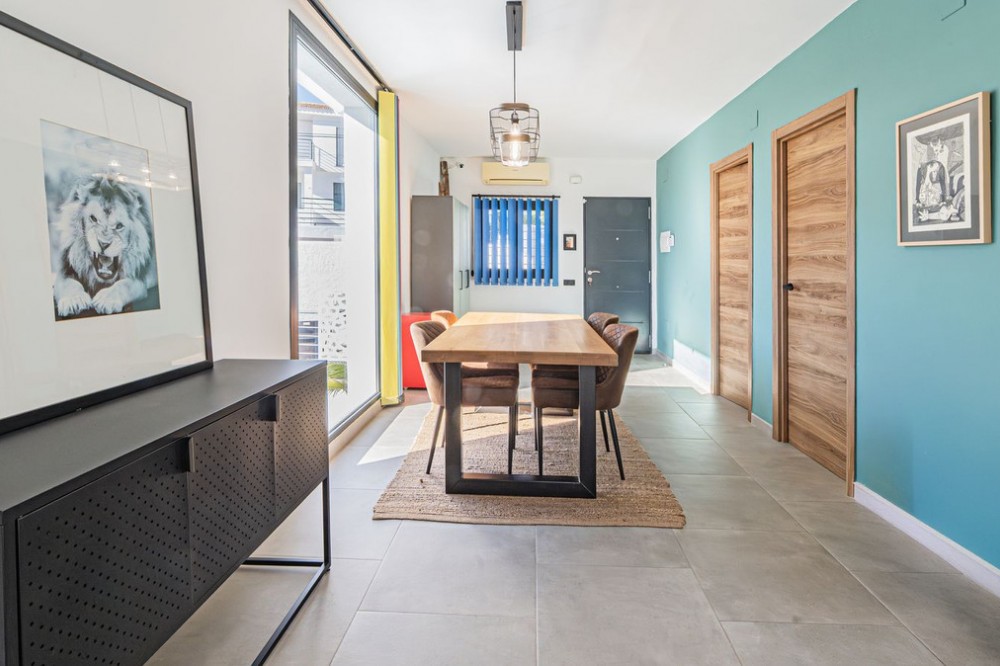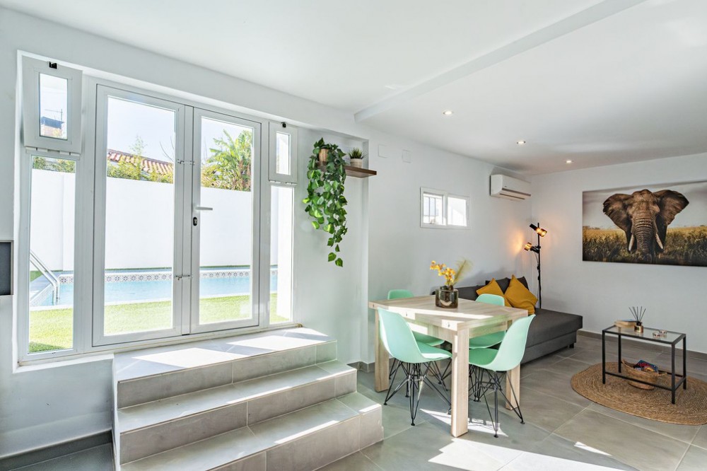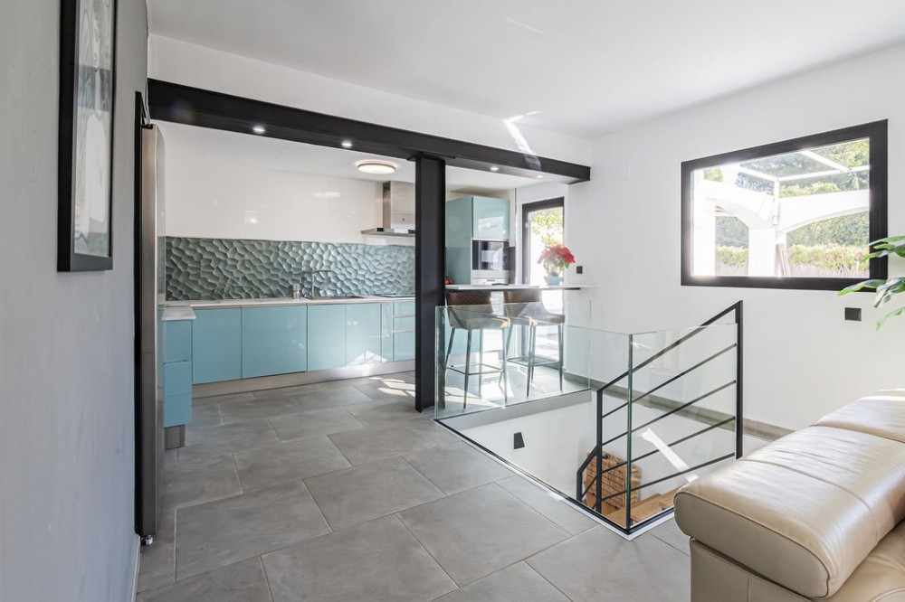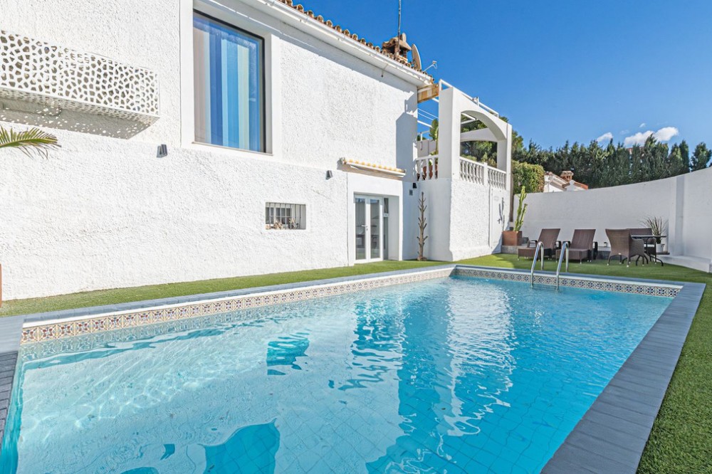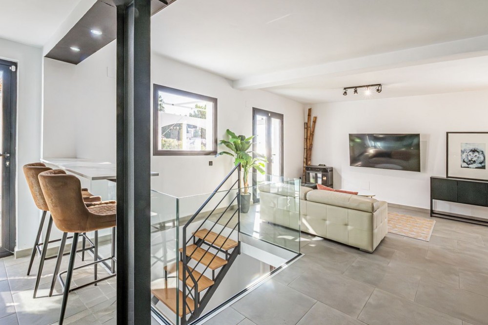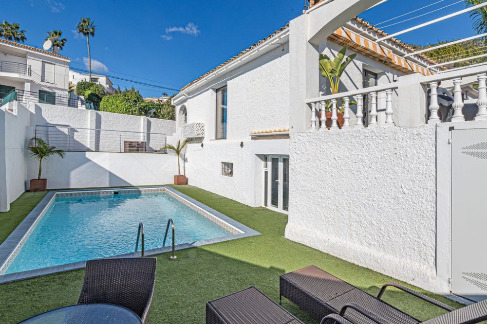 - READY TO MOVE IN! Detached villa completely renovated just three years ago, with attention to every detail and using high-end materials, designed to offer maximum comfort and quality of life. The property is spread over two floors and has been designed to enjoy spacious, bright and functional spaces. On the main floor, with direct access from the private car park, we are welcomed by an elegant hall that leads to a very spacious bedroom with a dressing room and a modern full bathroom. The heart of the house is a spacious living room, flooded with natural light thanks to its large windows and equipped with a pellet fireplace, integrated with a modern and fully equipped kitchen. From this area, there is access to a large south-facing terrace with views of the sea and the private swimming pool, ideal for enjoying the Mediterranean climate all year round. The ground floor currently houses a separate apartment, which is connected to the main house but has its own entrance, kitchen, lounge, bedroom, full bathroom and storage room, with direct access to the magnificent private swimming pool, surrounded by artificial grass, creating a perfect environment for relaxation and leisure. The property also has solar panels, providing energy efficiency and savings. Located in a prestigious residential area, just a few minutes' walk from a shopping area with a supermarket, pharmacy, cafés and restaurants, bus stop and Benalmádena Pueblo. Excellent and quick connection to the A-7 motorway, Carvajal beach and the local train station. A unique villa that combines location, design and comfort.