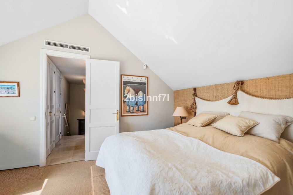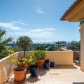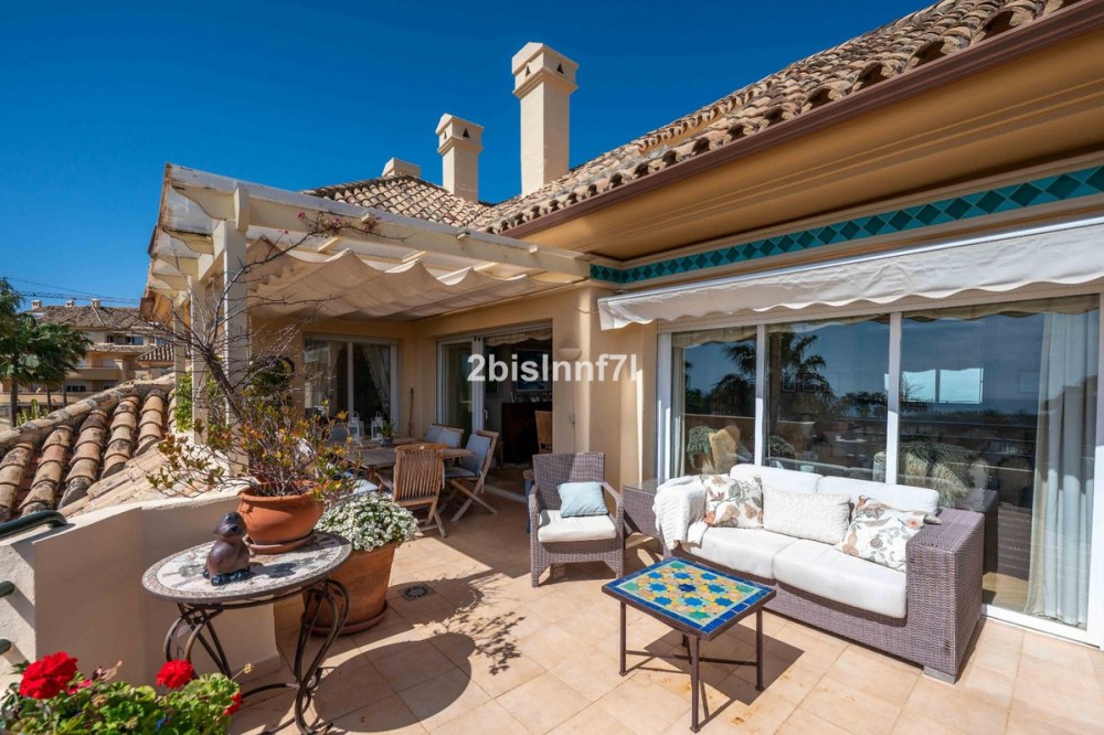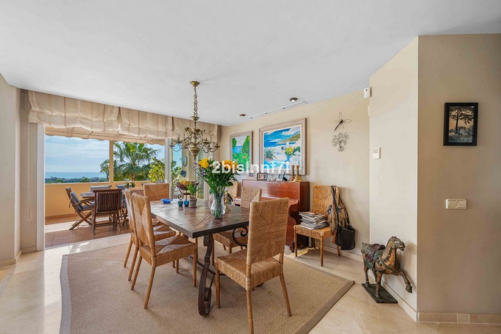 - Penthouse with Panoramic Views of the Mediterranean for Sale in Elviria Hills, Marbella Stunning penthouse with a unique frontline location, offering panoramic views over the landscaped gardens and the Mediterranean Sea, surrounded by palm trees and pine forest. The apartment features generous proportions, abundant natural light, and delivers a unique living experience in highly attractive surroundings with minimal overlooking. The property offers 147 m² of interior living space, complemented by a spacious 57 m² terrace with triple orientation (south, east, and west). This ensures sunshine throughout the day and creates multiple outdoor living areas, perfect for relaxing, entertaining guests, or simply enjoying the surrounding scenery at any time. The home features marble flooring throughout, A/C(heating and cooling), an underground parking space, and a storage room. The living room is both spacious and inviting, with a fireplace and large windows that flood the interior with natural light, along with direct access to the terrace. The result is a harmonious indoor-outdoor flow, enhanced by open views of the Mediterranean and the lush landscape. The kitchen is well-equipped and has direct access to a rear terrace, ideal for morning and evening use. On this level, the property also includes two comfortable bedrooms and two bathrooms, thoughtfully designed to ensure comfort and privacy. The upper floor is dedicated to the master suite, featuring a charming loft-style design, built-in wardrobes, and an en-suite bathroom. Elviria Hills is located in one of the most sought-after areas east of Marbella and offers a range of high-quality amenities, including a 9-hole golf course, tennis courts, gym, sauna, and a renowned on-site restaurant. The complex is known for its beautifully maintained surroundings and peaceful atmosphere. Just a short drive away, you will find some of the finest beaches in the area, along with beach clubs, restaurants, and essential services. Marbella town center, Puerto Banús, and Málaga Airport are all within easy reach.