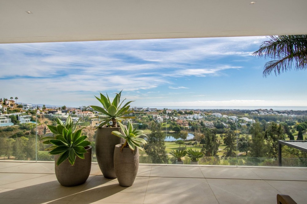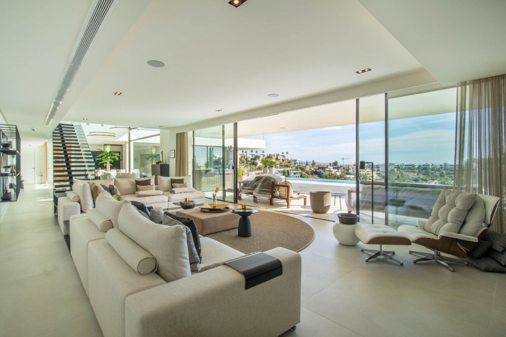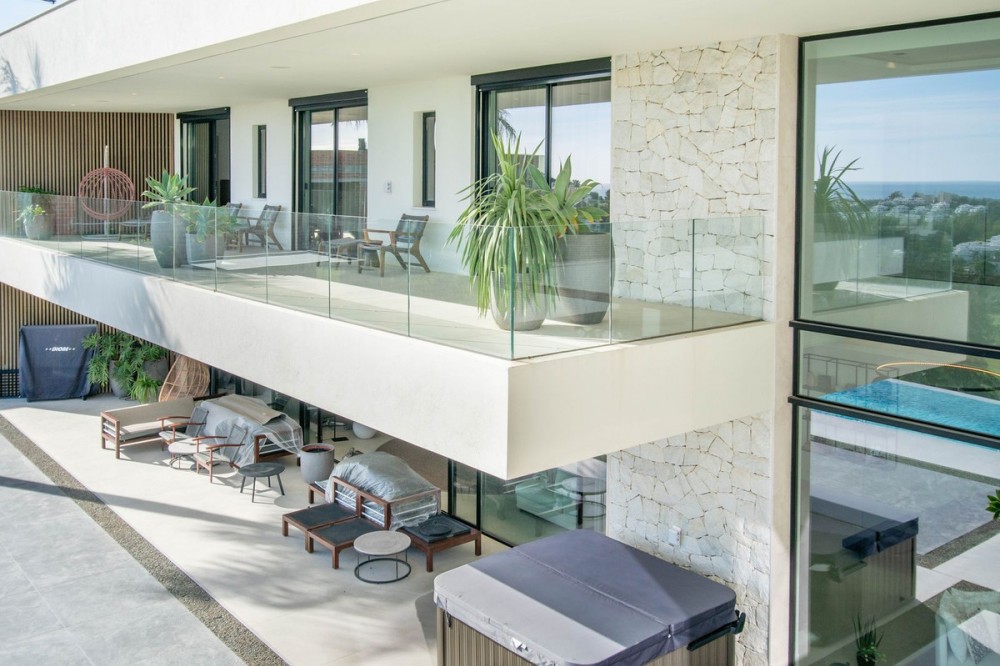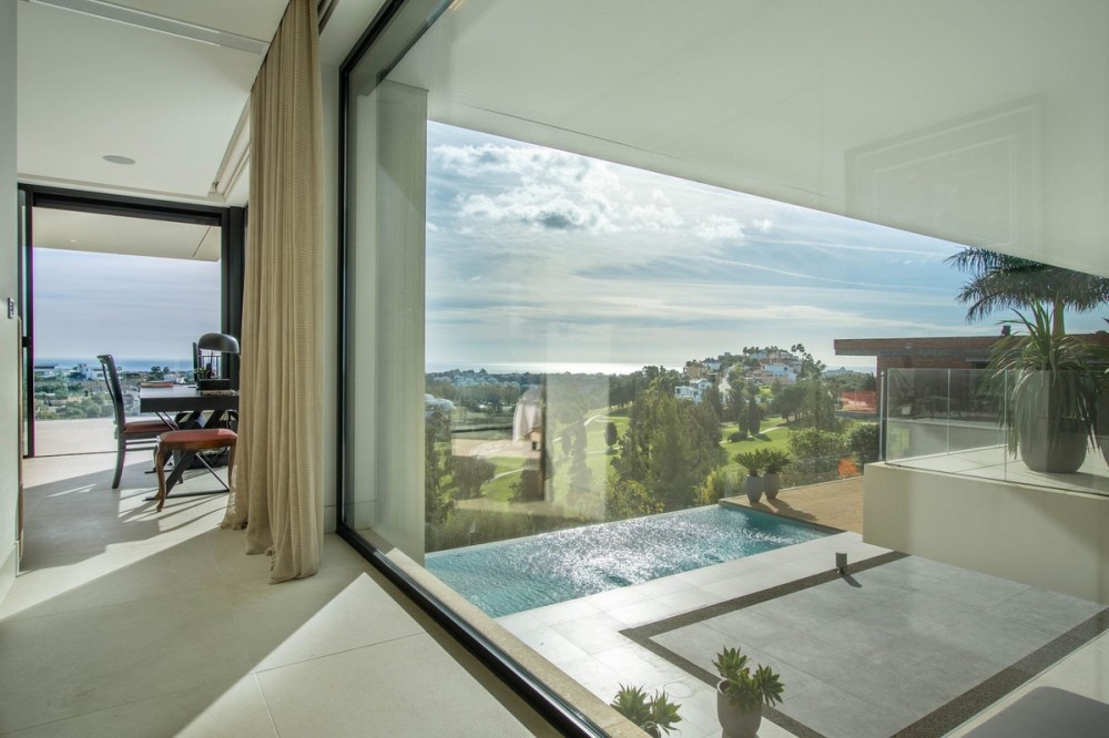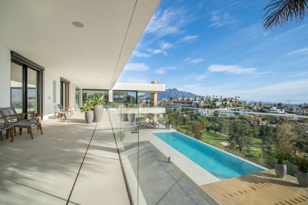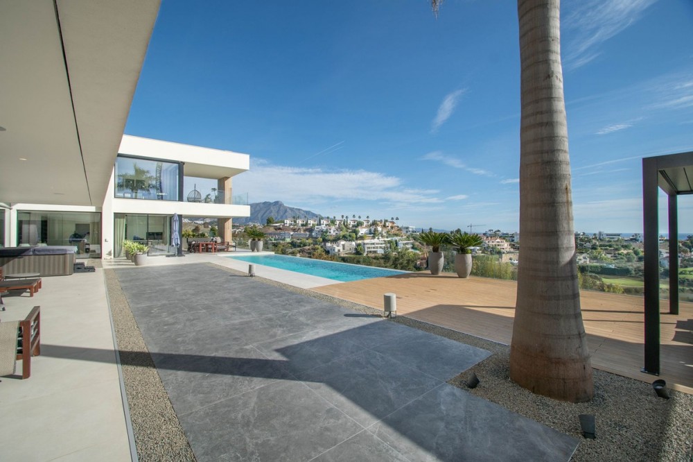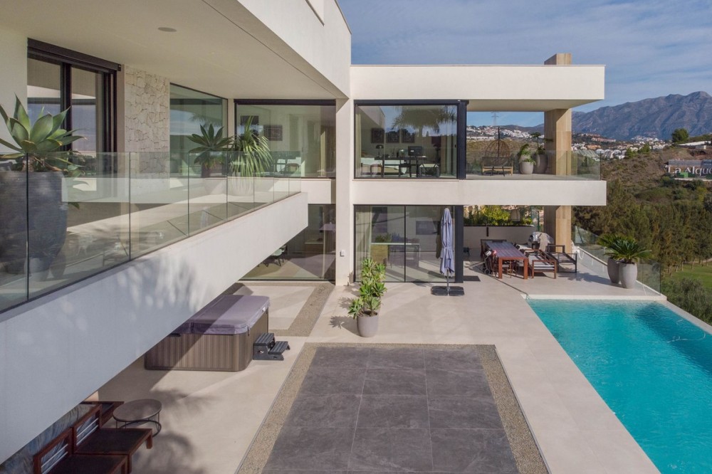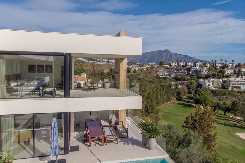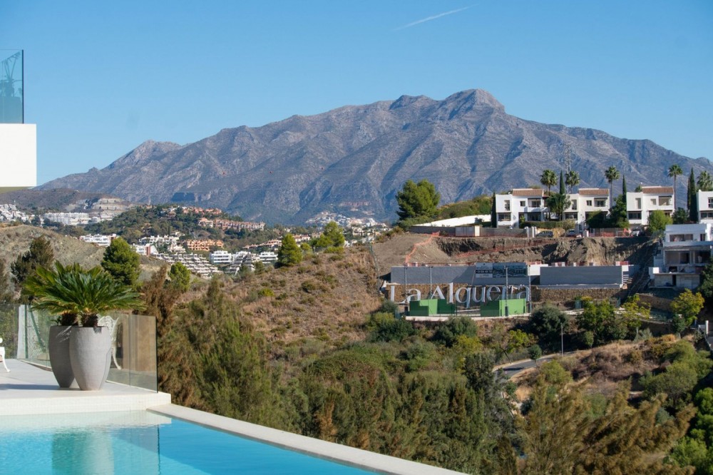 - Stunning contemporary villa with panoramic mountain, golf and sea views in La Alqueria, Benahavis This exclusive masterpiece, a designer villa by Carlos Lamas, houses a total of 5 bedrooms and 6 bathrooms, all of which have been completely designed with high-quality materials and equipped with the latest technologies. The impressive villa is located close to several golf courses, tennis & paddle courts, supermarkets, shops, restaurants, schools and the best beaches and beach clubs in the area. A short drive will bring you to Marbella, Puerto Banús, Benahavís, San Pedro de Alcántara and Estepona. The house consists of three floors, accessible via elevator or floating stairs, and has a beautiful, spacious double-height entrance hall. Large sliding windows integrated into the wall easily connect indoor and outdoor living. You can enjoy incredible panoramic sea views from almost anywhere in the villa. The spectacular basement is fully equipped, featuring a games area, walk-in bodega, bar, lounge area, spa, gym, utility room and proper cinema room. The property also has spacious covered and uncovered terraces with panoramic sea, mountain and golf views, an amazing infinity pool, jacuzzi, outdoor kitchen and barbecue.The main terrace has been totally transformed with new tiles and led lights that can be changed to any color.