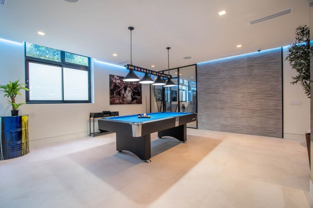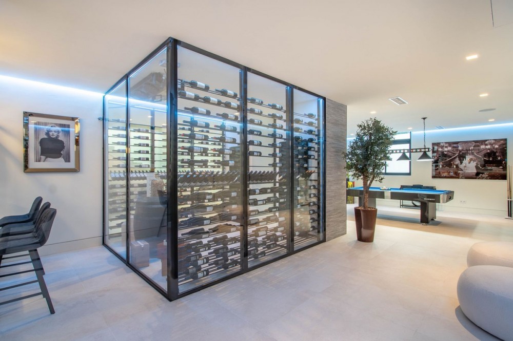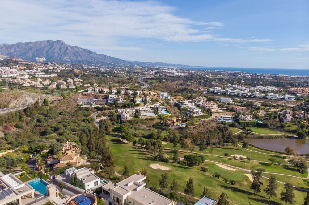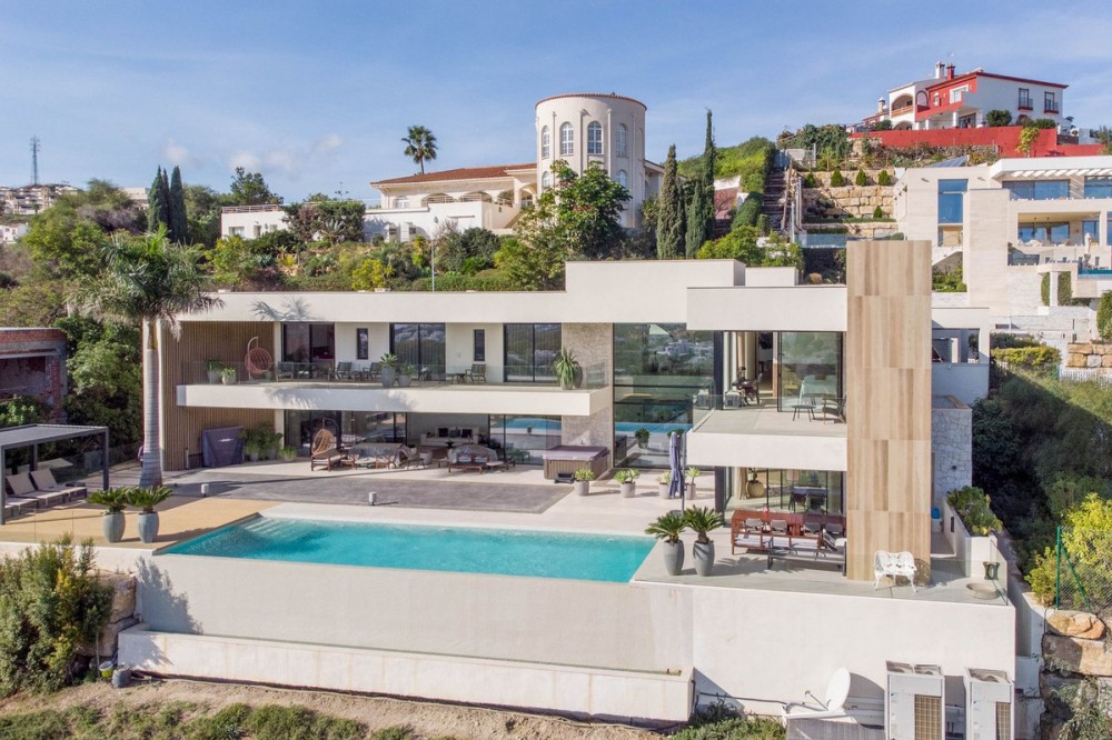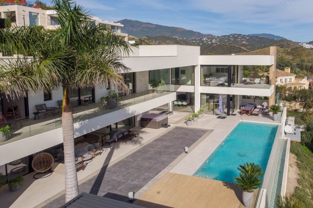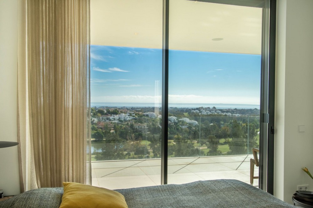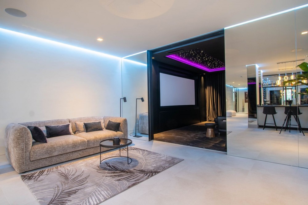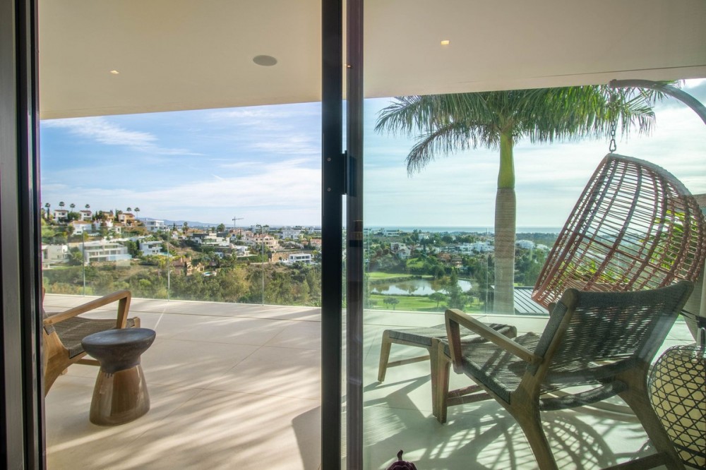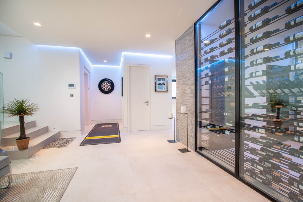 - Stunning contemporary villa with panoramic mountain, golf and sea views in La Alqueria, Benahavis This exclusive masterpiece, a designer villa by Carlos Lamas, houses a total of 5 bedrooms and 6 bathrooms, all of which have been completely designed with high-quality materials and equipped with the latest technologies. The impressive villa is located close to several golf courses, tennis & paddle courts, supermarkets, shops, restaurants, schools and the best beaches and beach clubs in the area. A short drive will bring you to Marbella, Puerto Banús, Benahavís, San Pedro de Alcántara and Estepona. The house consists of three floors, accessible via elevator or floating stairs, and has a beautiful, spacious double-height entrance hall. Large sliding windows integrated into the wall easily connect indoor and outdoor living. You can enjoy incredible panoramic sea views from almost anywhere in the villa. The spectacular basement is fully equipped, featuring a games area, walk-in bodega, bar, lounge area, spa, gym, utility room and proper cinema room. The property also has spacious covered and uncovered terraces with panoramic sea, mountain and golf views, an amazing infinity pool, jacuzzi, outdoor kitchen and barbecue.The main terrace has been totally transformed with new tiles and led lights that can be changed to any color.