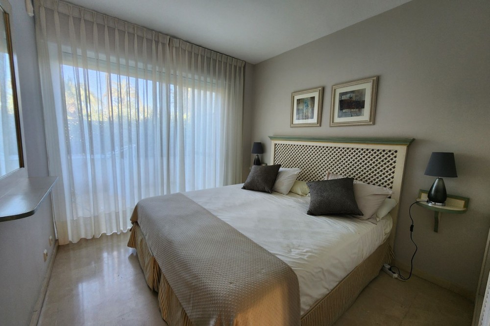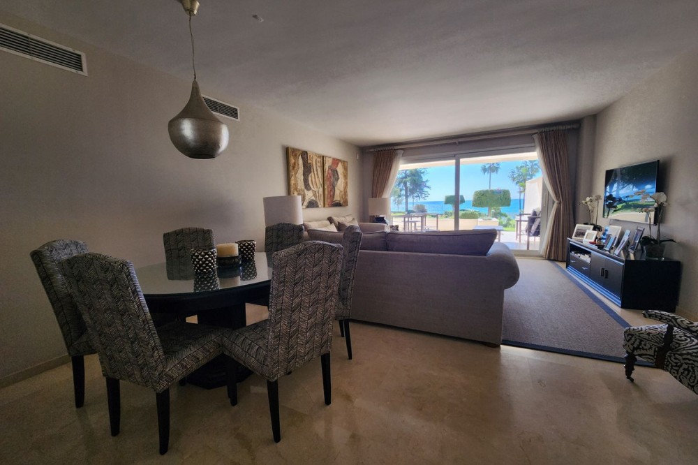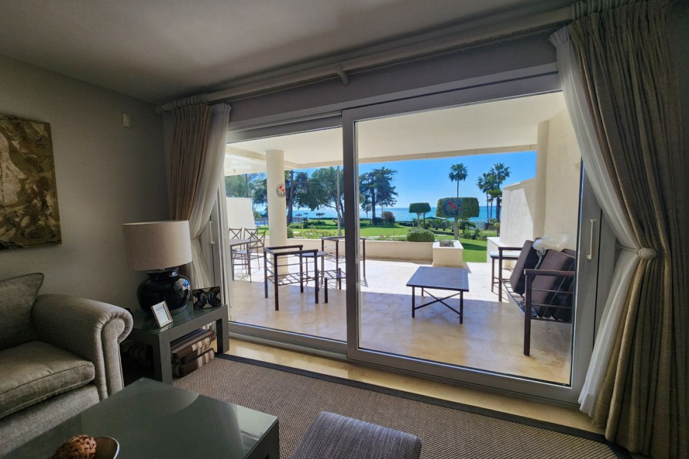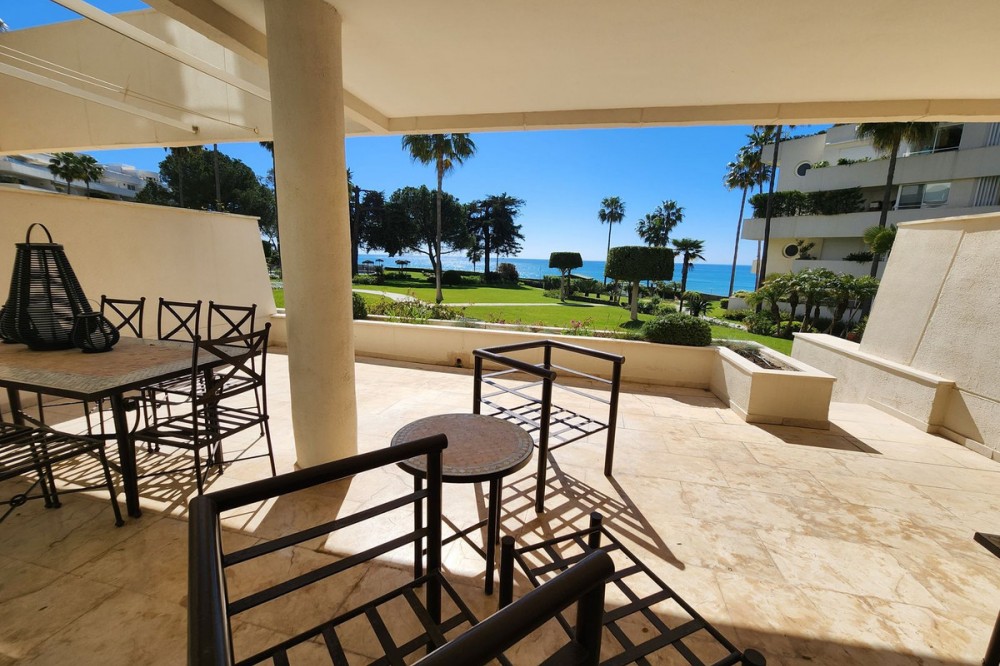 - Ground Floor Apartment, Estepona, Costa del Sol. 3 Bedrooms, 2 Bathrooms, Built 112 m², Terrace 61 m². Setting : Beachfront, Beachside, Close To Shops, Close To Sea, Close To Town, Close To Schools, Urbanisation, Front Line Beach Complex. Orientation : South. Condition : Excellent. Pool : Communal. Climate Control : Air Conditioning, Pre Installed A/C, Hot A/C, Cold A/C. Views : Sea, Garden, Pool. Features : Covered Terrace, Lift, Fitted Wardrobes, Private Terrace, Satellite TV, WiFi, Gym, Paddle Tennis, Tennis Court, Storage Room, Marble Flooring, Double Glazing, 24 Hour Reception. Furniture : Optional. Kitchen : Fully Fitted. Garden : Communal. Security : Gated Complex, 24 Hour Security. Parking : Underground, Street. Utilities : Electricity, Drinkable Water, Telephone. Category : Beachfront, Luxury, Resale.
