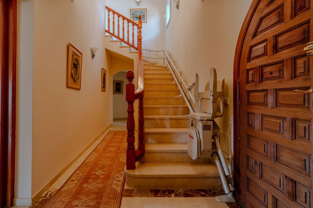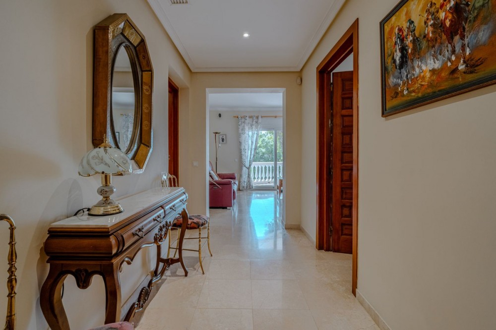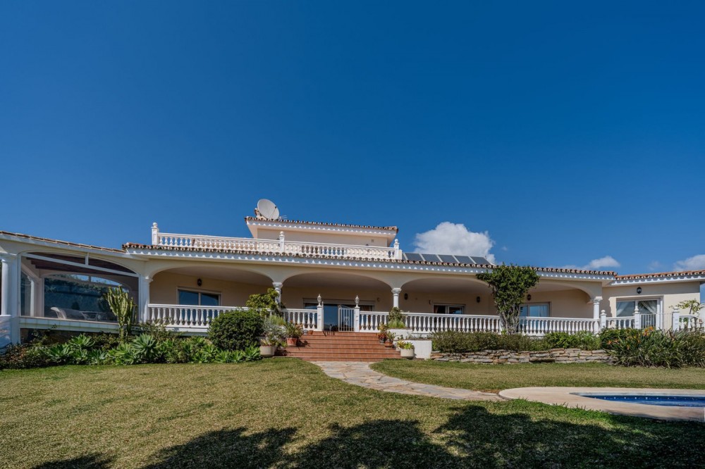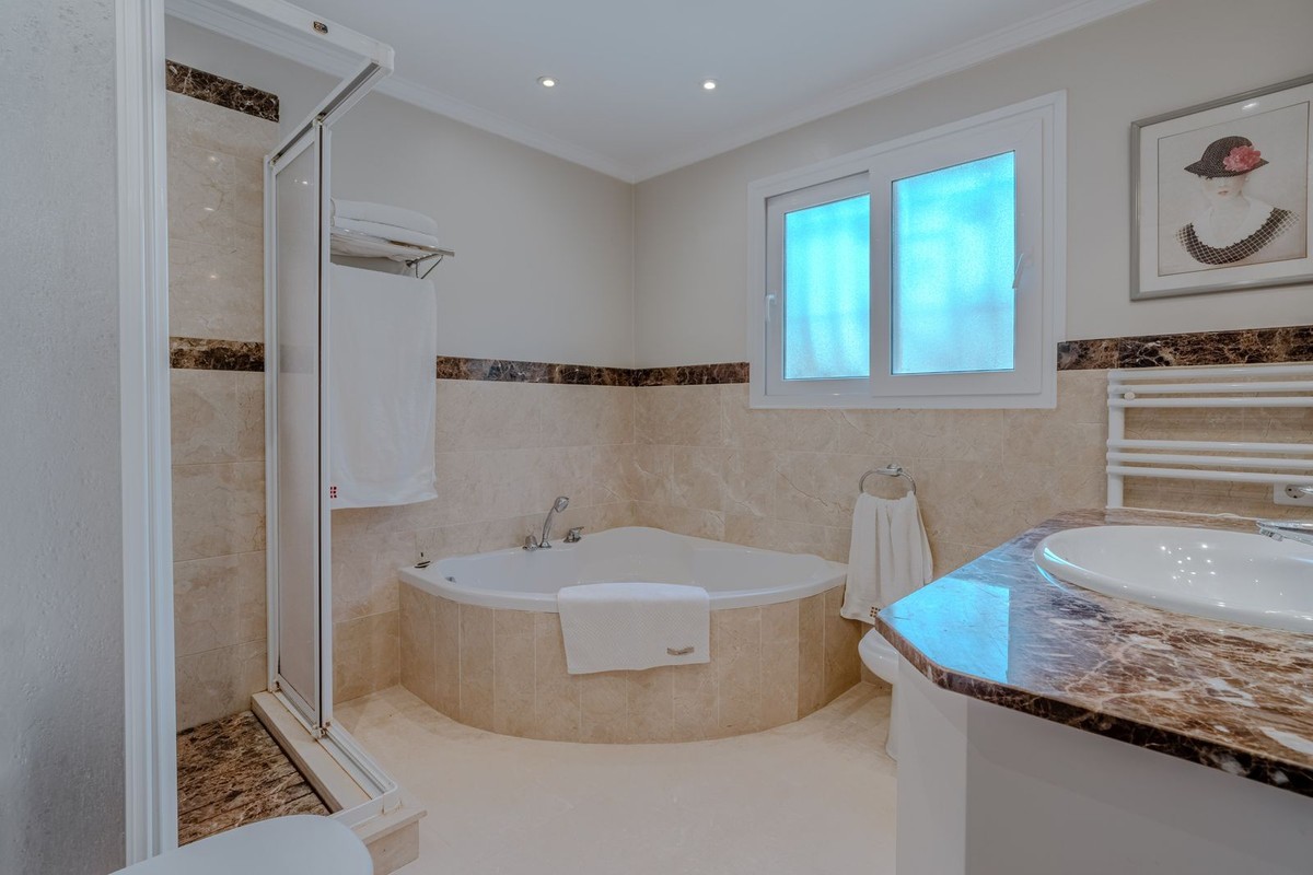 - Nestled in the heart of El Paraíso Medio, this beautiful five-bedroom, four-bathroom detached villa offers a perfect blend of timeless Andalusian charm and modern comfort, all within easy walking distance of local amenities. Designed in the classic architectural style that defines the area, the villa enjoys an elevated դիրction with breathtaking panoramic coastal views—best appreciated from the impressive first-floor master suite and its private wraparound terrace. The ground floor is exceptionally spacious and thoughtfully arranged, centred around a bright open-plan living and dining area bathed in natural light and enhanced by a welcoming fireplace. This elegant space flows seamlessly onto an expansive covered terrace—partially enclosed with glass curtains—allowing for effortless year-round indoor-outdoor living. An additional, more informal family lounge or snug sits adjacent to the main reception area, providing further versatility. The well-appointed kitchen features hardwood cabinetry, a central island, and a charming breakfast area, complemented by a separate laundry room and a practical boot room with direct access to the driveway. Accommodation on this level is both generous and flexible. A spacious guest suite—ideal as an alternative master bedroom—is accompanied by a further en-suite bedroom and two additional guest bedrooms sharing a well-appointed family bathroom. A guest cloakroom and a versatile office complete this floor. Notably, three of the guest bedrooms and the office are located within a separate wing with its own private entrance, offering excellent flexibility—perfect for hosting guests in complete independence or for running a home business. Upstairs, the expansive master suite provides a true retreat, featuring a dressing room, a luxurious en-suite bathroom, a large linen cupboard, and direct access to a private wraparound terrace boasting spectacular sea and coastal views. The exterior is equally impressive, with beautifully landscaped gardens, mature trees, and a private freeform swimming pool. An extensive driveway provides ample parking for multiple vehicles, while a double garage offers further potential, including the possibility of creating a first-floor guest apartment. An additional single garage is ideal for a golf buggy or garden storage. Combining sustainability with comfort, the villa benefits from excellent energy efficiency, with solar panels, aero thermal heating system and a water storage system installed by the current owners. While there is air conditioning and underfloor heating the desirable south-facing orientation ensures warmth and natural light year-round. A truly exceptional home in one of the Costa del Sol’s most sought-after residential areas.
